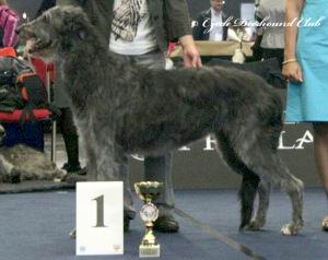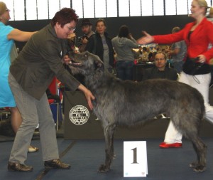 De vrijdagochtend vertrekken we op tijd richting de hallen maar op twee kilometer afstand belanden we in de file. De tijd tikt voorbij maar voortgang maken we nagenoeg niet. Langzaam slaat de paniek toe, om 10.00 uur vangt Dr.Zilli Orietta uit Italië met de Deerhounds aan en het is al half tien geweest! Tijdens het af en toe twee meter naar voren rijden, haal ik mijn tas op wielen met showspullen uit een zijklep van de camper en gooi die in de camper om vervolgens dat er uit te halen dat ik nodig heb om met Calhoun en Cheytah binnen te komen en te kunnen showen. Intussen wordt Sonja gebeld door Eva Petzold die een zeer verontrustend telefoontje van Monika Rhein kreeg waarin deze mede deelde dat aan de andere kant van de weg ongeveer 3 kilometer voor de afrit naar de hallen een vrachtwagen was omgevallen en dat de weg totaal versperd was. Monika staat hier vlak voor en kan geen kant op! Natuurlijk zijn er vele exposanten door dit ongeval zwaar gedupeerd, ook Monika en de Russin Lemyaskina met twee gemelde Deerhounds en zes Ierse Wolfshonden is niet op tijd in de hal. Het zou je maar gebeuren!!! Vreselijk!!! Ik denk dat ik uit de auto was gesprongen en gewoon was gaan lopen, de auto achterlatend. Om tien minuten voor tien zijn wij onderaan de afrit en zien totaal verbijsterd dat de politie vignetten staat te controleren en mensen uitgebreid de weg staat te wijzen en diegene weg te sturen die geen geldige parkeerkaart hebben. Dit kost allemaal ontzettend veel tijd en ik denk dat die politiemensen totaal geen idee hebben wat een enorme stress dit bij de exposanten veroorzaakt. Ook zo iets; bij aanmelden van de hounds was niets te vinden over parkeerkaarten, pas ettelijke maanden later kreeg iedereen een mailtje met de verwijzing naar het aanvragen van een parkeerkaart, velen hebben dit mailtje over het hoofd gezien met alle gevolgen van dien. Voor het parkeren werd het schandalige bedrag van 40 euro gevraagd! Enfin, aangekomen op het tentoonstellingsterrein is geen bord te zien waarop staat waar hal 10 is. Sonja stopt langs de weg en ik spring met Calhoun en Cheytah uit de camper en loop richting de grootste drukte, onderweg aan iemand met een embleempje op zijn shirt vragend waar hal 10 is. Op zijn vage, onverstaanbare antwoord loop ik maar gewoon door tot de hal waar de meeste mensen bij staan. Nog zie ik geen “Hal 10” maar gelukkig wel windhonden. Gelukkig geen dierenartscontrole zodat ik nagenoeg gelijk door kan lopen naar de ring die vlak bij is. Het is inmiddels 10.00 uur maar ik denk dat de organisatie van het ongeval gehoord heeft want voor half elf werd er niet aangevangen met keuren. Voor velen nog veel te vroeg maar je kunt natuurlijk ook niet blijven wachten tot alle exposanten binnen zijn. Poei, poei, wat een stress. Na een kwartier komt Sonja met Coney en de rest van de spullen en stoom uit haar oren naar ons toe. Ze vertelde dat ze tot drie keer toe heeft moeten omparkeren omdat de ene parkeerwachter haar camper te lang vond en de ander meende dat ze bij de andere campers moest gaan staan. Door alle toestanden was ze de extra kleedjes en een stoel vergeten en kon ze nog een keer lopen. Toen de keuringen begonnen waren we gelukkig weer een beetje tot rust gekomen en konden genieten van de manier waarop mevrouw Zilli keurde; uiterst vriendelijk naar mens en hound. Er waren in totaal 33 Deerhounds gemeld, 14 reuen en 19 teven, 3 reuen en 2 teven absent. De Jeugdklas reuen werd gewonnen door Fritzens Crown (zijn gemelde broertje was niet aanwezig) van Björn Fritz. De Russische Tussenklas hound was niet aanwezig. De Openklas (3) werd gewonnen door Cedric Eimhir Irater van Dagmar Tylsova uit Tsjechië. Calhoun stond samen met Assing Irater Irsias van Hana en Eva Vobornikova, die we alle drie kennen van de coursing, in de Gebruikshondenklas. Dit won Calhoun. Hierna kwam de Kampioensklas (6-1 absent), een moeilijke klas doordat iedere hound toch wel