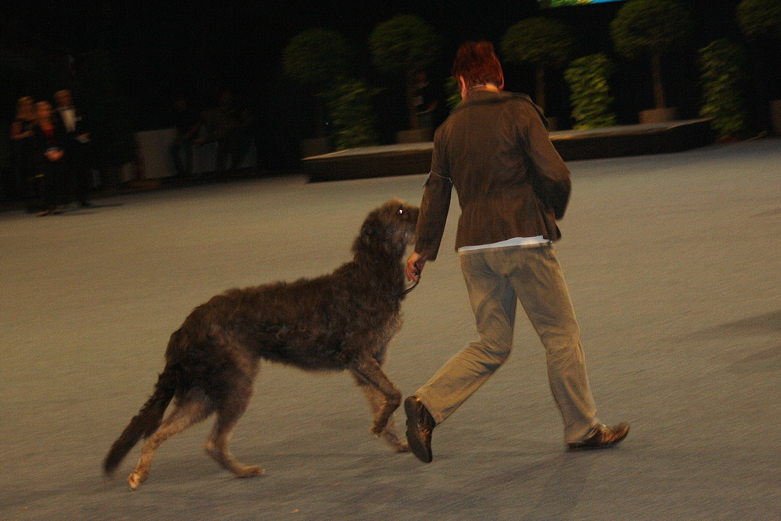 als één van de eerste groepen in de erering verschijnen. Bij de ingang van de voorkeurring was het een gigantische chaos. Ontzettend veel exposanten stonden daar al te wachten met hun honden en al hun hebben en houwen. Zowel honden als mensen vlogen elkaar in de haren, wat een toestand! Aanvankelijk was er maar één persoontje dat uit deze chaos de juiste honden op tijd in de voorkeurring probeerde te krijgen maar gelukkig kwam er hulp van een exposante met een zeer luide stem die de hele mensenmassa bereikte. Wat was ik blij toen ik eenmaal met Coney in de voorkeurring stond, hier hoefde ik haar niet meer te beschermen tegen opdringerige reuen en snauwende teven. Na een rondje erering, waarvan Coney duidelijk genoot, mochten we er aan de andere kant weer uit. Groep 10 was natuurlijk weer als laatste aan de beurt. Toen ik met Calhoun bij de voorkeurring kwam was het er gelukkig een stuk rustiger. De keurmeester voor groep 10 was Rafael de Santiago. Hij bekeek de hounds nauwkeurig in de voorkeurring maar hun gangwerk konden ze daar niet goed tonen. Het was jammer dat de Greyhound achter mij stond want in de erering liep de eigenaresse, een zeer bekende exposante/fokster/keurmeester zo dicht op Calhoun dat hij iedere keer omkeek en hierdoor uit balans liep. Maar ach, hij had toch geen kans, de prachtige Zweedse Saluki; Shiraz California Dreamin’ belandde op de eerste plaats maar het bevreemde mij dat de koehakkige met flaporen getooide Ierse Wolfshond wel werd geselecteerd.