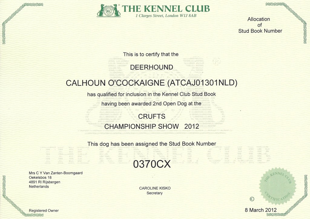 Afgelopen week kreeg ik een certificaat toegestuurd van The Kennel Club in Engeland met een begeleidend schrijven dat ze Calhoun hebben opgenomen in hun Studbook! Dit naar aanleiding van zijn behaalde resultaat op Crufts. Ik denk dat het de eerste Nederlandse Deerhound in Nederlands eigendom is die dit bereikt. Calhoun’s broer, Cscarf, staat er natuurlijk ook in maar die is in Engels bezit.