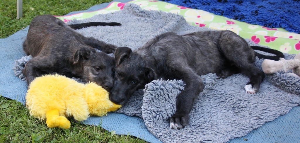 Op 2 september ga ik met Brandir naar de Puppydag van KC Waalwijk. Er zijn meer dan 100 pups aangemeld maar er kunnen er maar 100 deelnemen. Gelukkig was ik nog op tijd met aanmelden want meestal zit zoiets snel vol. Het is een zeer leerzame dag voor een pup in een vrij stressvrije omgeving. Er worden verschillende rondes gehouden waarin 5 tot 6 pupjes worden beoordeeld door 2 keurmeesters. De pups worden geplaatst en afhankelijk van welke ronde gaan de eerste 4 of 5 door naar de volgende ronde. De pups komen dus onder verschillende keurmeesters uit en tussen de rondes is voldoende tijd om te relaxen; oftewel een puppenslaapje te doen. En een Deerhoundpup kan dat zééér goed! Brandir vindt het allemaal prachtig en kijkt zijn ogen uit. Alle pupjes die in zijn buurt komen worden vrolijk door hem begroet en met de Italianen pupjes van Sandra en