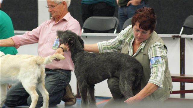 Zaterdag was de Jahresausstellung van de Ierse Wolfshonden in Hannover. Sonja zou hier in de ring werken en we hadden lang geleden al besloten dat ik dan Cheytah en Calhoun zou showen. Helaas was Cheytah er niet meer bij en dat deed toch wel weer even pijn. Er waren 10 Deerhounds ingeschreven, 5 reuen waarvan 1 absent en 5 teven waarvan 2 absent. Calhoun werd eerst beste reu (vanuit de Gebruikshondenklas) en vervolgens Beste van het Ras. Bij de erekeuringen werd hij wel bij de laatste drie geselecteerd maar uiteindelijk won, zoals het eigenlijk hoort als het een goede rasvertegenwoordiger is, de Ierse Wolfshond.