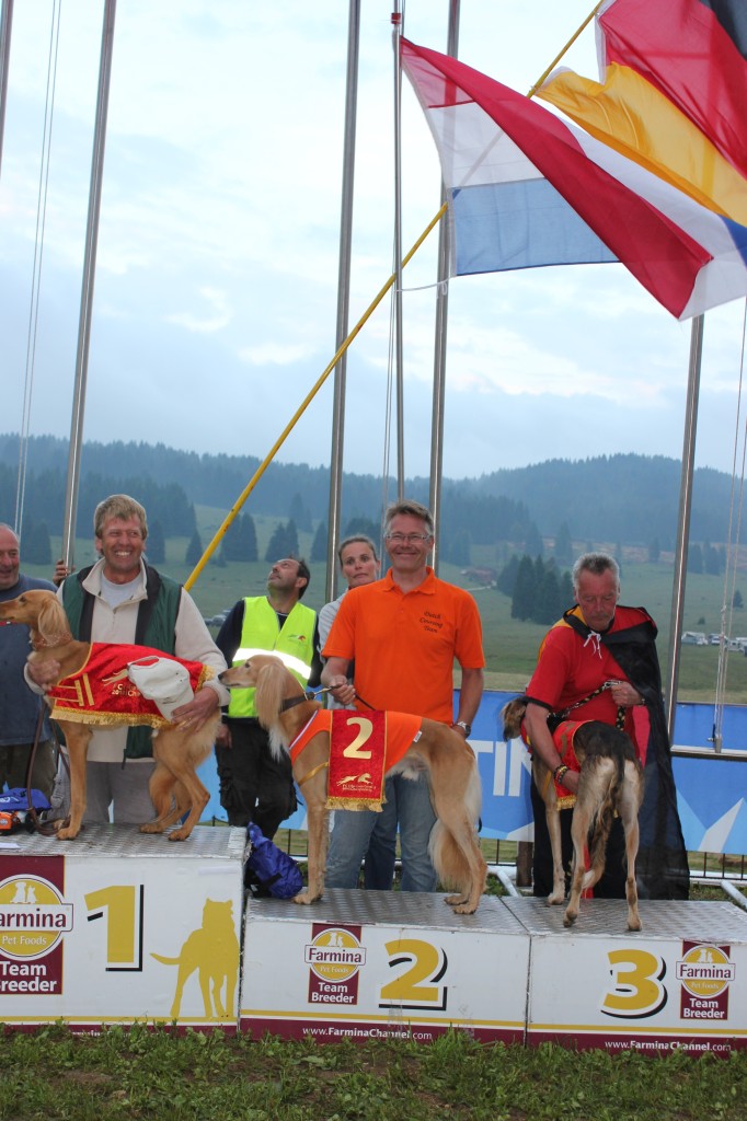 Ook bij de Saluki reuen en teven was het na de eerste omloop spannend. Zij hadden als eerste course op de renbaan gelopen. Darayavanush van de Bruinbrand stond op de eerste plaats en Tizpa Porgouhar Isfandiyar ook van Chris en Henriëtte stond op een gedeelde derde plaats. Er liepen vijfenvijftig Saluki reuen en negenenveertig teven. Bij de meiden stond Crazy van de Bruinbrand van Gert-Jan en Jacqueline op een gedeelde tweede plaats! Maar op het technische parcours bleek alles te veranderen. Darayavanush belandde op de zestiende plaats en Tizpa klom op tot de tweede plaats! Crazy liep niet denderend en belandde helaas op een twaalfde plaats. De prijsuitreiking werd ergens anders gehouden dan de opening. Spontaan ontstond het feestje van de rond rennende vlaggen maar toen de prijsuitreiking begon, bleek dat de mensen geen afstand konden houden tot het podium waardoor niemand meer iets kon zien. Ook niet goed natuurlijk.
