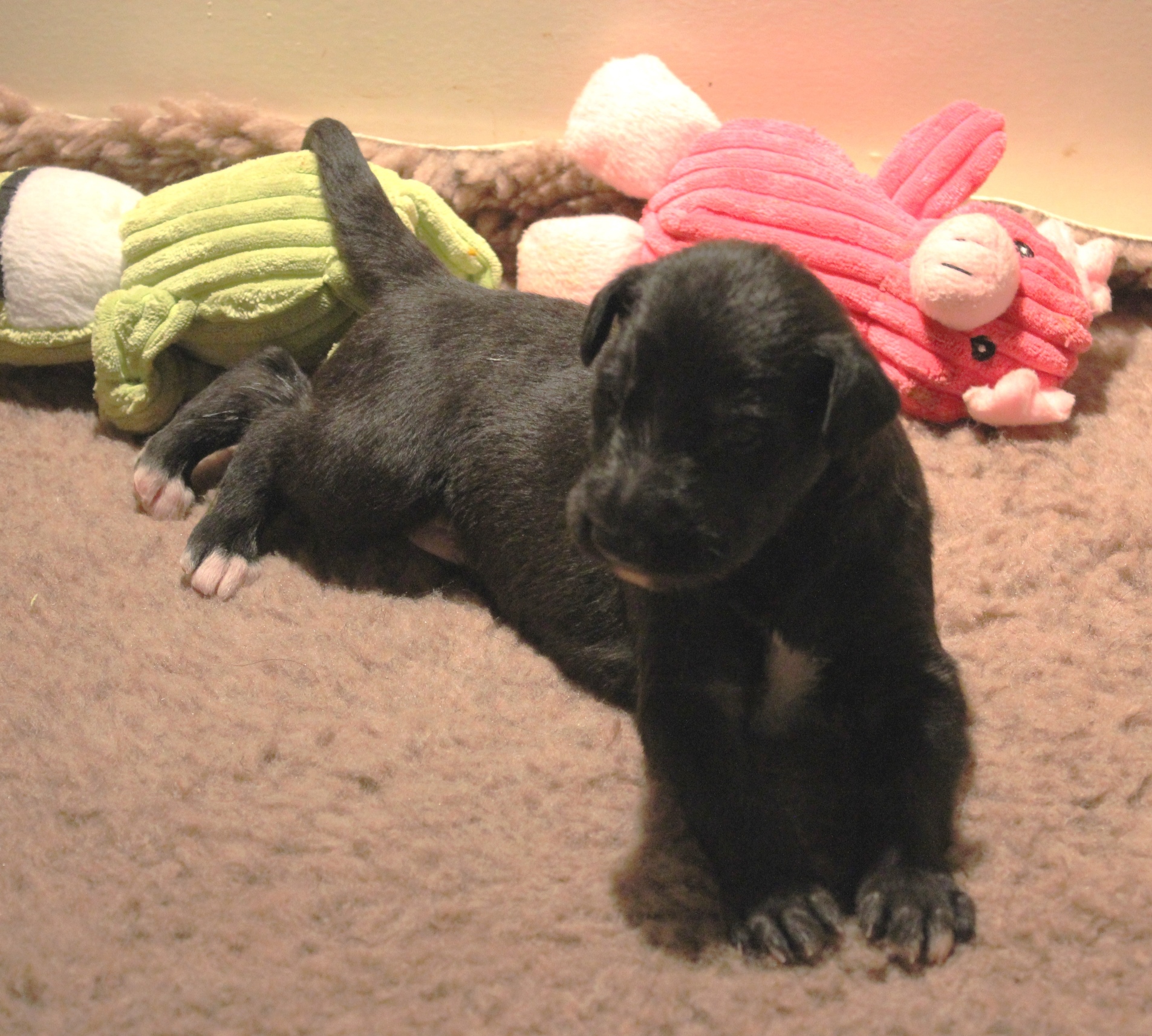 Donderdagavond zijn we even bij de pupjes wezen kijken. Wat groeien die hard! Ze stapten al zelfverzekerd door de kist en toonden speelgedrag. De reu, Chidish, heeft al een echte reuenkop en Cytaugh en Aislinn, de meiden, zijn echt vrouwelijk. Qua bouw zien ze er ook zeer veel belovend uit.