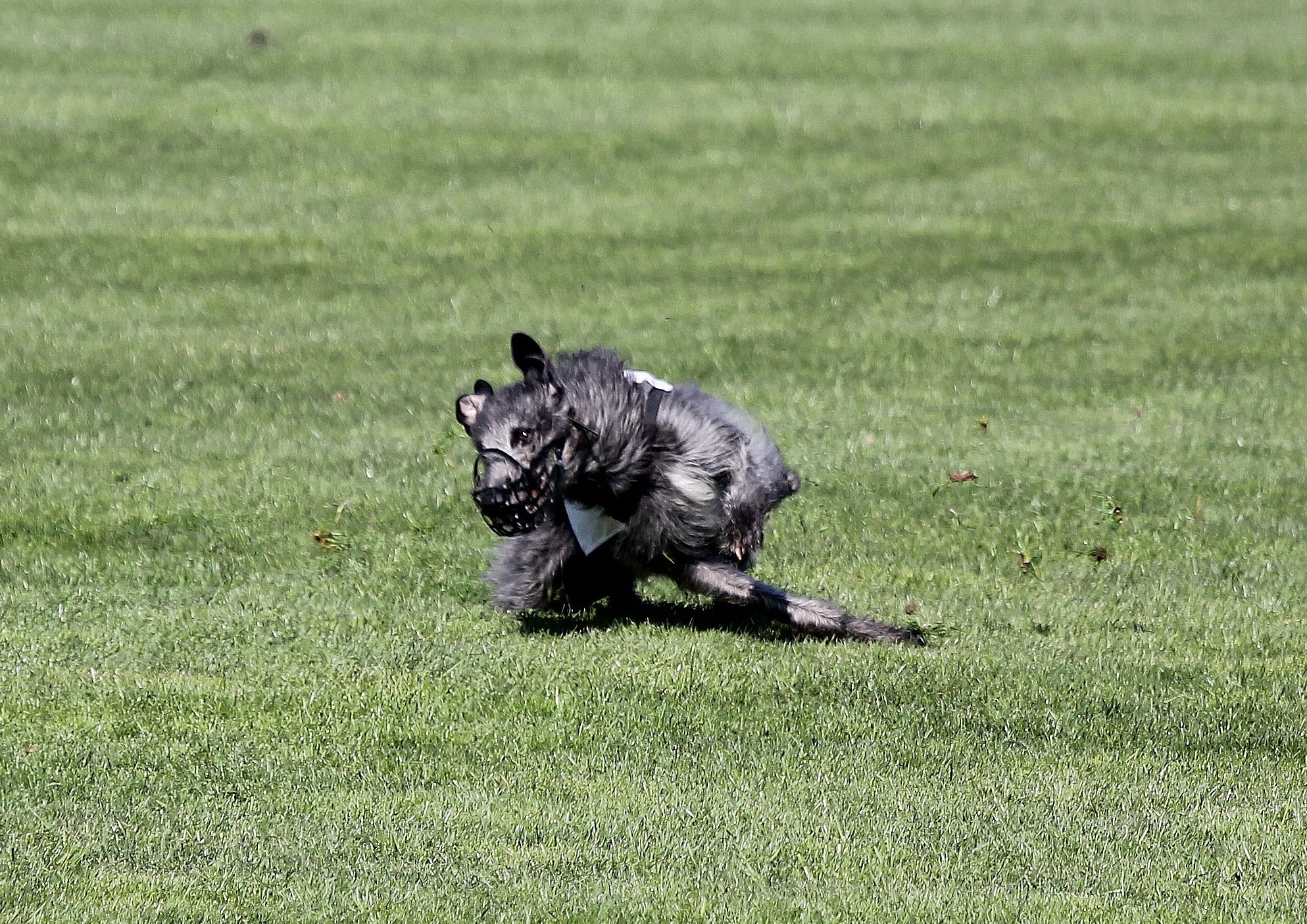 Brandir moest voor het eerst met een andere hond lopen, Islay’s Jock. Zijn licentielopen heeft hij toentertijd met Picaro gelopen, die kende hij enigszins maar dit vreemde ding…..?! Hij keek opzij, zijn oren gingen omhoog en vervolgens vloeide alle spanning uit zijn lijf. Jock vloog er vandoor en Brandir bleef staan. Met zijn ogen volgde hij het haas maar zijn poten deden niets. Jammer, dan maar niet. De tweede reuen course bestond uit Islay’s Kurt Cobain en Islay’s Janitor. Bij de opvang ging het niet helemaal zoals het hoort maar de jury stond halverwege het veld en zag het niet.