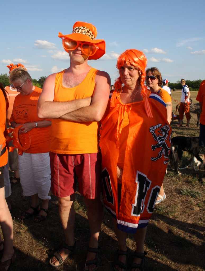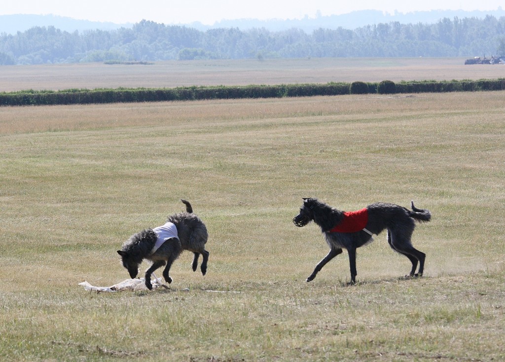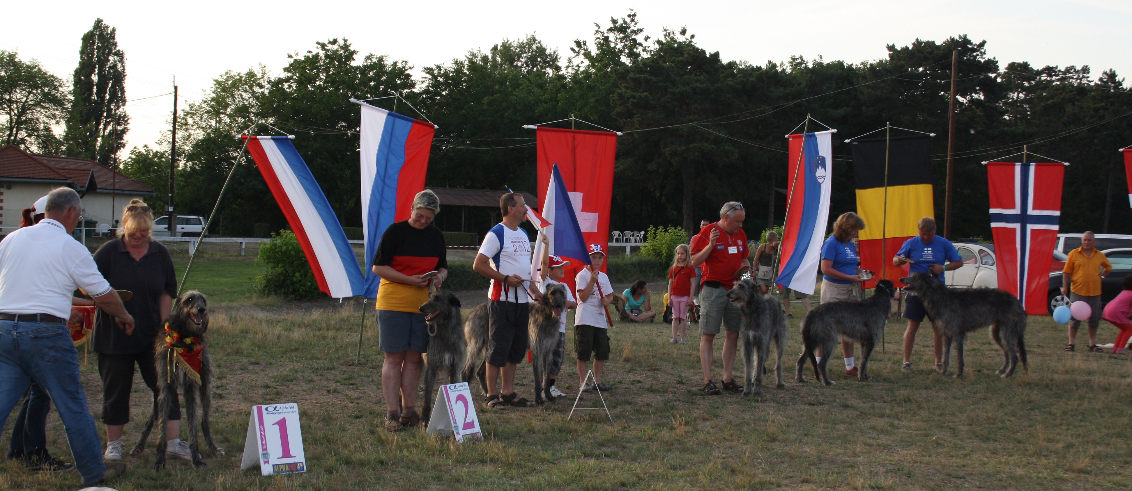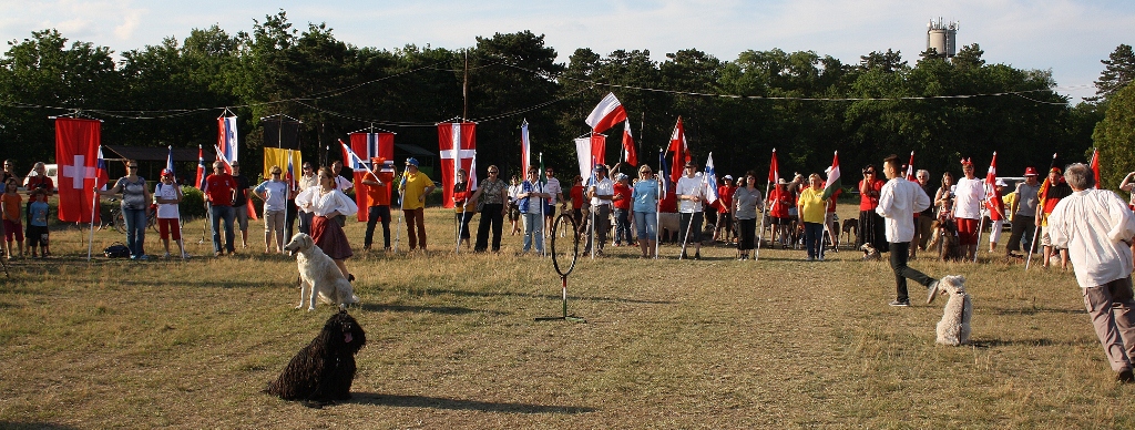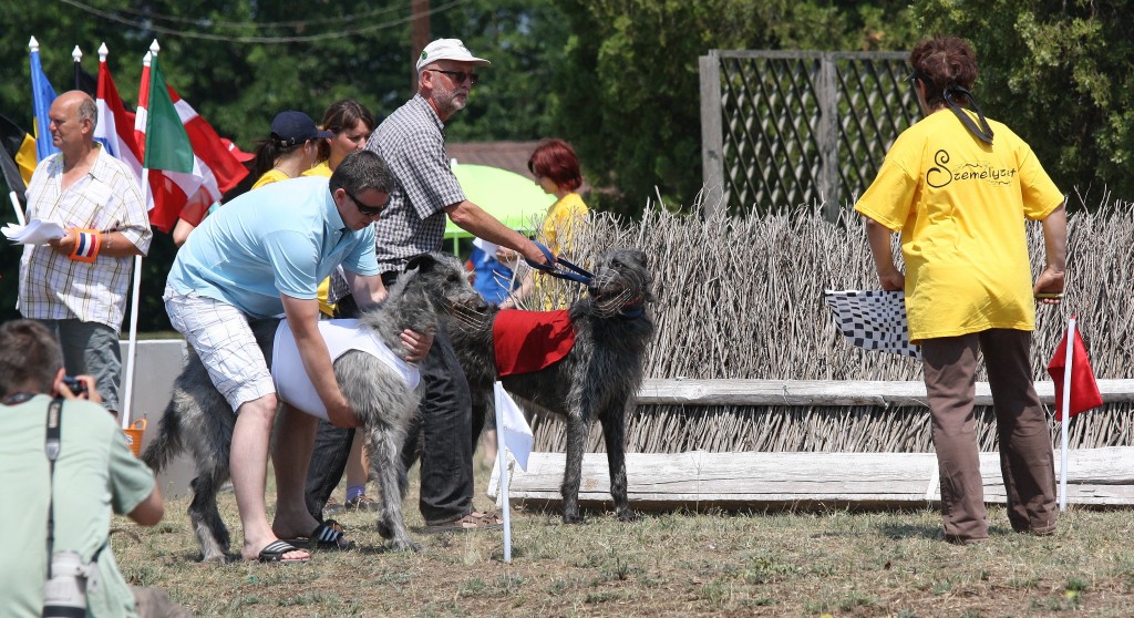 Donderdagmiddag is de dierenartscontrole voor de hounds die op vrijdag lopen. Het is snikheet en we wachten tot de rij minimaal is. De rij bij de dierenarts is snel weg maar pas hierna wordt de identiteit gecontroleerd en dit levert nogal problemen op. Er is maar 1 chipreader en deze is niet zo nauwkeurig zodat het soms erg lang duurt voordat ze de chip gevonden hebben. Ook vlak voor ons wordt een Barsoi van voor tot achter geread maar de chip is niet te vinden, wij zijn intussen maar met Calhoun en Cheytah onder de partytent in de schaduw gaan staan. Na een dikke 10 minuten wordt de Barsoi terzijde gezet en kunnen wij verder. Om 7 uur is de officiële opening, deze wordt gehouden op een terreintje een kleine kilometer verderop. Waarom niet bij de cateringtenten die vlak naast de “camping” staan? De geluidsinstallatie was niet toereikend, men moest zich inspannen om iets van de woorden van Dr. Levente Miklos te verstaan maar gelukkig werden er geen lange speeches gehouden. Wel leuk was de presentatie/demonstratie van drie Hongaarse hondenrassen; twee Kuvaszen, een Pumi en een Puli. Met z’n vieren deden ze een gehoorzaamheid demonstratie en afzonderlijk deden de Kuvaszen verschillende kunstjes en geh