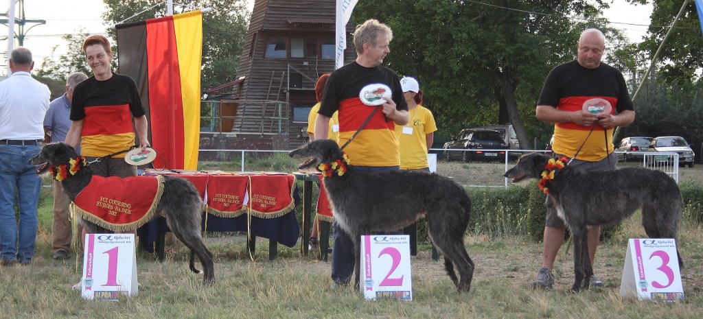 Bij de teven won Islay’s Hollyhook, tweede werd Islay’s Fran Fine en derde Islay’s Hyra, alle drie van Ira & Joachim Johannsen uit Duitsland, vierde werd Chabibi’s Nice van Ulla Schwarze (D), vijfde Beria of Redbrook van May-Britt Jörder & Joachim Faenger (D) en zesde was Pitlochry’s Grand Cru. Het bevreemde ons zeer dat deze laatste geplaatst is daar zij met een gigantische dikke teen, waarmee ze geen stap meer wilde verzetten vanwege de enorme pijn, van het veld kwam. Zij had natuurlijk afgemeld moeten worden bij het secretariaat maar dit was dus duidelijk niet gebeurd. Was de eigenaar van plan geweest om haar ’s middags gewoon weer te laten lopen?! Enfin, Calhoun eindigde dus met een “afwijzing voor de dag “ en Cheytah als één na laatste. Na enige twijfel besloten we om ze toch maar niet tot worst te vermalen maar we hebben ze er wel stevig mee gedreigd!