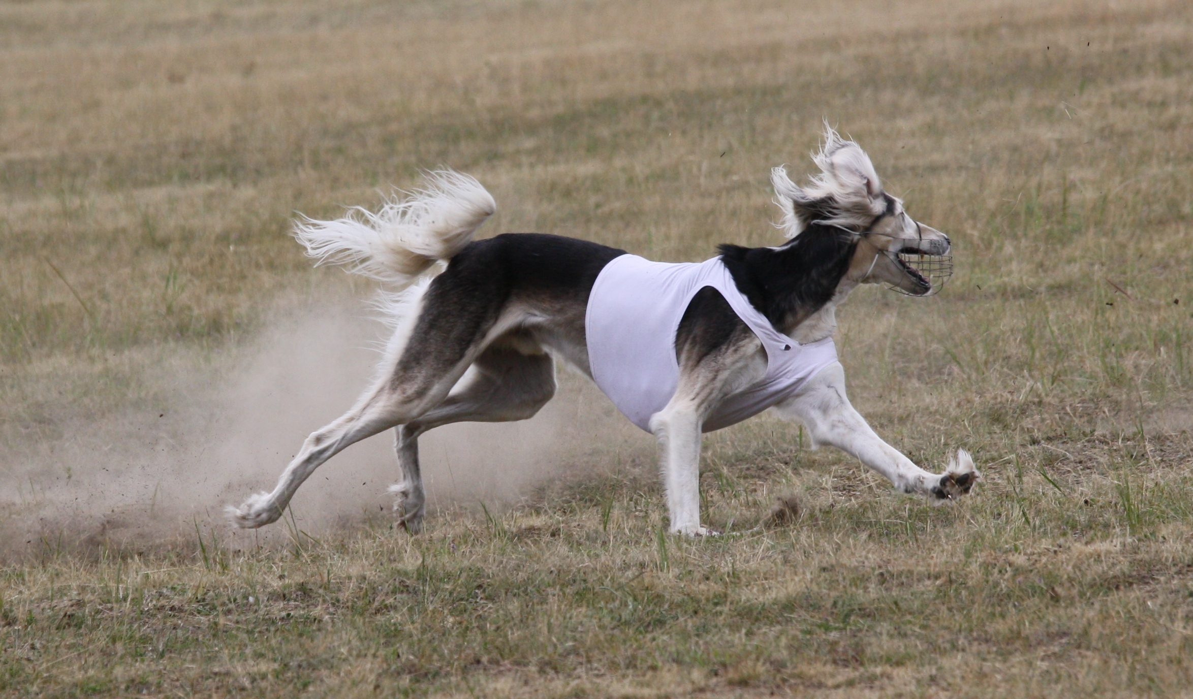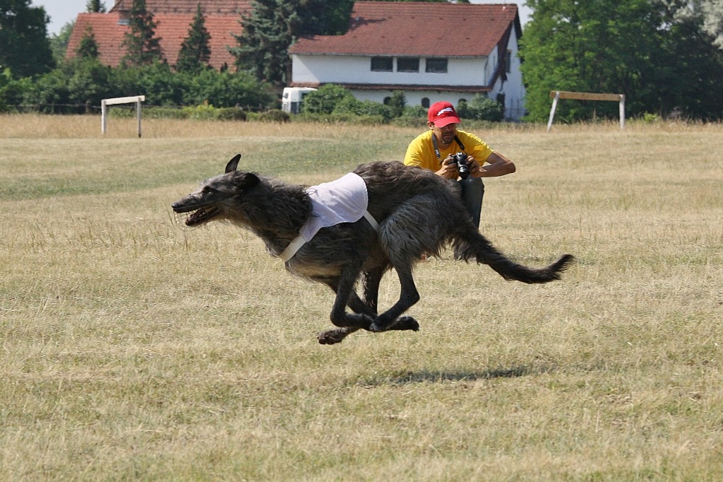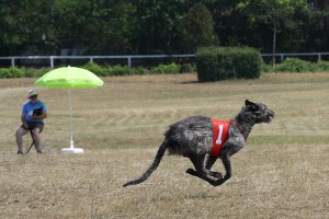 amen de Deerhounds dichter bij elkaar te liggen en liep onze planning qua voeren aardig in het honderd. Ik heb toen maar snel wat in elkaar geflanst voor de niet-lopers en Cheytah en Calhoun een pannenkoek gegeven. Cheytah was in de vierde course ingedeeld met Chabibi’s Nice van Ulla Schwarze (D). Dat is een behoorlijk snelle hound en aangezien Cheytah nog steeds knap schijndrachtig was, verwachtte we er ook niet veel van. En dat klopte, ze liep niet lekker. Calhoun moest tegen twaalven aan de bak, de temperatuur was aardig aan het oplopen dus ik maakte hem maar goed nat. Intussen probeerde ik Simon te bereiken, hij was op het