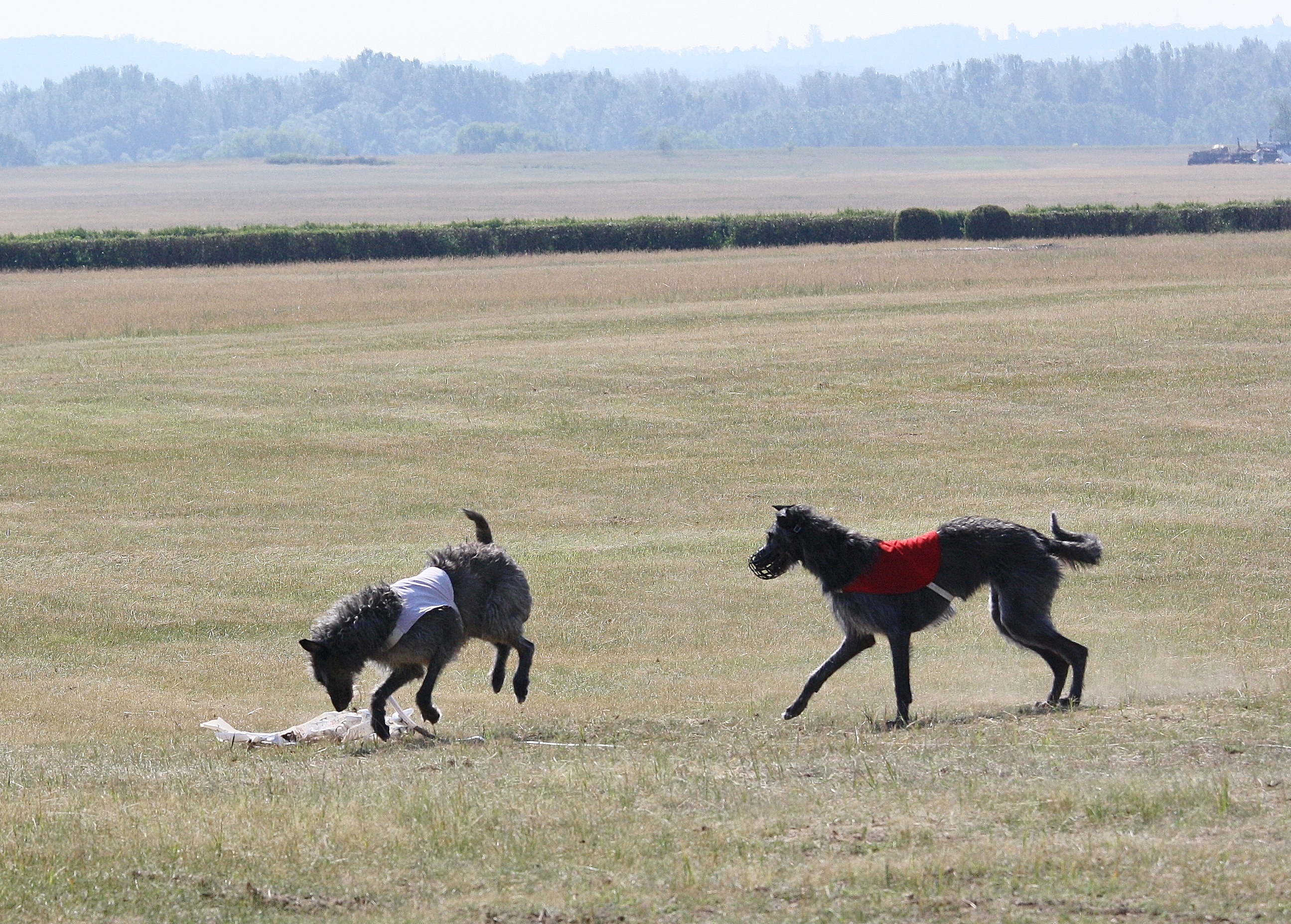 Enfin, in de loop van de dag liep de temperatuur op tot over de 50 graden Celsius in de zon en dat is waar de hounds lopen. In de schaduw bereikte het kwik de 39 graden! De ondergrond was ook zeer droog en warm. Als dan de lichaamstemperatuur na het lopen ongeveer 42 graden is en de omgevingstemperatuur veel hoger, kan de hound zijn warmte niet meer kwijt en is het risico van ernstige schade aan organen en andere weefsels zeer groot, tot zelfs de dood als gevolg. En toch waren er nog mensen die hun hounds hadden willen laten lopen!! Puur vanwege de titel. Waar ben je dan mee bezig! Gelukkig werd na vele heftige discussies en overleg met de dierenarts besloten om de wedstrijd af te breken. Het is natuurlijk vreselijk balen, zeker voor degene die eerst op veld 2 hadden gelopen want dit was echt een waardeloos parcours met een hele slechte draaier. De hounds die afsneden en heel snel waren stonden gegarandeerd bovenaan, de hounds die meer volgden zouden op veld 1 veel beter uit de bus komen. Dus ettelijke eigenaren (ik spreek hier niet alleen van Deerhound eigenaren) van de hounds die wisten dat ze niet zo goed gescoord hadden, wilde wel graag dat het doorging om nog een kans te krijgen op veld 1. Gelukkig was de tussenstand na de eerste omloop niet bekend gemaakt zodat niemand wist waar zijn hound precies geëindigd was en zodoende was iedereen die die dag gelopen had, om 7 uur bij de prijsuitreiking. Deze was sober maar door het goede weer zorgde iedereen er wel voor dat er sfeer hing. Bij de Deerhounds was de uitslag niet verrassend. Bij de