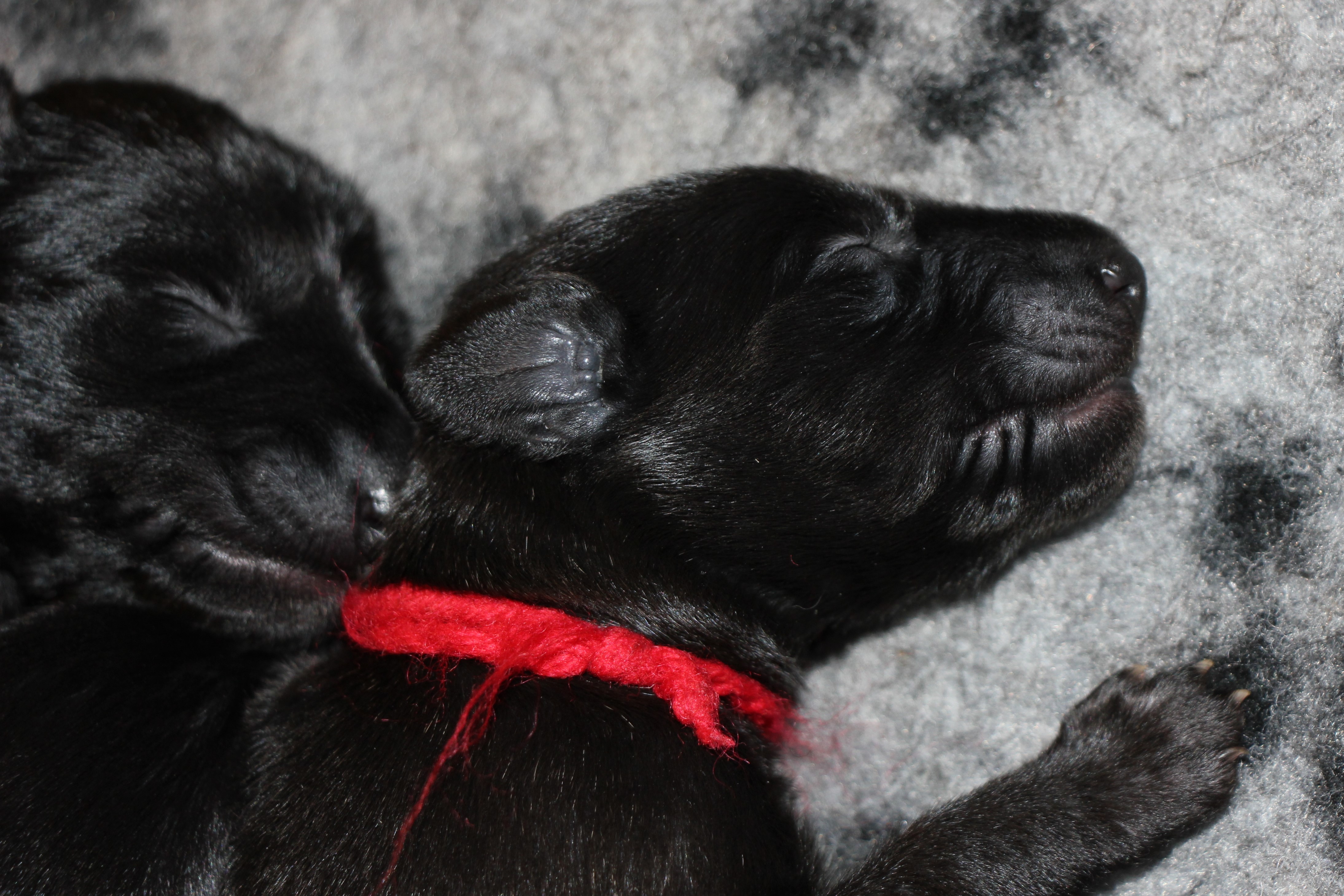 De meeste pups zijn al dik over een kilo, alleen het rode teefje nog net niet maar ze groeit in verhouding het hardst! Wie weet haalt ze haar roze zusje nog in! De oogjes beginnen langzaam open te gaan, bij ettelijke zie je al een klein kiertje ontstaan. Ik ben benieuwd hoe blauw ze worden, lichte ogen zit in de bloedlijn dus het kan er zomaar uitpoppen, ik hoop het niet!