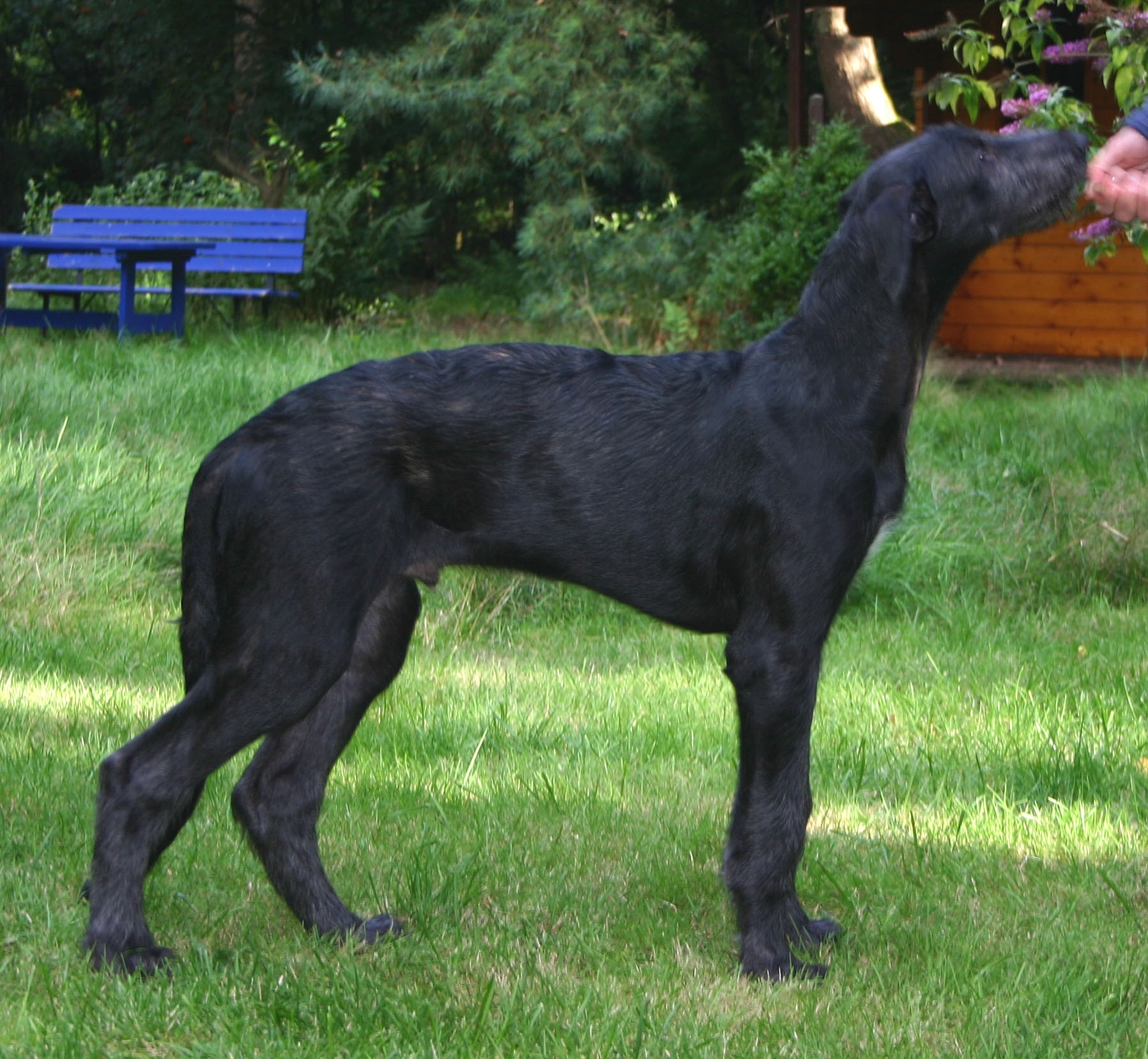 Craffitsh war in Bezug auf den Charakter nicht der einfachste. Er hat immer versucht, die Grenzen auszutesten und liebte es leider, Hunde zu jagen, genau wie seine Mutter Amy. Er kämpfte zwar nie ernsthaft mit einem anderen Hund oder verletzte ihn, aber wegen seiner enormen Größe (89 cm Höhe) hatten alle Angst vor ihm und es schien, als ob er das genoss! Im Rudel, auch mit den anderen Rüden, gab es nie ein Problem und er konnte auch sehr intensiv kuscheln.