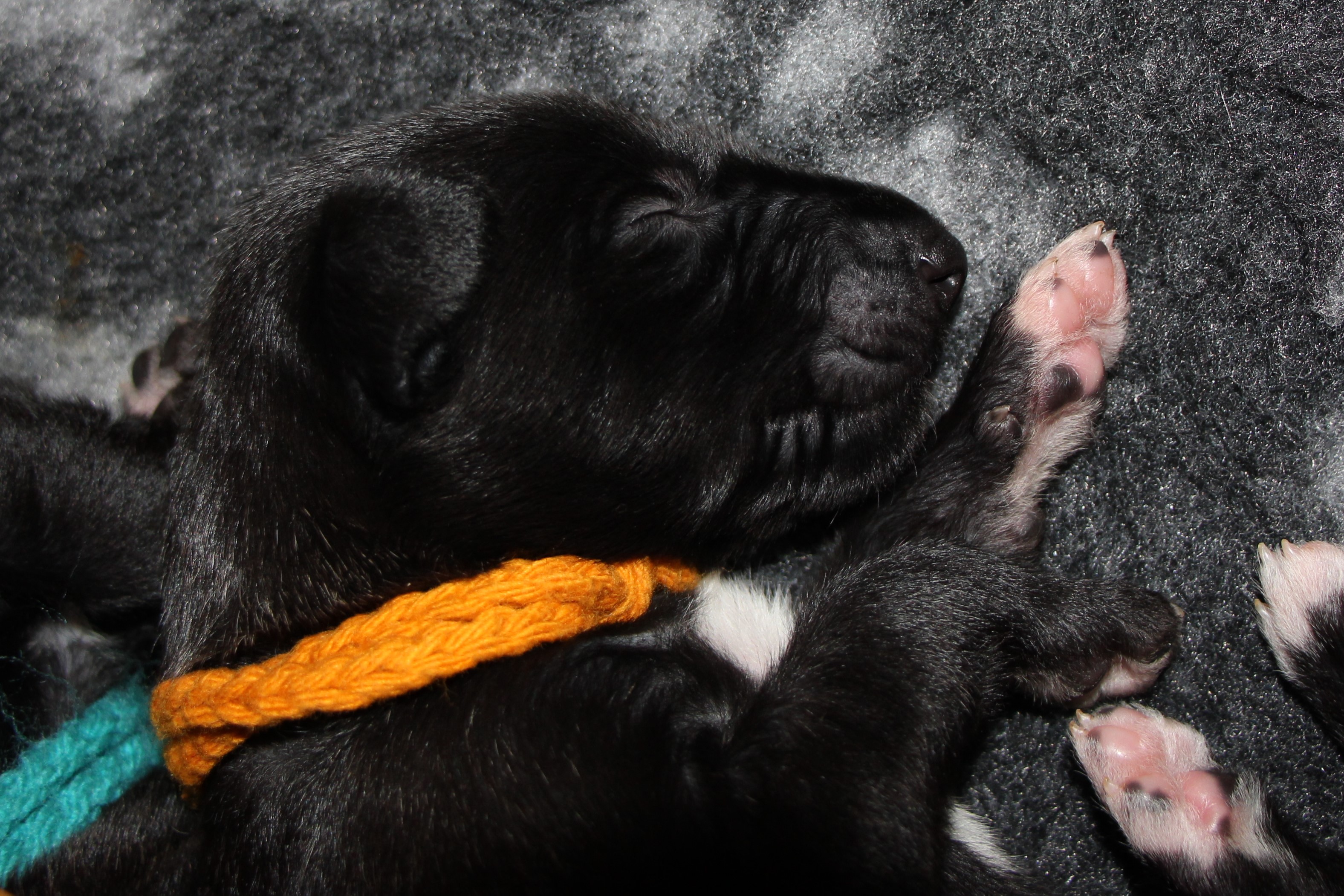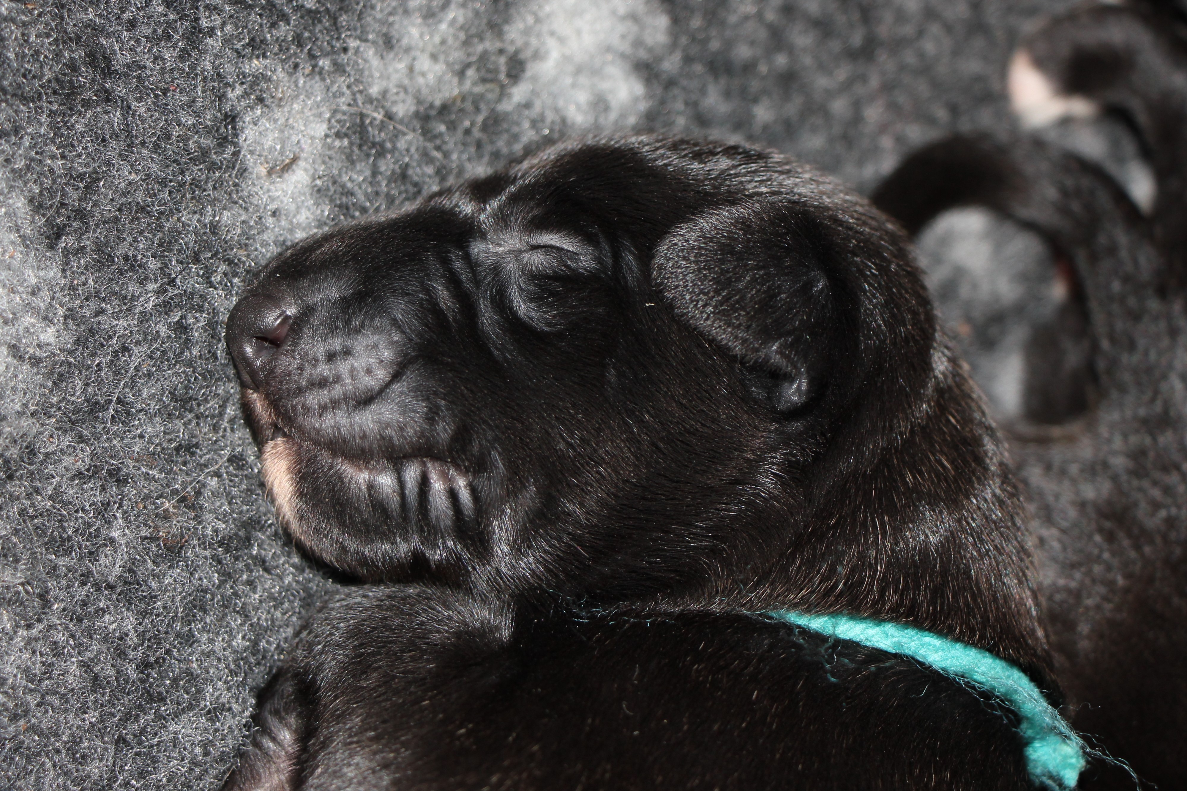 Der einzige Welpe, der nach einer Woche sein Geburtsgewicht verdoppelt hat, ist der türkisfarbene Rüde. Die rote Hündin, die kleinste vom Wurf, verdoppelte ihr Gewicht am nächsten Tag und der Rest am übernächsten Tag. Sie wachsen stetig, aber alle nehmen auch mal einen Tag weniger an Gewicht zu. Aber sie glänzen und sind quicklebendig.