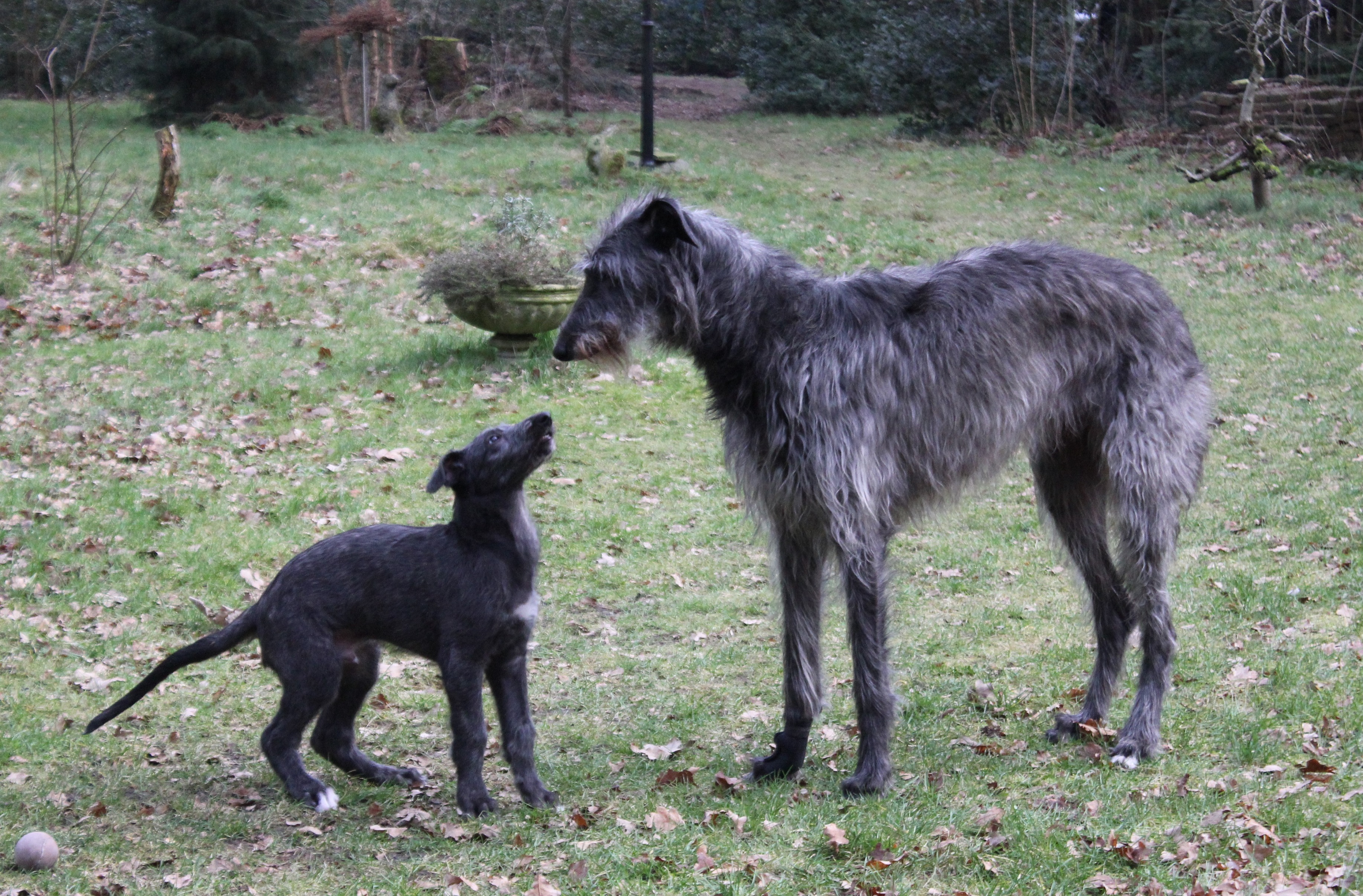 Es ist unglaublich, wie die Zeit vergeht! Morgen ist Cearrean 8 Wochen alt und wiegt fast 10 Kilo. Er entwickelt sich sehr gut, wächst schön gleichmäßig, ist sauber, hört gut auf seinen Namen, ist leinenführig, fährt prima im Auto mit, hat praktisch vor nichts Angst und we demnn man ihn korrigiert, hängt er einem sofort „ein Maul an“! Das mit Doggy Ride können wir vergessen, er schreit die Nachbarschaft zusammen – das ist ja auch etwas für kleine Hunde, nicht für Deerhounds. Er akzeptiert es absolut nicht mehr, eingesperrt zu sein. Die Wurfkiste mit dem Zaun ist also schon weg. Ein echter Deerhound mit eigenem Kopf! Wir haben sicher noch etwas Arbeit damit.