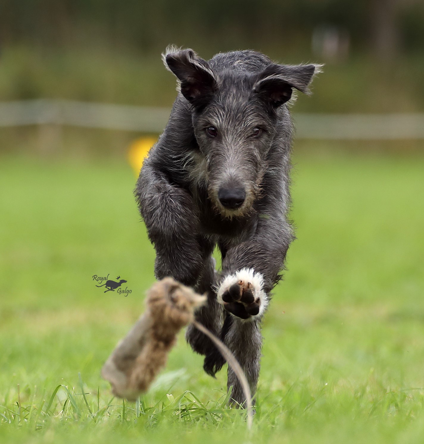 Inzwischen hat Cearrean sein erstes „Coursing-Training“ absolviert. Das Katzenspielzeug, eine Maus an einer Stange, ist dafür ideal. Cearrean findet es fantastisch und zeigt sich ziemlich fanatisch. Hoffen wir, dass es so bleibt.