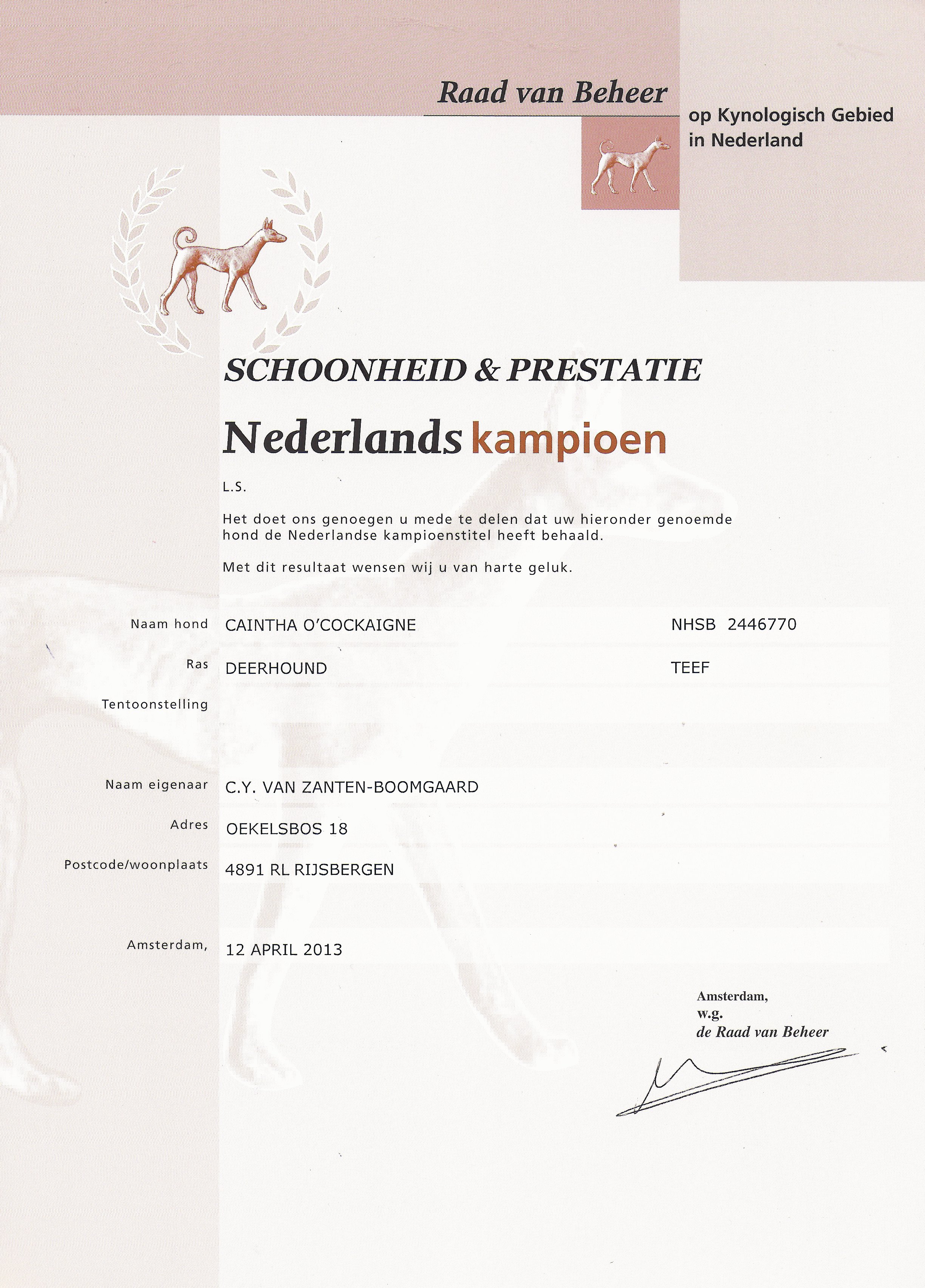 After almost two years, on 15 March, I finally received the title "Dutch Champion beauty and performance" for Calhoun. Today, after returning home, I found a large "board of Management" envelope in the bus containing the same title for Caintha. They are the first two Deerhounds in the Netherlands who can wear this title.
