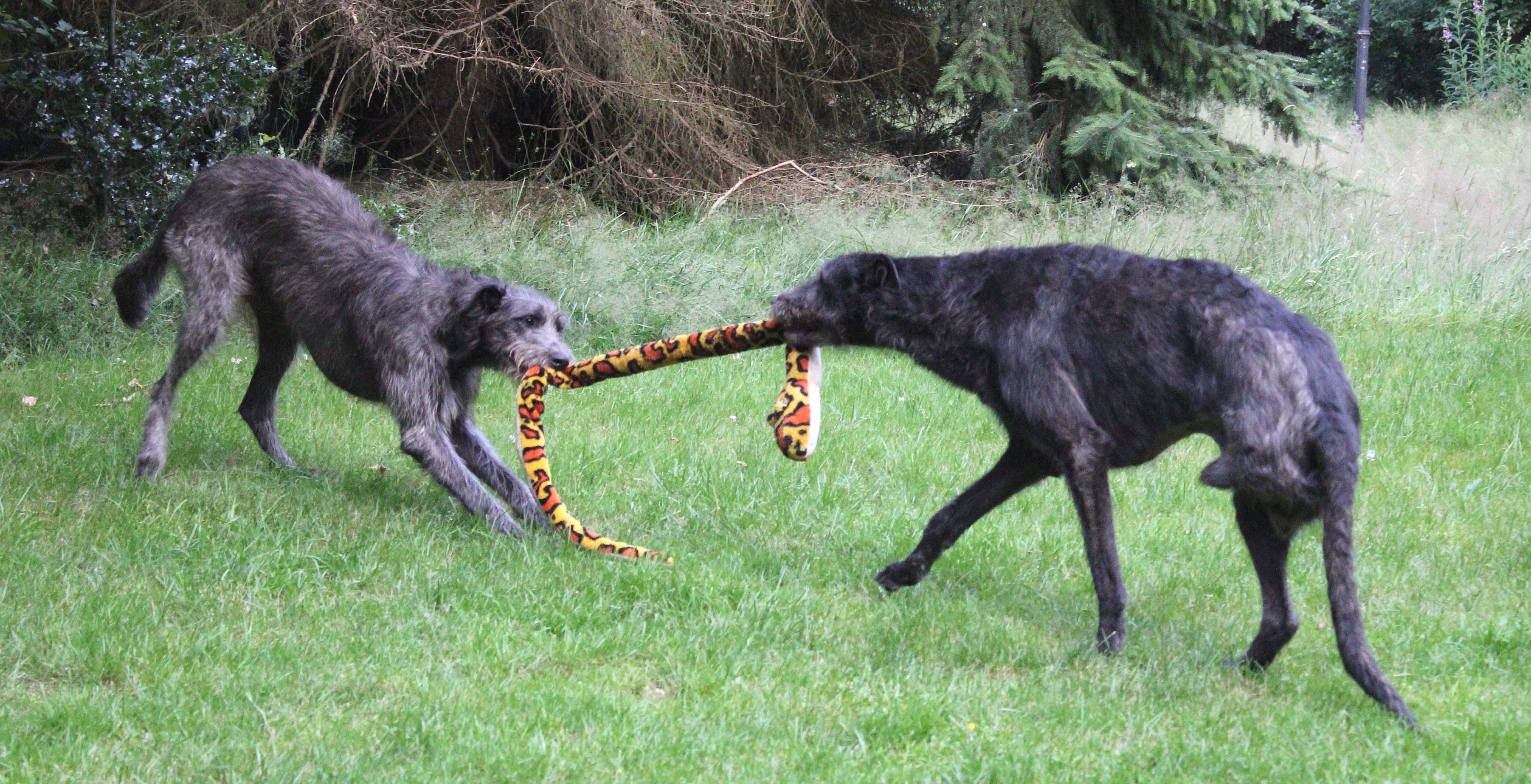 Since Sonja and I had planned to go to the wide show of the English Deerhound Club, Sonja stayed the days between Pentecost weekend and the wide show here. Fortunately it's a lot better with Bernice and so the puppies had fun for ten. The first days they simply couldn't stop playing and we had to get them in every now and then to relax. The problem is that when they get tired, they are going to make estimation mistakes and then run against them somewhere. They had jumped over a bank a few times, but at some point this went wrong and Brandir walked on three legs with a hole in his wrist, a hefty abrasion on his knee and a huge swollen second thigh. Traumeel and cold compresses did their miracles and the next day he ran again like a kachru. Also Silva and Calhoun find it wonderful to chase behind the puppies here on the premises but we prefer not because it always ends in a jar of chopping on one of the two puppies. Anyway after a little week of playing, Brandir and Bernice were a bit quieter and that gave good prospects for the trip to England as it was of course for the first time that they had to behave neatly in a hotel and fortunately they did that too.