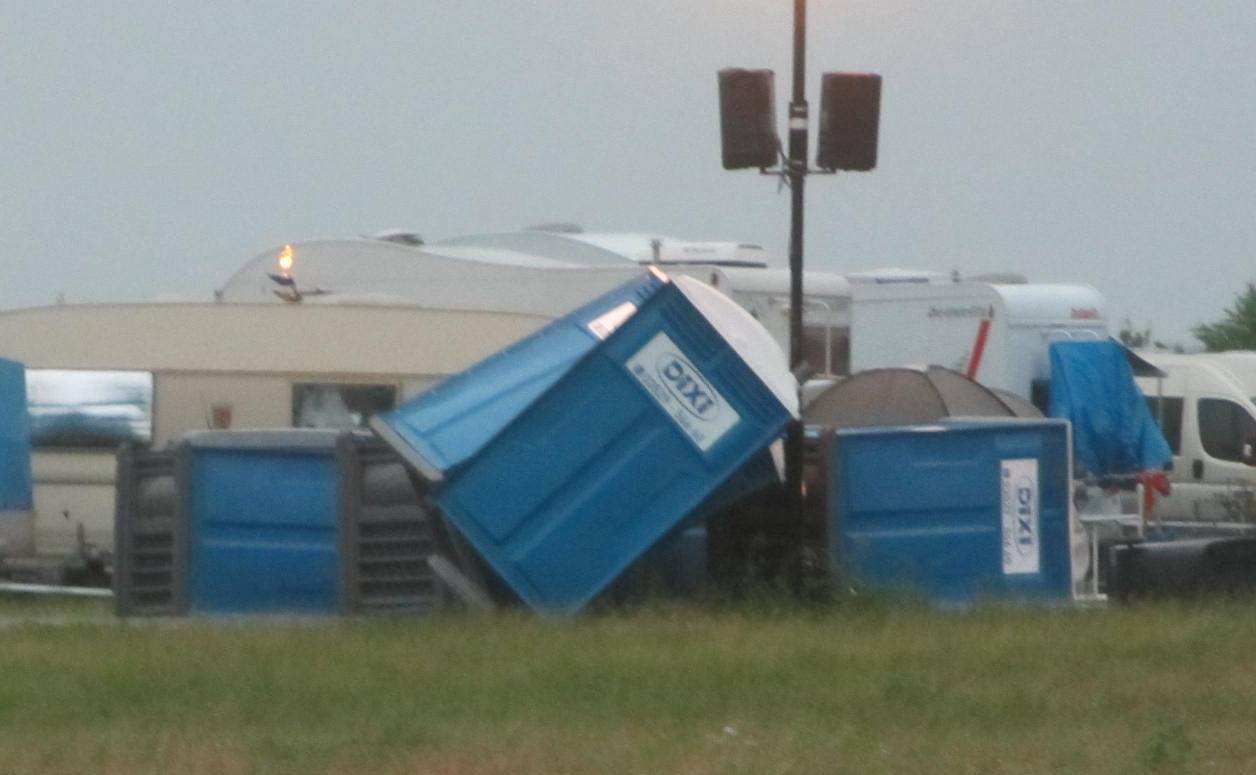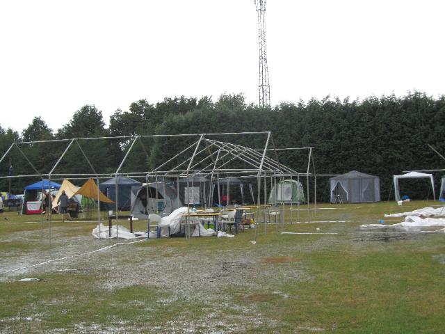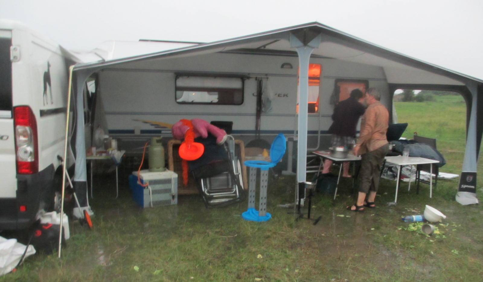 o'clock a huge distress broke out. Gusts who had the Dixie toilets flying through the air, extremely heavy rain and big hails made sure that everyone hung on his awning/tent/Party tent. And it took quite a long time! Just before that the storm erupted, we sat down with a pretty large group to eat. Chris and Henriette had a tremendous uitgesloofd on this delicious meal, but it would literally fly in the air later. At the last moment we decided to pick up everything and move to our awning and canopy, about 20 meters away. But when Simon and Sonja went with a table loaded by the gate, and the table had to lift a little higher, a squall came and blew everything off the table! That happened to everyone who walked into his hands with a table. In no time it was a ravage of your Welsh. If the bugger had to be windows and skylights closed, awnings had to be turned on but because of the enormous wind this was almost impossible. An additional problem was that because of the hard rain, the roaring winds and the huge thunders that followed each other at a rapid pace, it was not understood if someone shouted at you something. Awnings had to be hung, but also our large party tent that I wanted to use for my ceramics was built. The hounds also walked outside and did not understand. Except Lavinia, who saw her chance where and began to eat all the food she could find on the ground, on. As the bugger we have done the hounds through open doors, not looking which hound where and if we all had them. Our awning at the front tent was already broken, so we first demolished it quickly before he could damage the car, when the canopy of Angelika was saved, that of Sonja could still wait (we thought) and then hung with eight men at the party tent. Large hail stones beat against our hands and that did twisted a lot of pain. In no time everyone was soaked and there was ten inches of water locally. Among others at my party tent where the ceramic boxes were already covered. There was no more saving here. Also our freezers stood deep in the water, all the chairs, dog beds/rugs that stood outside, everything, everything was soaked. When the storm fell and we could see the damage, the courage fell into our shoes. What an incredible gang!! Everywhere lay food, the p