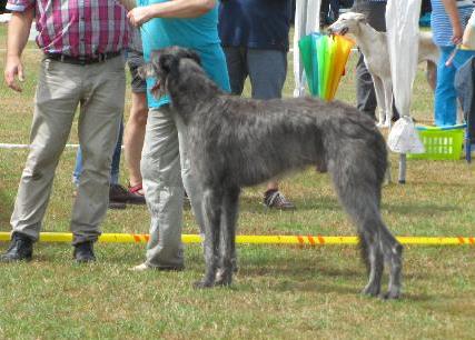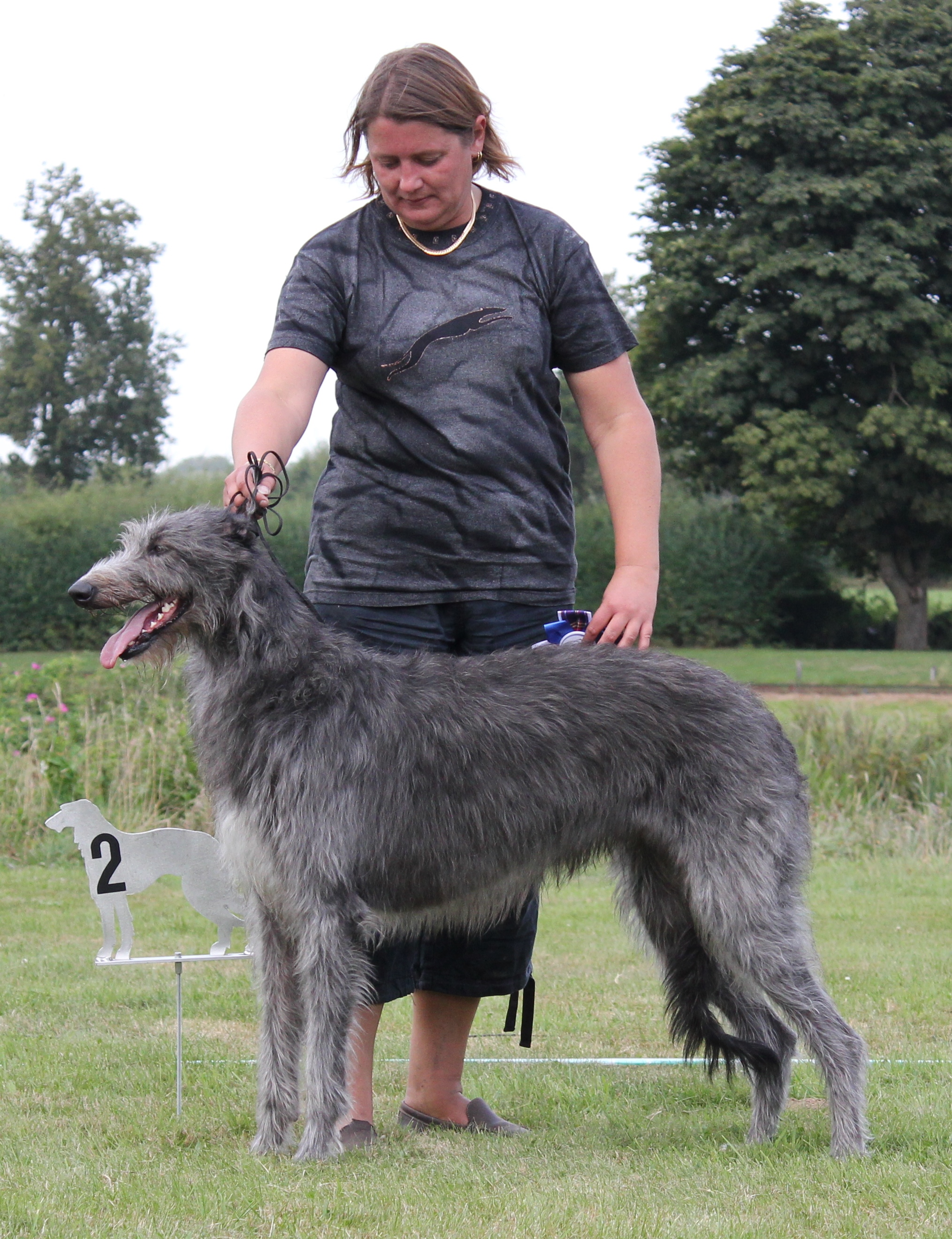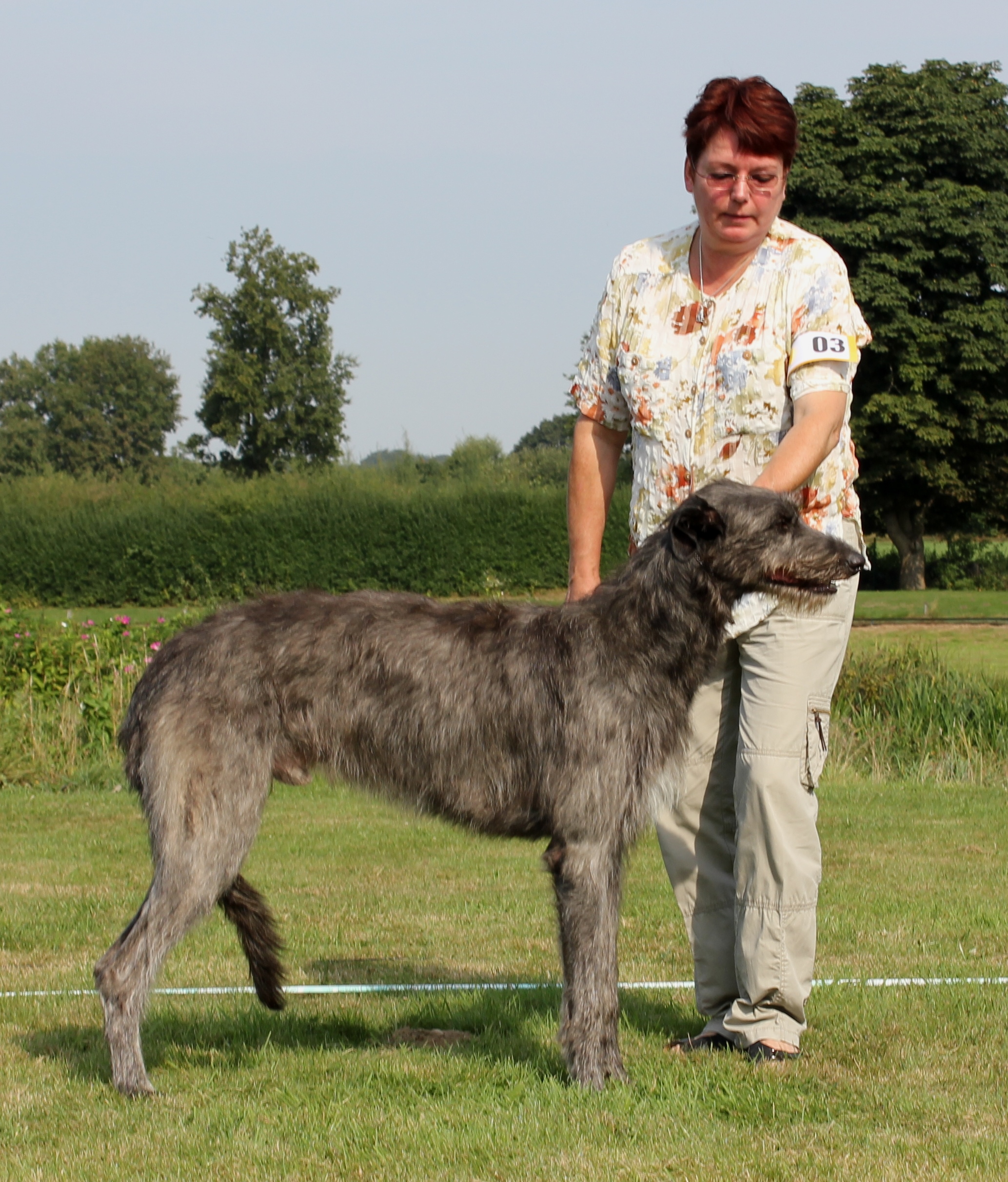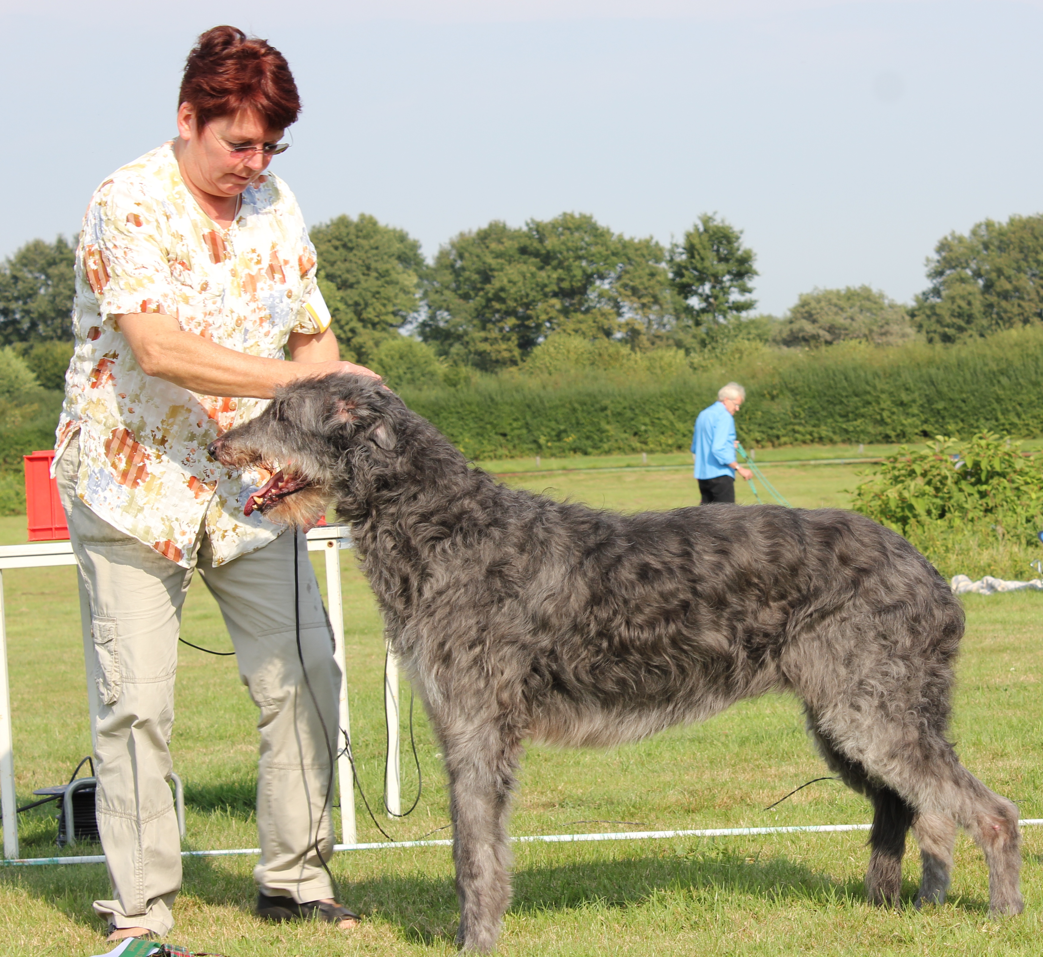 ed back, which had walked enough for the rest of the day! And Simon had enough stress for the rest of the weekend, which left Calhoun (fortunately) no more loose! The weather was extraordinary, almost 30 degrees but with a little wind so it was still well toefen. Only for a big walk it was soon too hot for our elderly club; 3 of 10 years and 1 of 11.5. On Saturday so the show, Sonja showed Brandir, Bernice and Silva. There were 9 Deerhounds reported, 8 present. Brandir and Bernice got their first YOUTHCAC and Brandir became JeugdBOB. BOB and BIS became the Kilbourne Harvest Moon, the brother of the father of Brandir and Bernice, living in Finland. Sunday, the coursing for which two Finnish Deerhounds were reported. One of them was blixen the Great Scott, this male had walked with Calhoun in the Czech Republic during the EKC in 2009. It was clear to see that he was a day old! Monday morning we all left again. We first went to Tüttleben to put our caravan there before the Pentecost weekend. From here we drove home on Tuesday.
