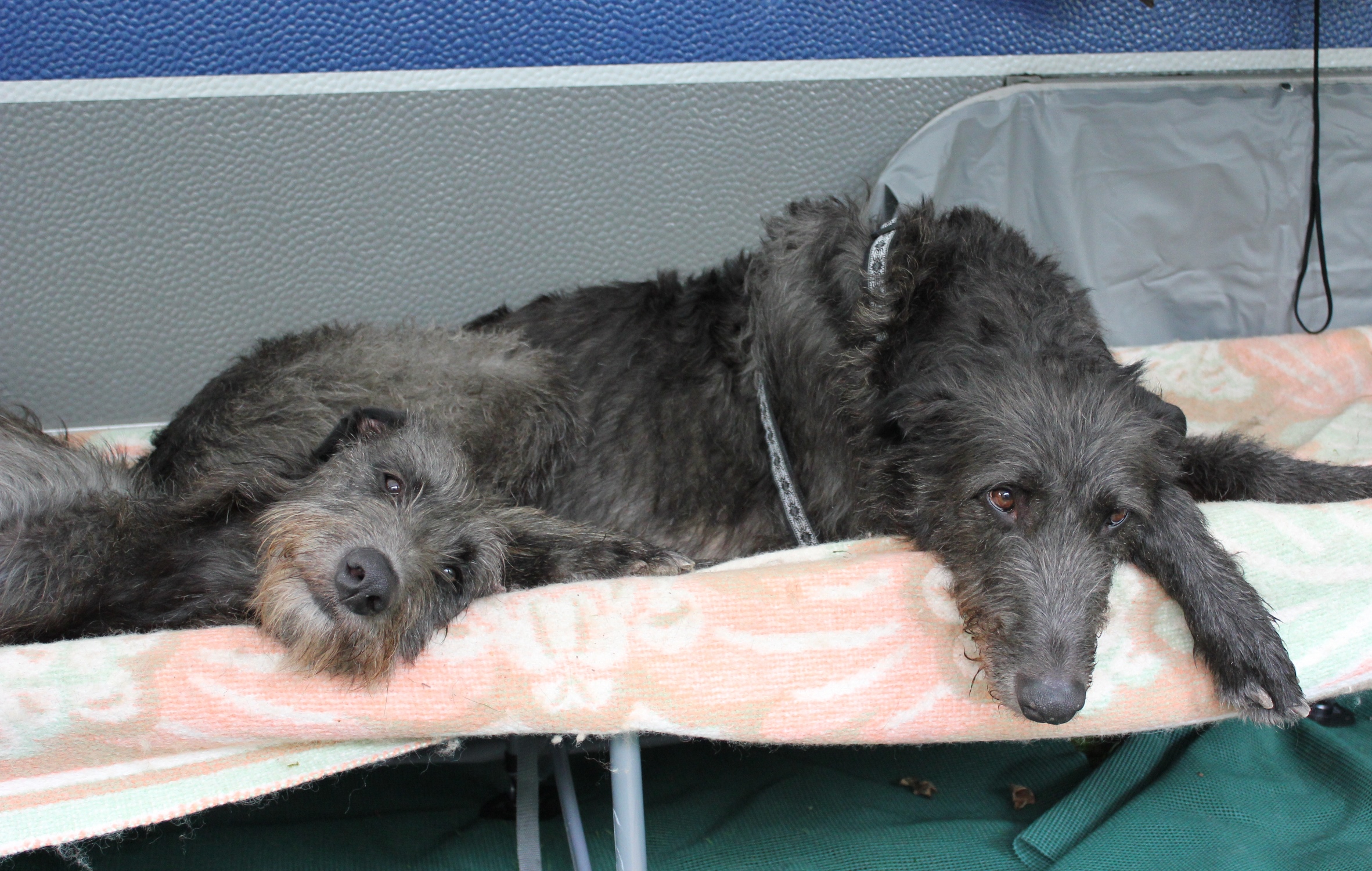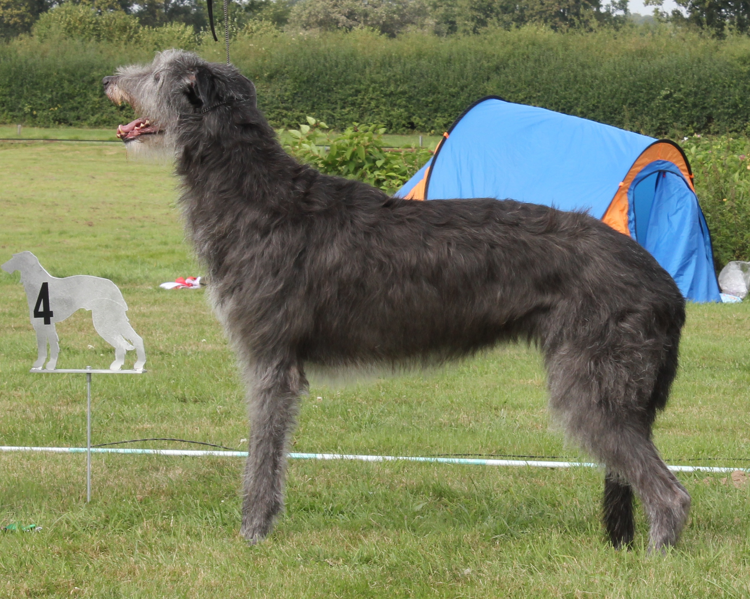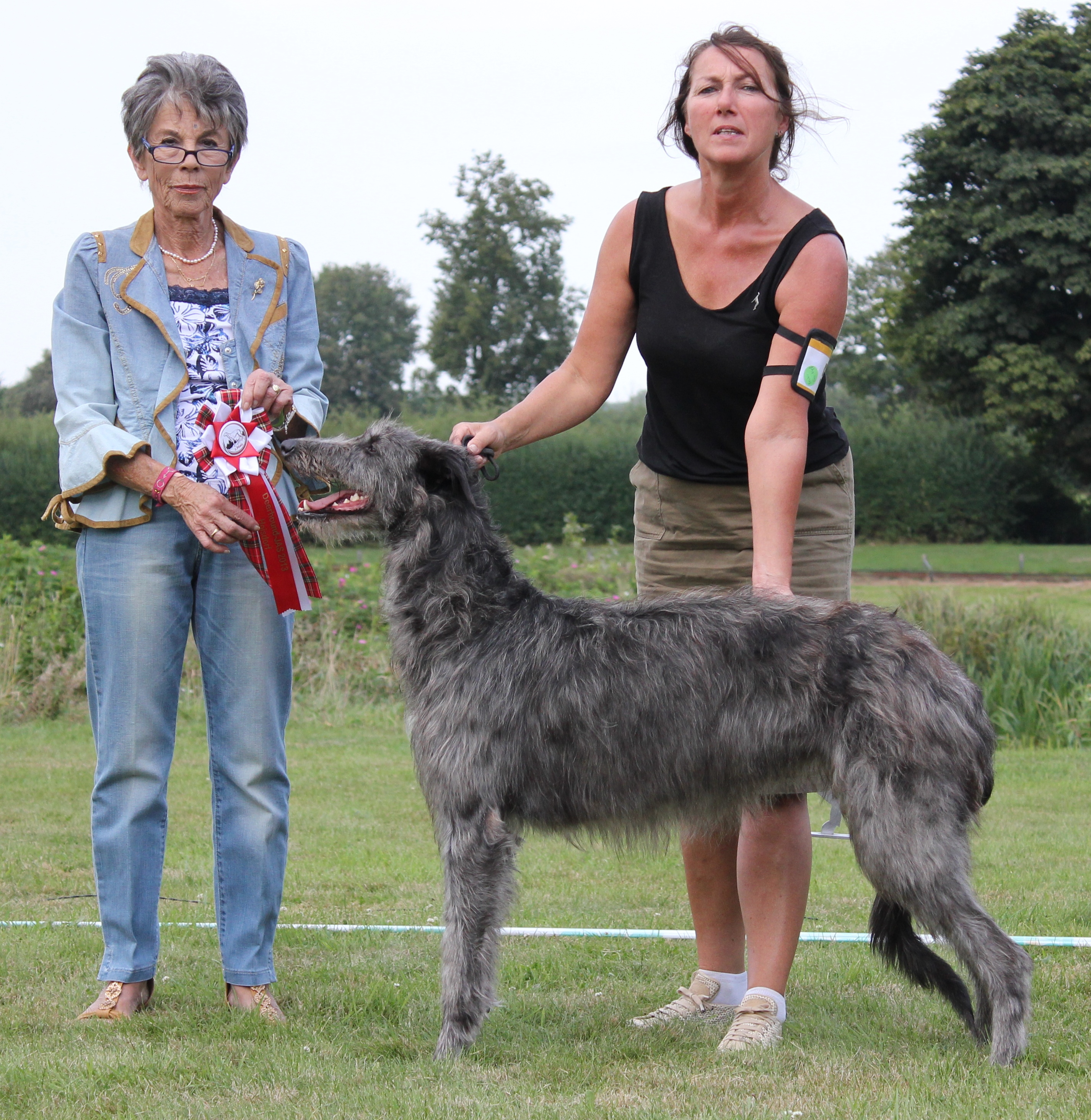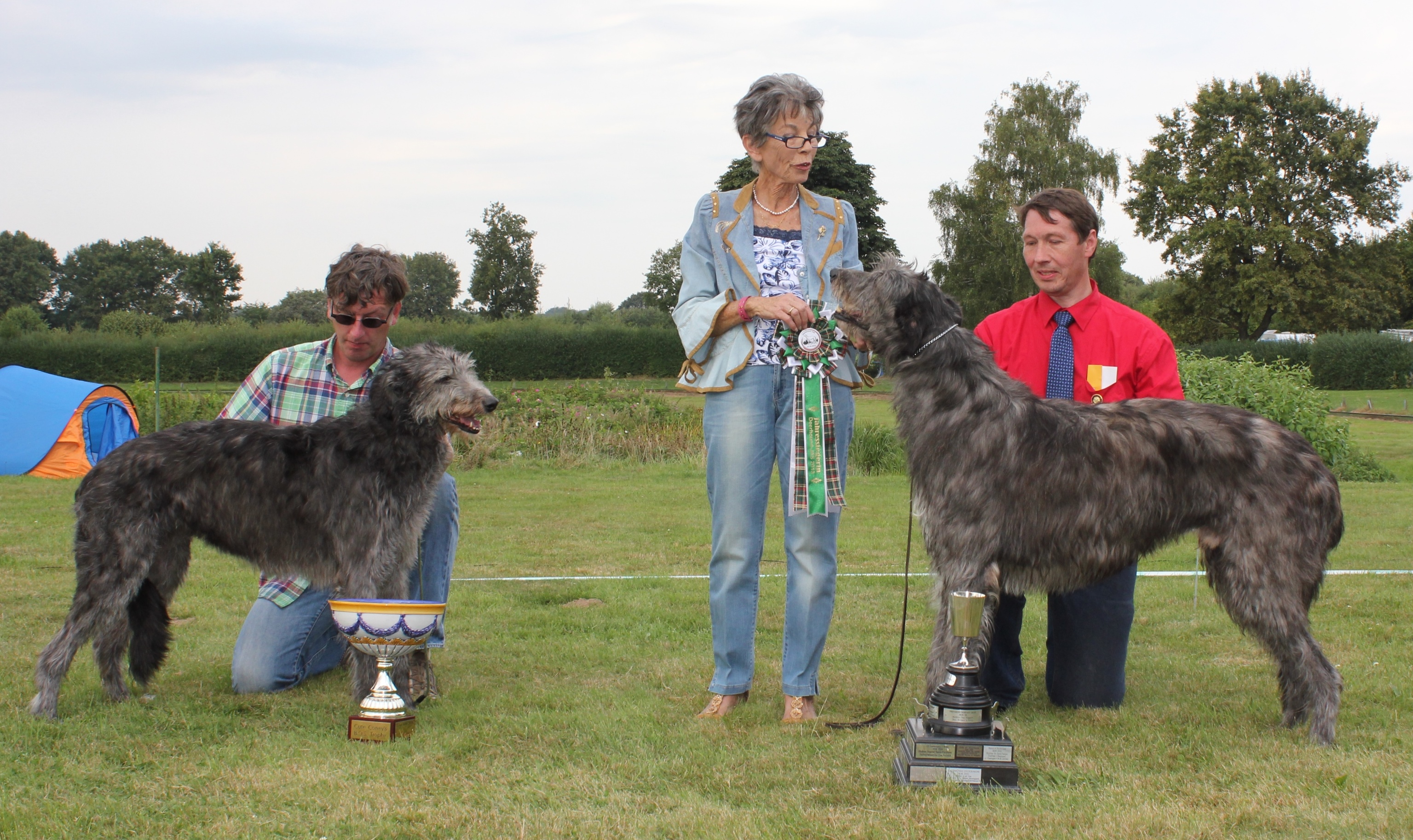 ed back, which had walked enough for the rest of the day! And Simon had enough stress for the rest of the weekend, which left Calhoun (fortunately) no more loose! The weather was extraordinary, almost 30 degrees but with a little wind so it was still well toefen. Only for a big walk it was soon too hot for our elderly club; 3 of 10 years and 1 of 11.5. On Saturday so the show, Sonja showed Brandir, Bernice and Silva. There were 9 Deerhounds reported, 8 present. Brandir and Bernice got their first YOUTHCAC and Brandir became JeugdBOB. BOB and BIS became the Kilbourne Harvest Moon, the brother of the father of Brandir and Bernice, living in Finland. Sunday, the coursing for which two Finnish Deerhounds were reported. One of them was blixen the Great Scott, this male had walked with Calhoun in the Czech Republic during the EKC in 2009. It was clear to see that he was a day old! Monday morning we all left again. We first went to Tüttleben to put our caravan there before the Pentecost weekend. From here we drove home on Tuesday.