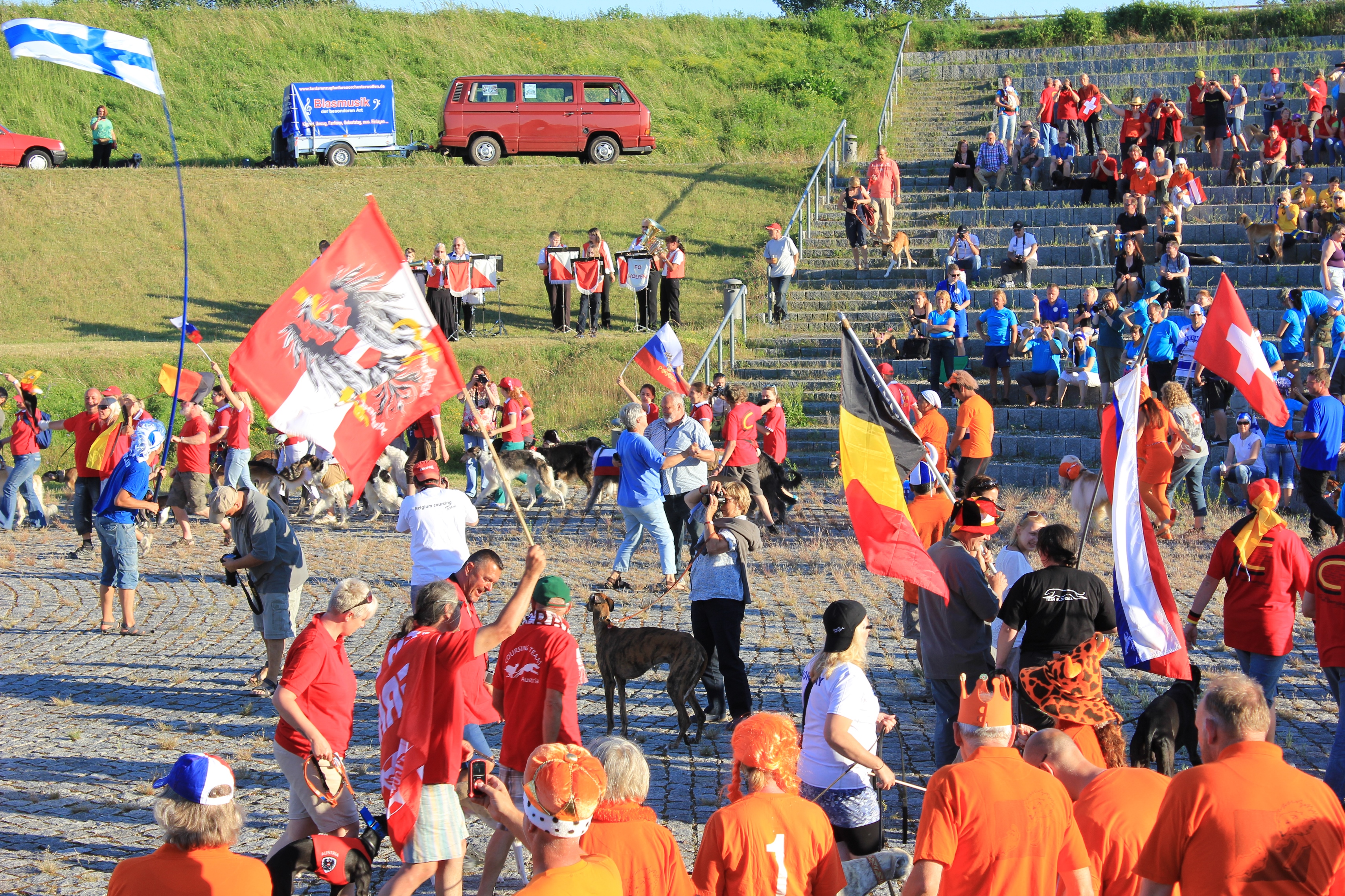 From 19 countries there were 808 hounds registered, with 157 reserves remaining. The number of hounds that actually started was on Saturday 305 and Sunday 443. The biggest report of course from Germany with 159 hounds, the Netherlands had 45 there. For the first time no Dutch Deerhounds at the start, where I was happy for several reasons. Firstly because of the glass, secondly because of the bad and short courses and thirdly because of the atypical Deerhounds that we currently see many appear on the Coursingveld and also win everywhere. By the way, this year it was very striking how many atypical rasvertegenwoordigers there milling about. Dogs that I really thought were the crossings were standing on stage in the evening. It is high time that all the greyhounds were tested on varietal purity.