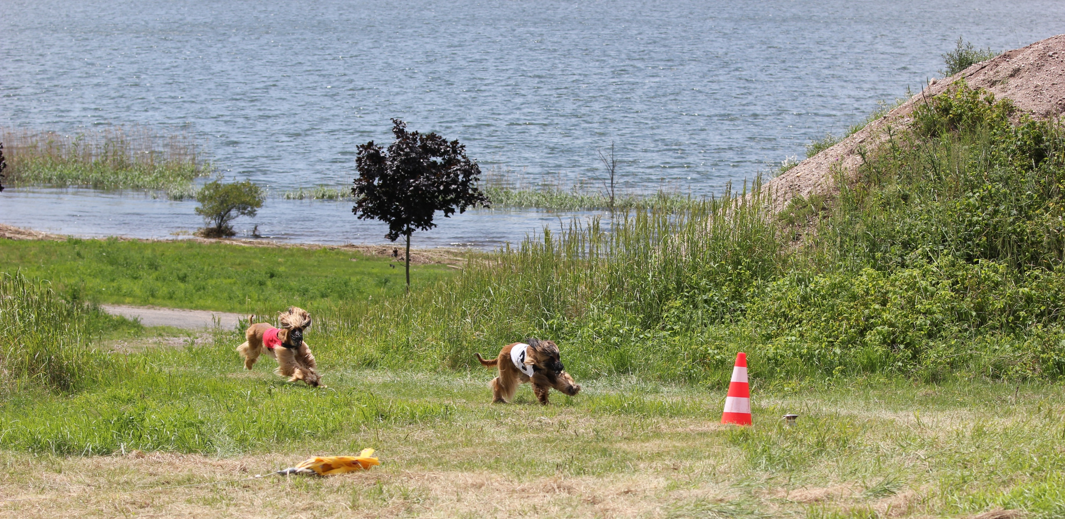 In the meantime it had often rained very violently and there were gigantic puddles everywhere, so also on the Coursingterrein. Sunday and Monday was the coursing for which Simon was asked to build, run and master the course. On Wednesday afternoon he had already started to turn it off there on Thursday morning the town would partially mow the pasture. At first, Simon had explained a nice long trail, but then it turned out that the chainsaw, normally an iron-strong rotary device, did not pull it. Everything went down again, shortened, extra cut, nothing helped. It really was on the chainsaw. Sin of the beautiful long trail! But because of the rain it was a very spectacular route, the people had to go through water but also the hounds,
