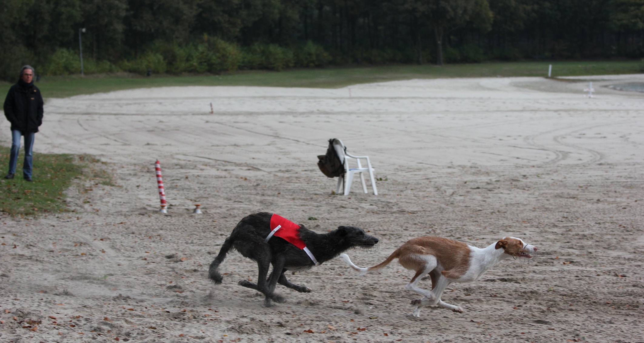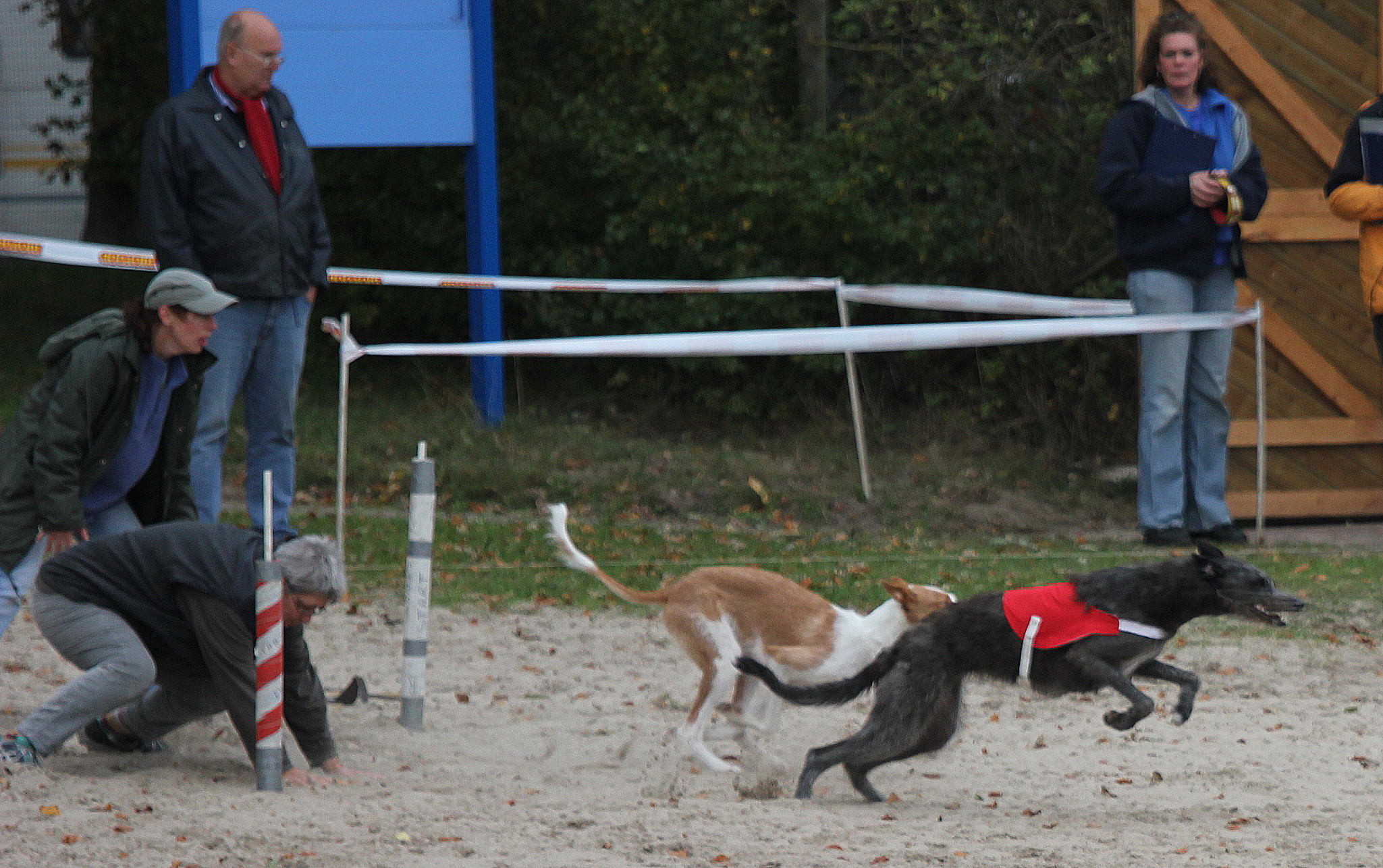 After they went well, when he returned home, a bottle of wine was first in the cooling so that if Bernice would not messing up it the second time, we could celebrate that Bernice may appear on the Coursingvelden next year. After having fed the hounds and we had our own breakfast indoors, we went to see the other courses. It struck us, especially on Sunday, that a lot of hounds did not have sufficient condition to accomplish the 800 meter in a good way. Especially the Barsoi's and Irish Wolfhounds were very disappointing. After the afternoon break, Bernice and fiddle, Brandir and Picaro were again ready for their second licence run. Bernice started very fanatically, Sonja couldn't keep her at the start. So here laughing..