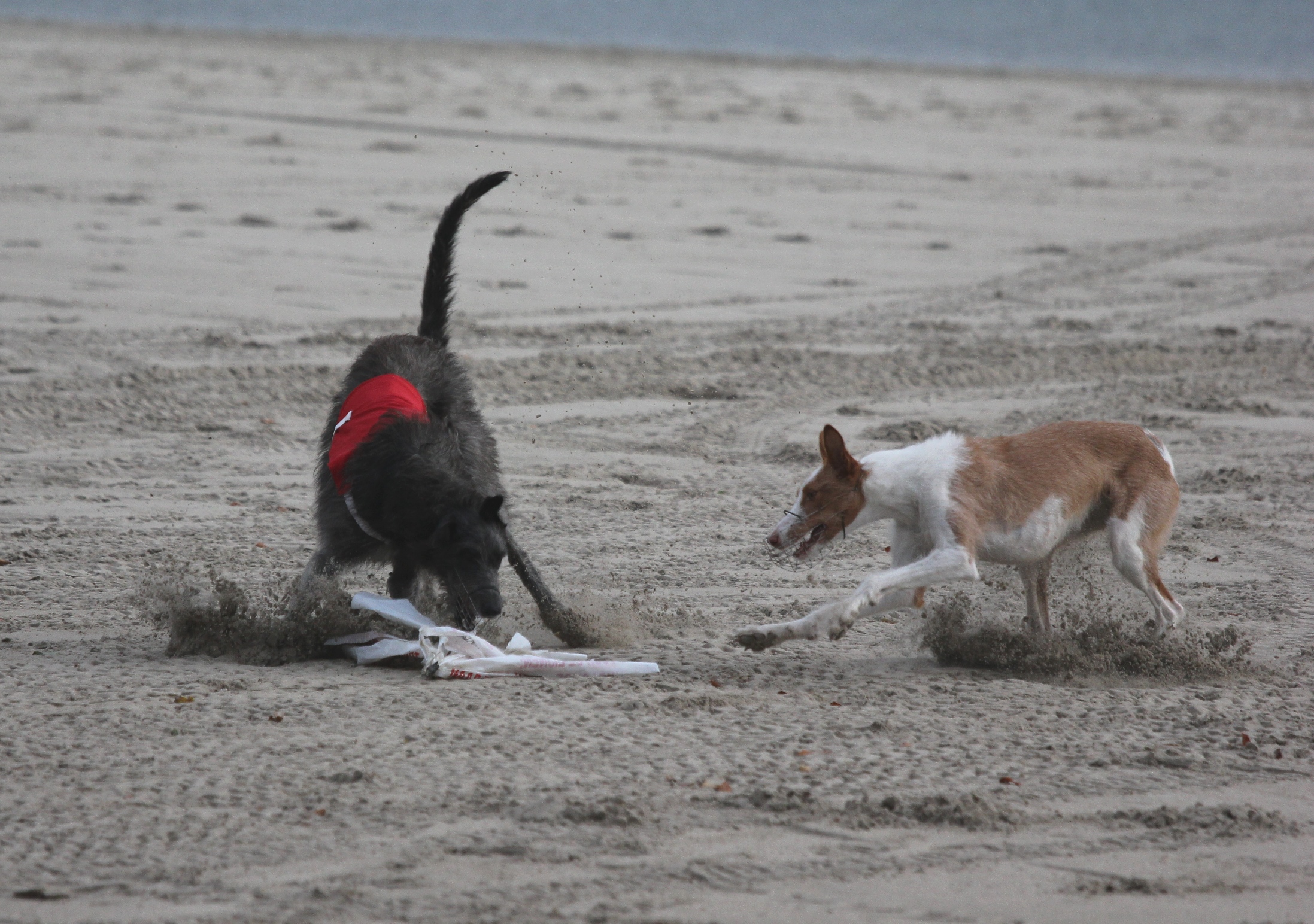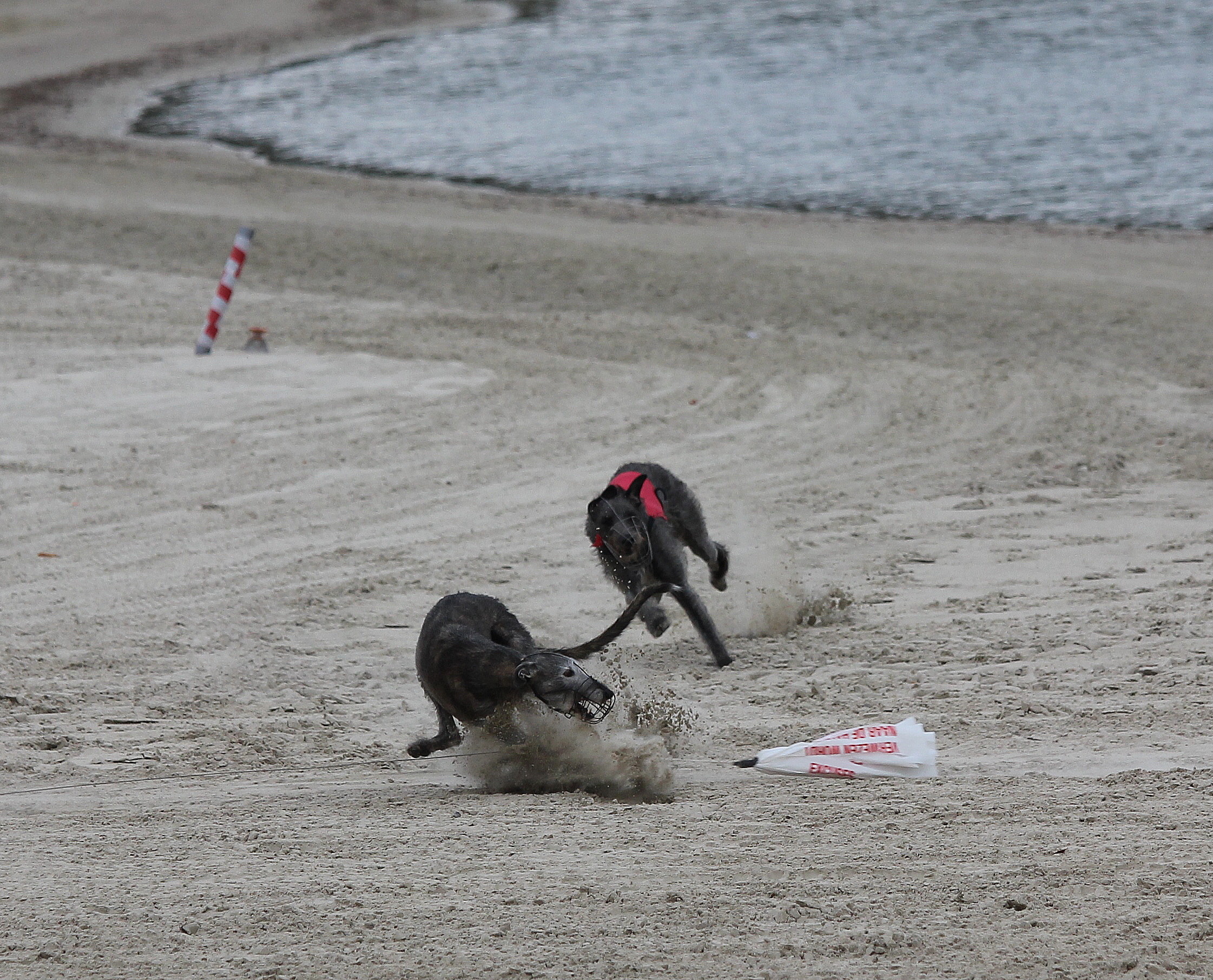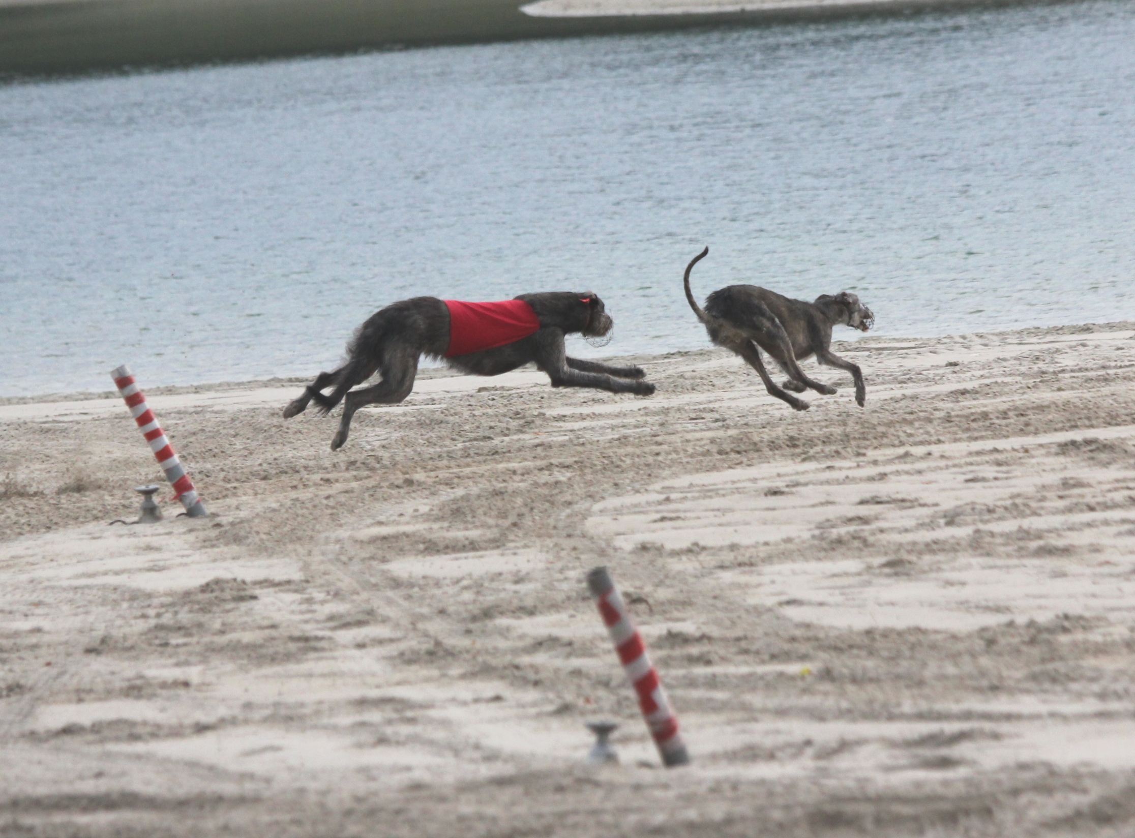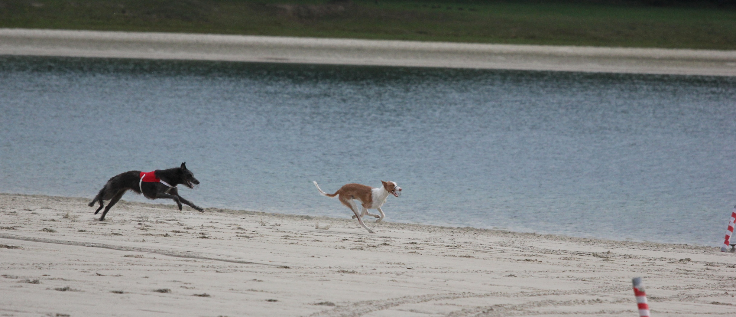 In the course of the evening I was asked if I wanted to let Brandir run a licence loop the next day. The jury had talked about it and thought it was good for him. After consultation with Cis and Annemiek or Picaro it was could handle and whether they liked it, we decided to do it. So Sunday morning again early from the feathers and at quarter for nine we were back at the start with Brandir and Picaro. Now Brandir was really fanatic and started just fine. They walked a wonderful course! What a pleasure to see those two fly over the sand! I am glad that Brandir is now also ready to run his licence but we will still have to be careful with him, he is and still remains a ' babyhound '.