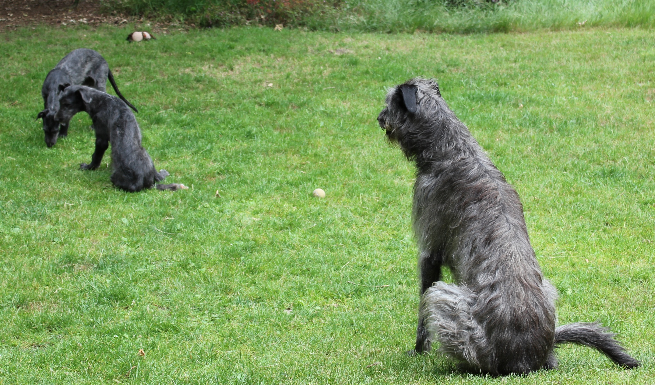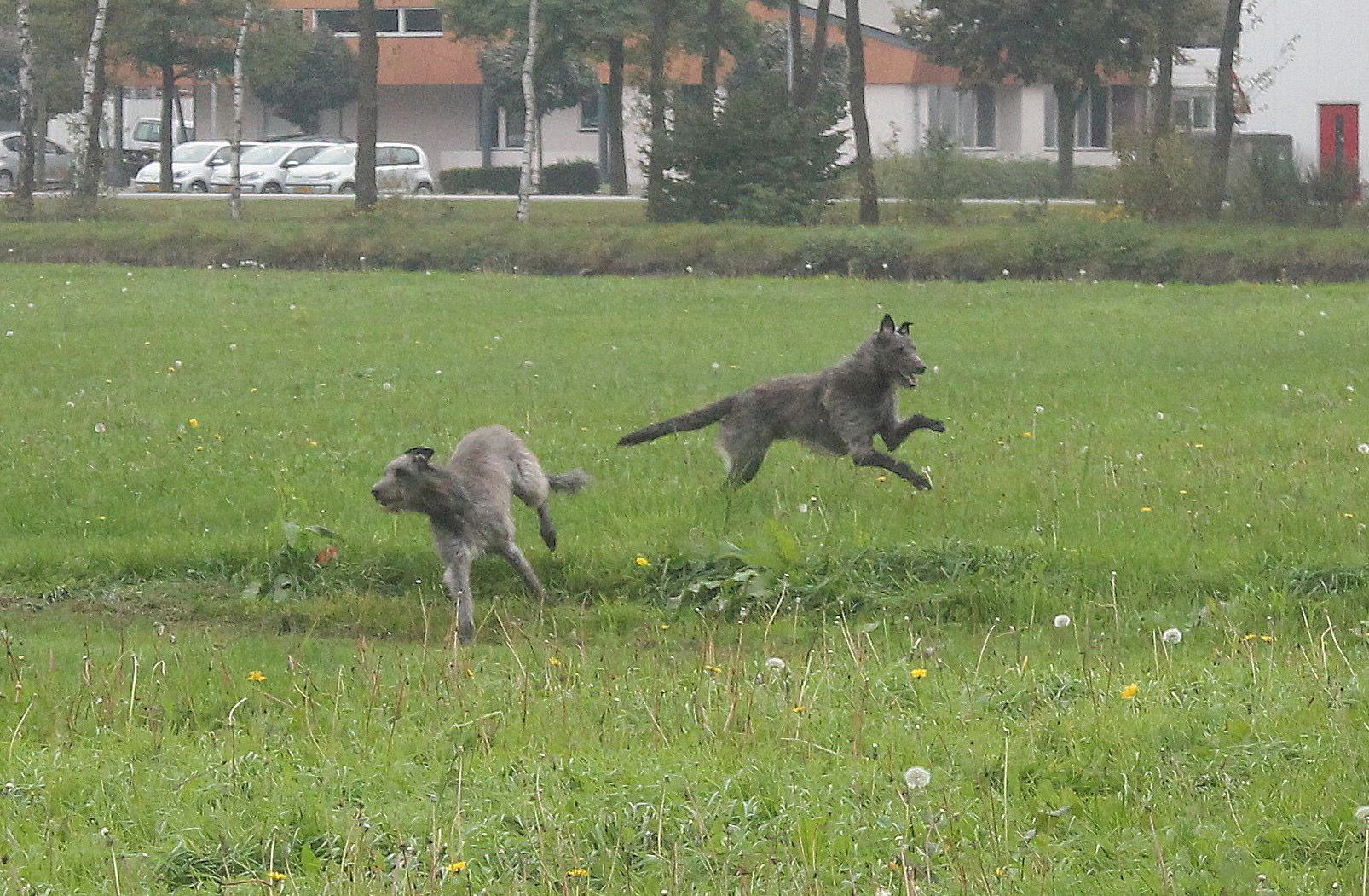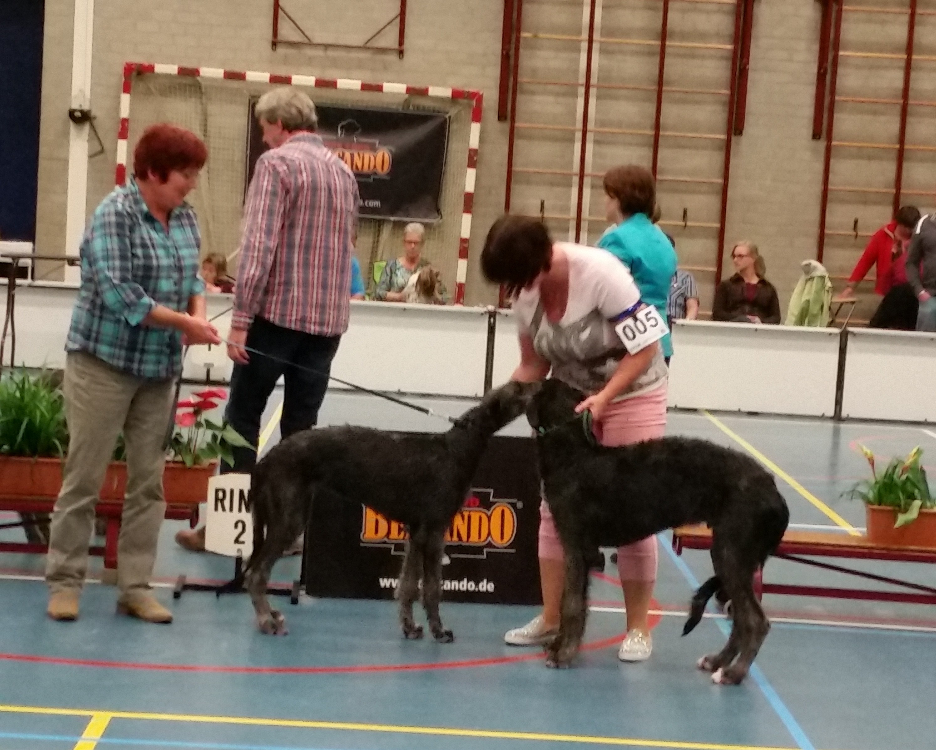 Two weeks later we had the young dog-Veterans Day of Stichting group Greyhounds. There were 15 Deerhounds reported of which the veterans male was absent. Chidish was only in his class and Cytaugh and Aislinn stood with their two in class from 4 to 6 months. Aislinn became first and Cytaugh second. In the end Barnes more Energy of Viola and Wolfgang Müller became Best young Deerhound. It was a nice day, slightly fresh but fortunately dry!