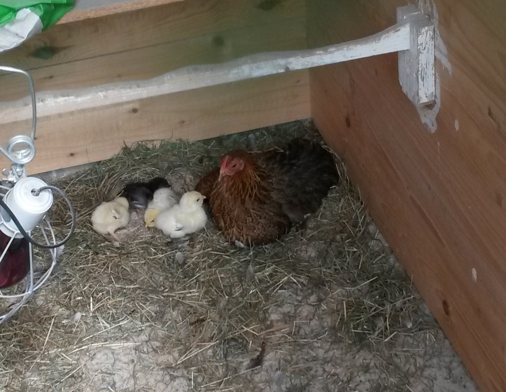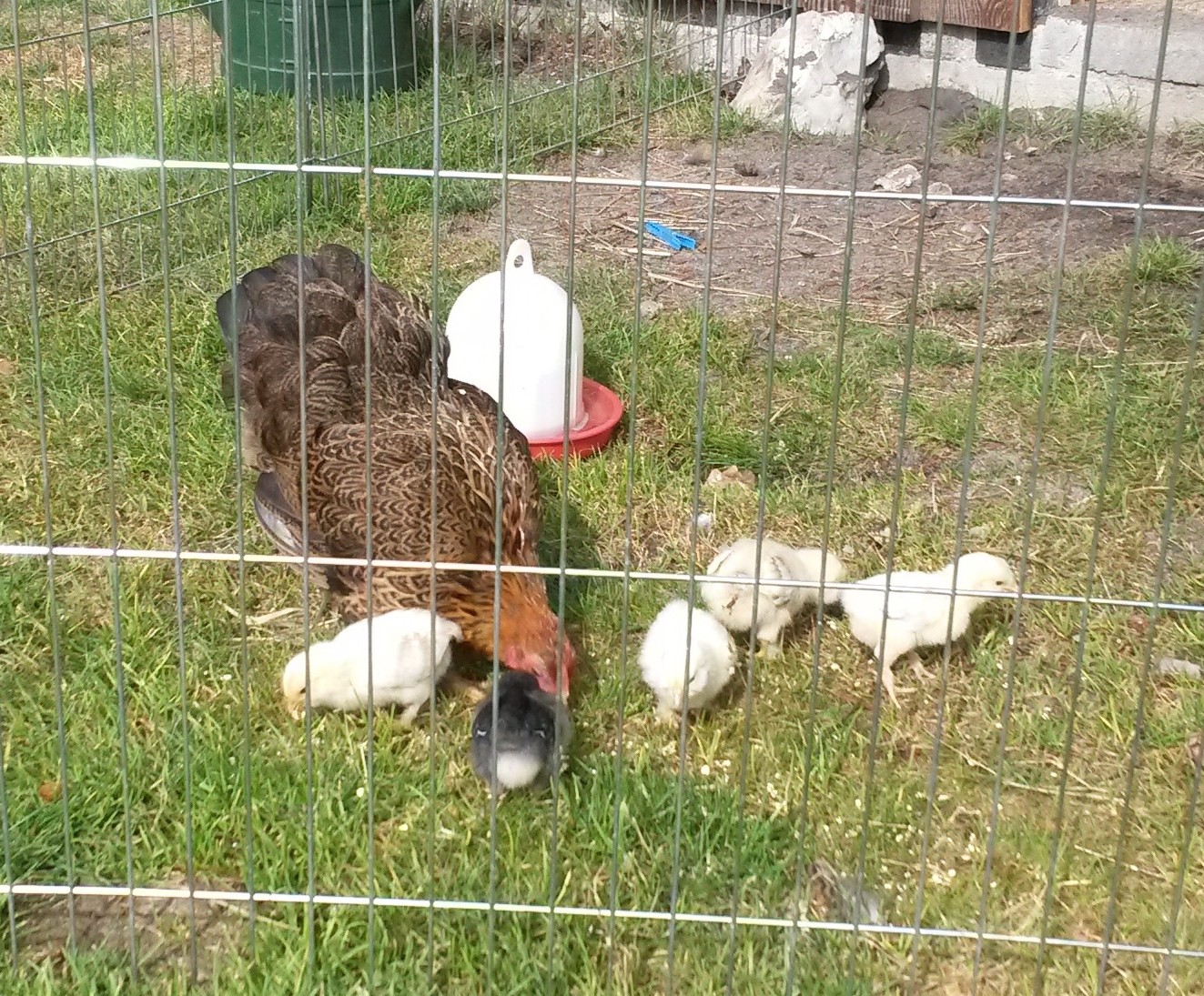 In the same period, Sonja had a number of Faverole eggs hatched by her chicken. They have come out just before Pentecost. Four small Favi's and one dresdener dwarf. If they are large enough they will live in the Oekelsbos.