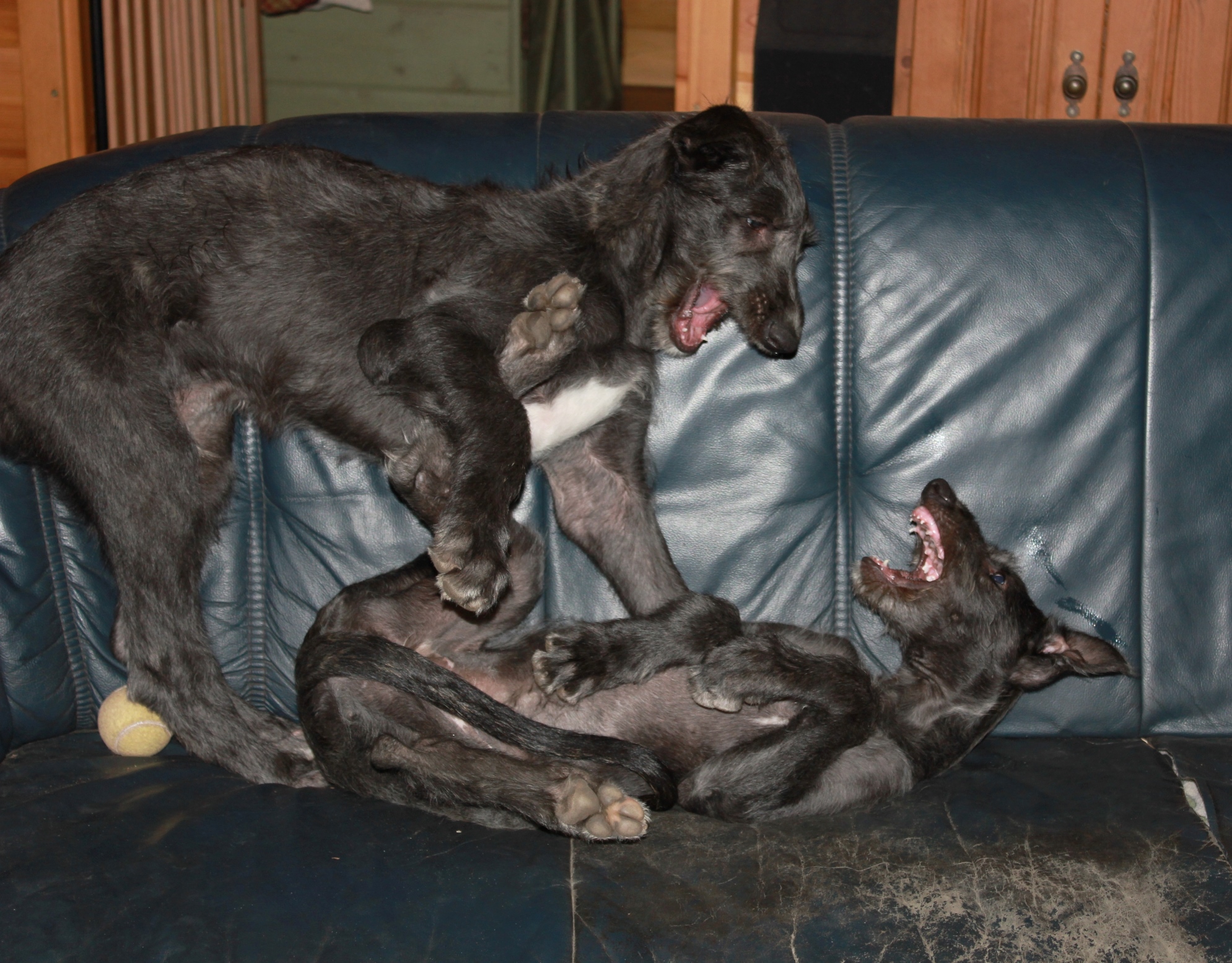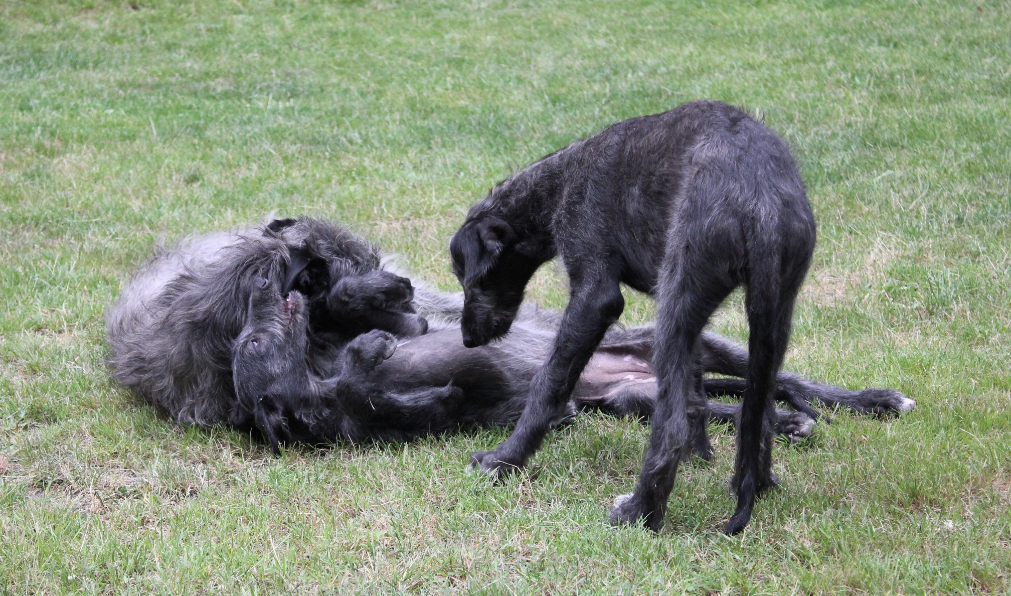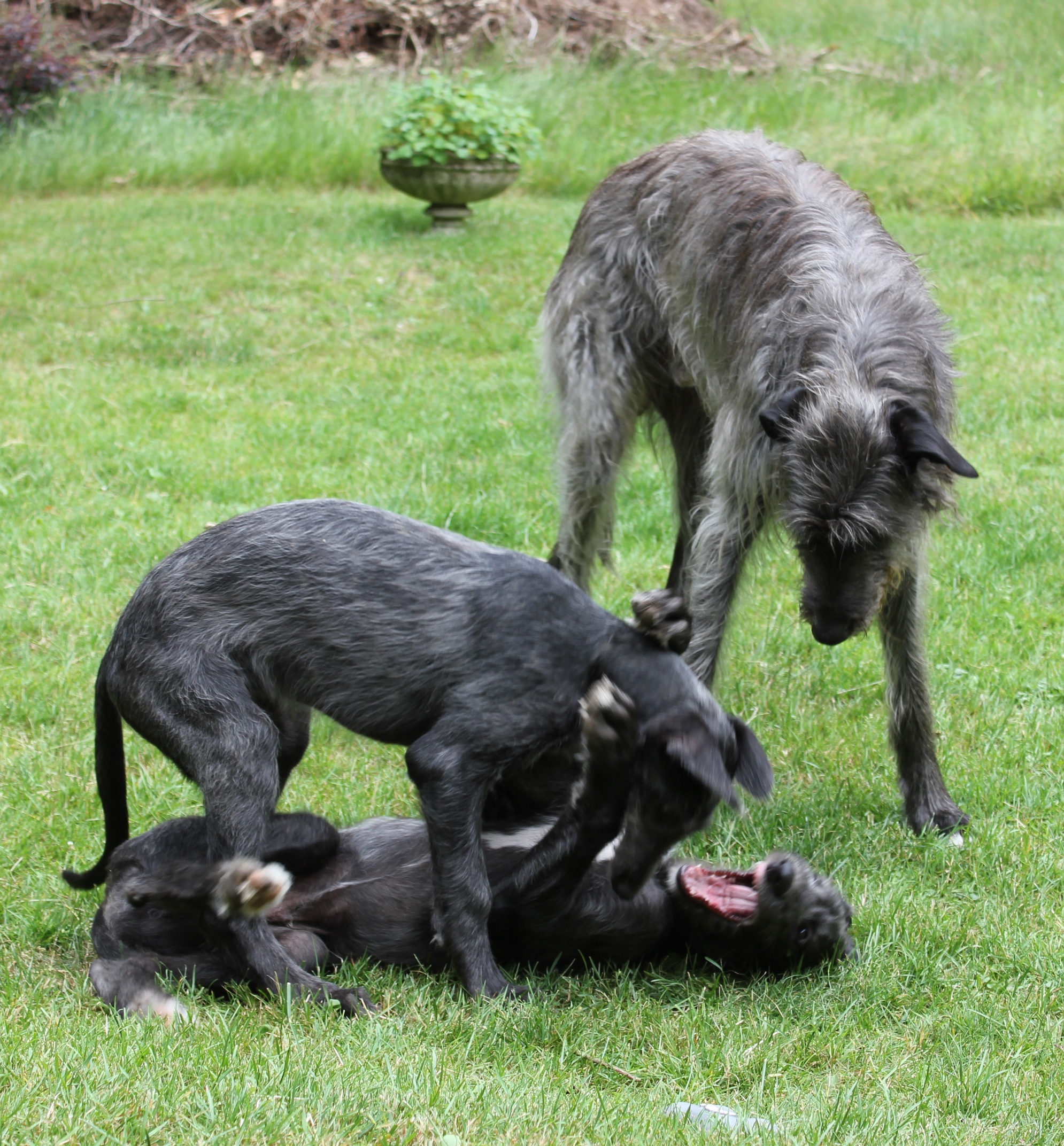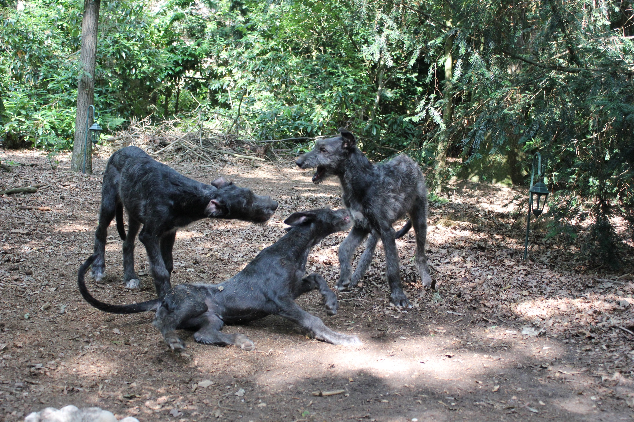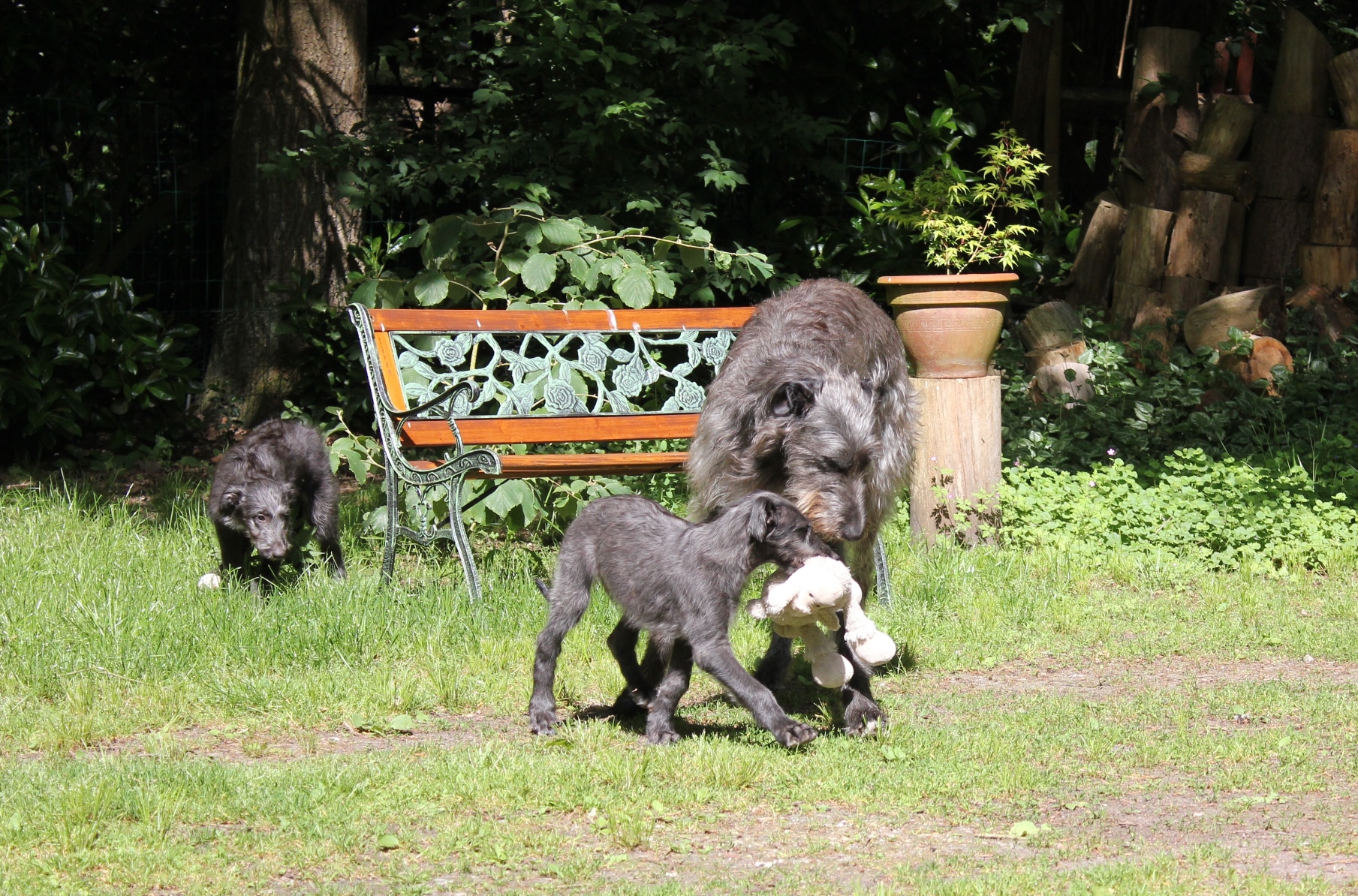 On Friday-afternoon, Marijn and Theo brought the pedigrees of Cytaugh and Chidish. They had taken Aislinn of course, and the puppies thought it was great to see each other again, they had giant fun. While we enjoyed a glass of cult and a Harinkje, these three played continuously. Really enjoy!