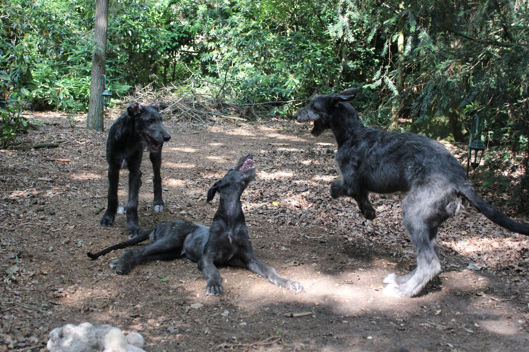 After on Wednesday the 15th of April the car packed with clothing and footwear for show and coursing, Brandir's show-and Coursingspullen and three Pinus's of thick and a half meter length, left Brandir and I on Thursday morning towards Hermannsburg. By celebrating, Brandir and Bernice could greet each other. After having walked the hounds first, the PINUSN went into the ground and Sonja and I loaded my stuff in the camper. Friday morning we headed towards ' Gut Bast ', near Großenaspe, for a weekend show and coursing. When we were about 10 kilometers away Klingelde the phone. Simon. He reported that at half past eleven a mail had come in from Dennis Buroh, the sonderleiter of the show, with the announcement that foreigners were not welcome. One reason was not there! It is of course crazy to send an email to someone who still has to travel 700 kilometers the next day to take part in the show. Anyway we arrived as if we knew nothing, Dennis and his mother greeted and asked if everything went well. Right, we were told that there were problems with the veterinary Office and that the foreign hounds were not welcome. There were all sorts of vague reasons, strange stories told and excuses concocted. We were also told that all foreigners had been notified on Wednesday by phone or e-mail. Sonja responded by saying that I was foreigner and did not hear anything. Dennis muttered something of that the email probably hadn't arrived and that there was a solution to be found. Then Sonja climbed into the phone to discuss with the President of the Landesgruppe and hear how the fork was in the stalk. A thick hour later we took the decision to mention in Brandir's passport Sonja as co-owner to solve all problems and to be nagging and to make sure that Brandir could participate in the show. When we showed Dennis the mail that Simon had been forwarding in the meantime, he said that it had taken a long time!!! For the DWZRV-Sieger show, 13 Deerhounds were reported. Fortunately, the Czech Keur Mistress recognized the right type of Deerhound but still gave far too many U-tak. Brandir became best male and Edlyn Shadrachs gift to Caoinlan, a beautiful female of Danuta Materzok-Köppen, became BOB. Bernice won the Open class with the reserve CAC but since Edlyn is in the waiting period she cannot use the CAC and moves it to Bernice. With this, Bernice became German champion!!! Edlyn Shadrachs Gift to Caoinlan makes an ugly slider. [/caption] On Sunday the coursing took place. The field was an event area where polo competitions were also held. It was huge, super tight, just cut (very nice in stripes) and so in the morning, through the moisture in the loose grass, very smooth. Several hounds made a slider. The route that had been turned off did not exceed the 500 meters while you could have put at least 1000 without difficulty. Also it was very unimaginative and even dangerous. After that the Barsoi's had walked first, the trail was changed somewhat, something more length was created and a ridiculous point was taken out. At the Deerhounds were 8 bitches reported, 7 present. In the first turn, Bernice ran with Craige or Canadagh Caoinlan of Evi Neserke. This has only walked the half course and was withdrawn for the second round. Bernice walked, after an arduous start, 53 points together, which was good for a second place! In the afternoon she was classified with Edlyn Shadrachs gift to Caoinlan, which was at the top of 54 poin