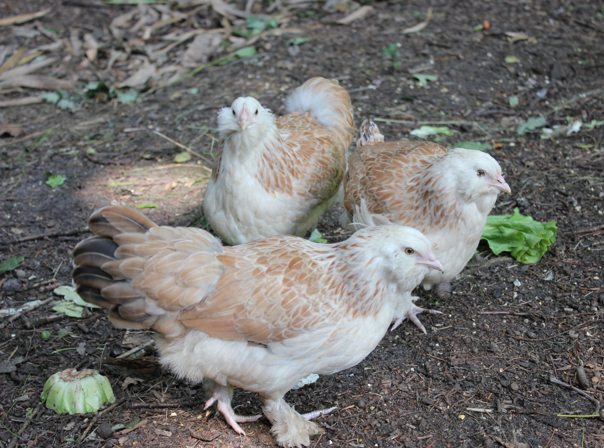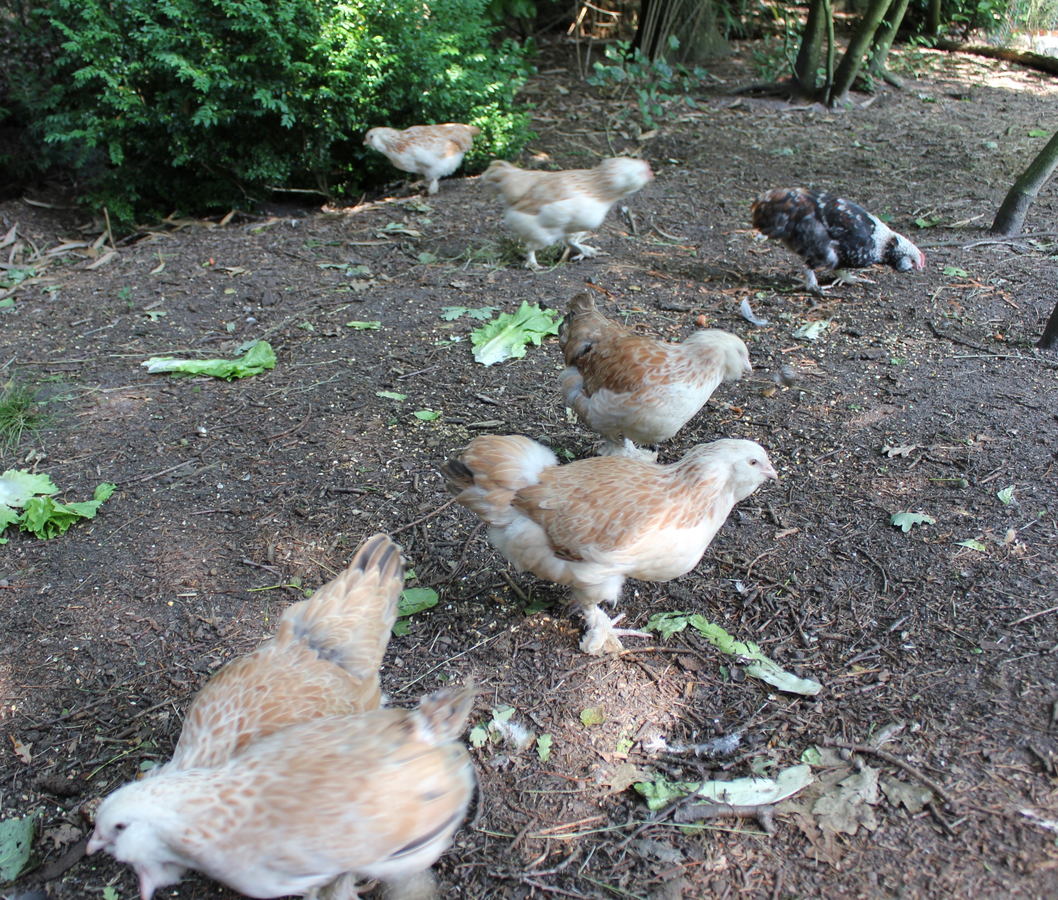 And here then a few pictures of our bantam Faverolles. I find the very fine kadam because they are not aggressive towards each other, almost not brooding and just look very nice! The dark colored, top right, is the rooster.