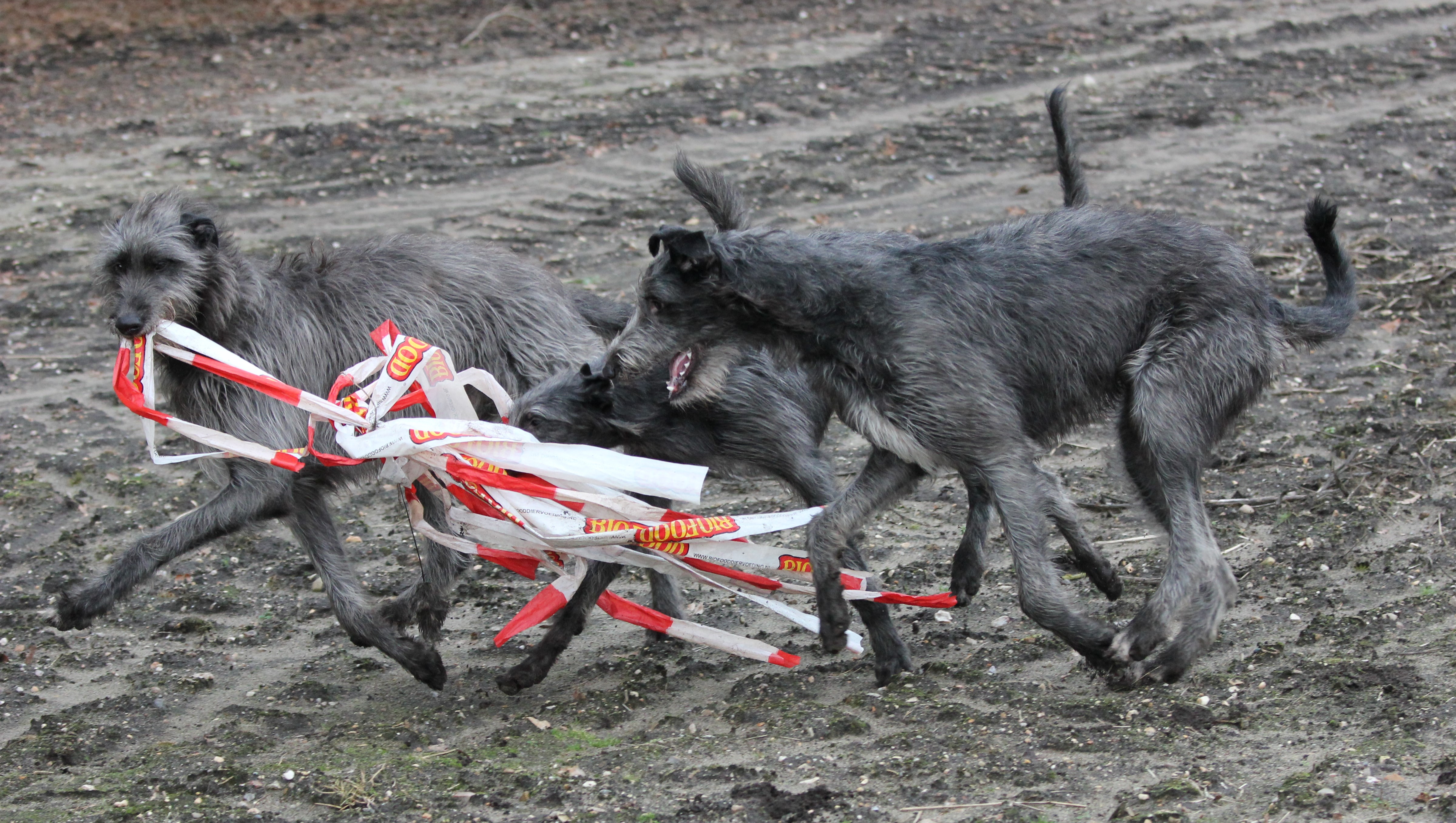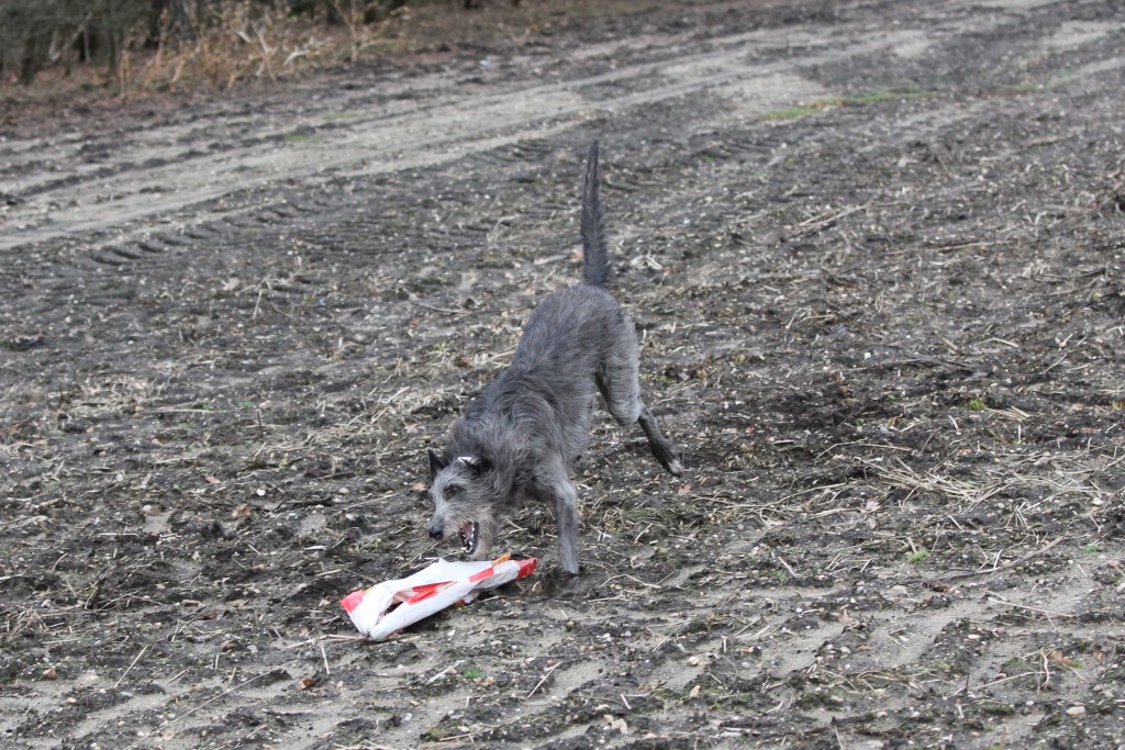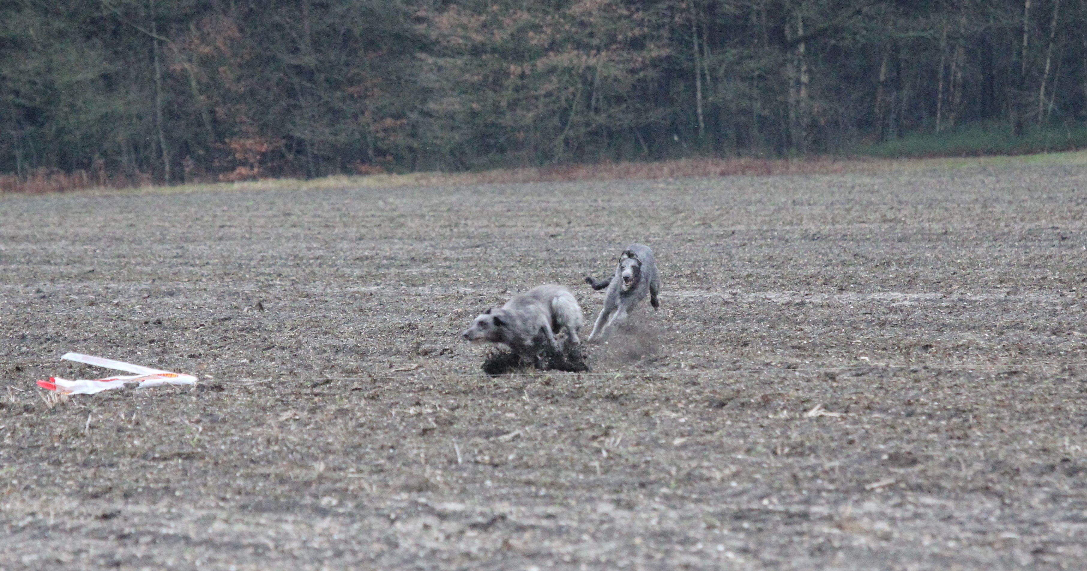Friday the 23rd we left for Amermont, Belgium. Here Cytaugh and Chidish would run their first game. Finally we were able to join again and we felt like it! It was like old; Camping on a field where the cows are from and everything is on his thaw. It was perfect coursingweer although the terrain was pretty hard by the preceding dry period. The Deerhounds walked on Saturday and to my great surprise there were six Deerhounds reported and also present, 4 bitches and 2 males. This meant that the CACIL could be forgiven. Cytaugh and Chidish walked very convincingly and especially Cytaugh followed the hare nicely. But after the first turn, Chidish was at the top with 265 points followed by Cytaugh with 263 points. Kilbourne Norma Jean received a disq. Because they did not ran, Laïs Palantiri had 218 points, Limelight Palantiri 256 and Livingston Palantiri 261. That became even more exciting because could Chidish and Cytaugh continue to retain these places? In the second round they were thus grouped together and walked Cytaugh again neatly behind the hare while Chidish anticipated and cut off here and there. Chidish showed more passion and strength. He was therefore first at the shelter and made a nice flying kill, as far as that can with a