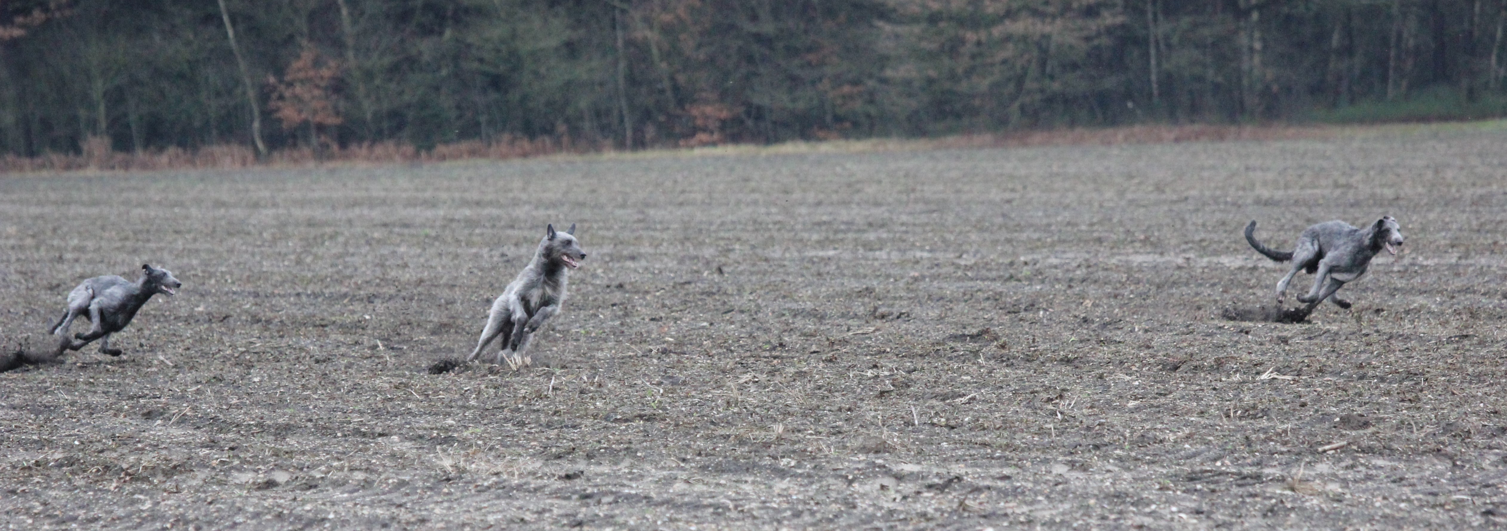 When I remember the French Championships in Guignicourt, sometime in the last century, the hounds had to jump over a flowing stream of about three metres wide and covered with pebbles and pebbles. Many hounds jumped into the creek or against the shore but there was no one who complained about it. Coursing is imitating the real hare Hunt and that happened here! And so it should be everywhere but the problem is that people do not train their hounds. With hours running on the leash, they do not learn to use their eyes and to cope with their bodies and they really need it with coursing! I hope that the coursing in France is still a bit of what it was then because with my two youngsters I am eager to go "real" coursing.