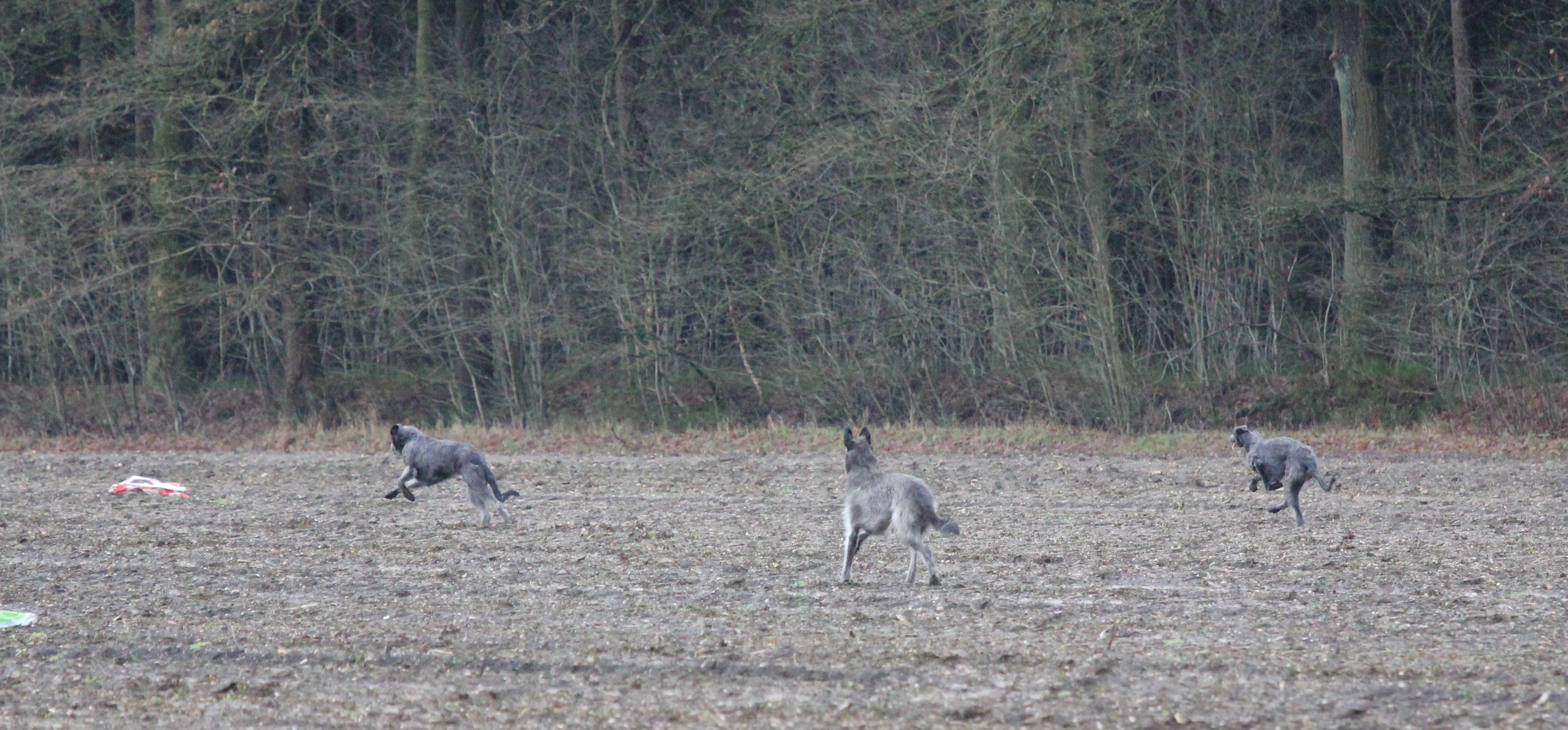 Chidish and Cytaugh are terrifically fanatical and ran really well. For the second course add Brandir to them. He started very well but halfway saw something in the woods. He suddenly stood still with his ears straight up. Then he cut off a portion of the course and made the kill as first.