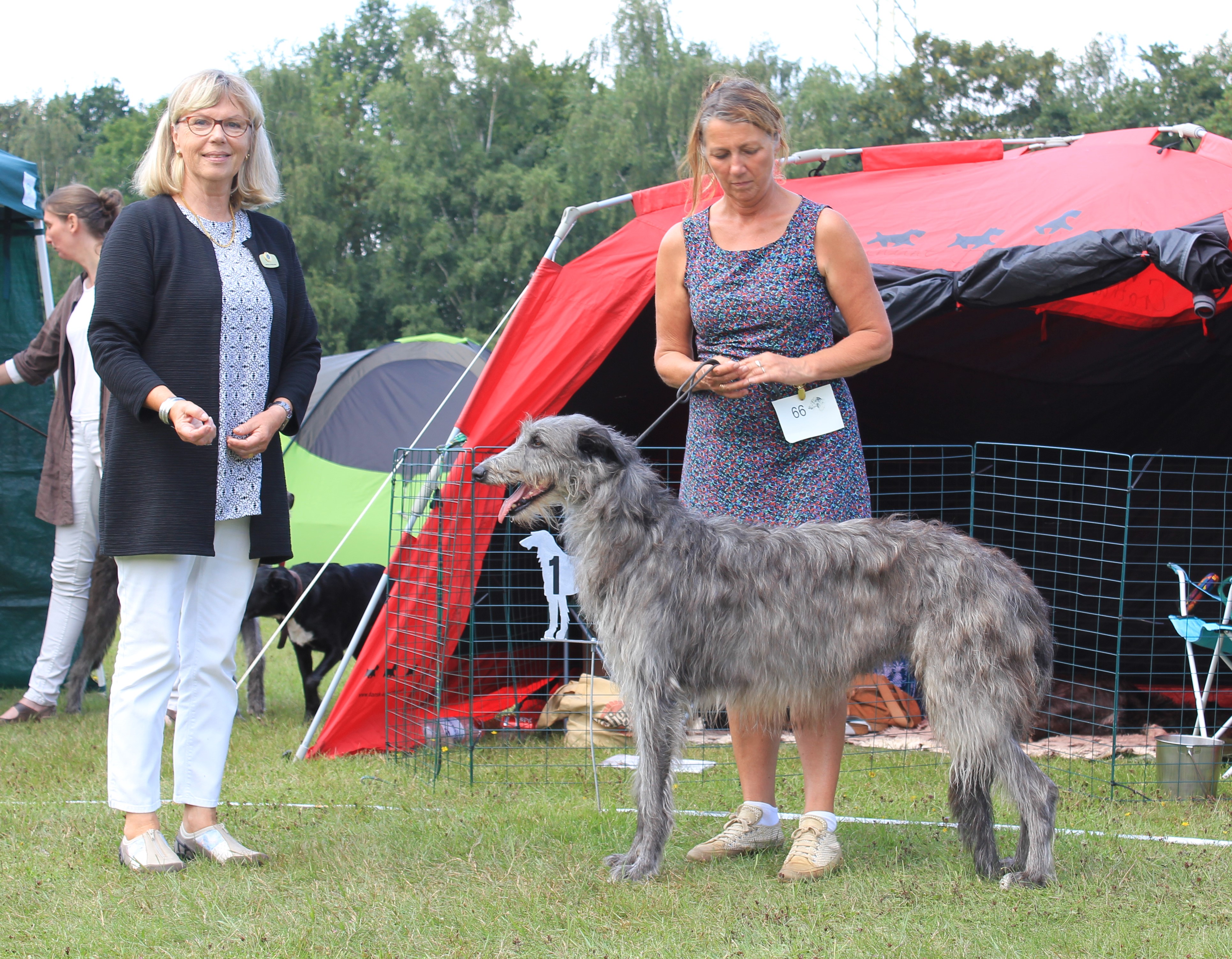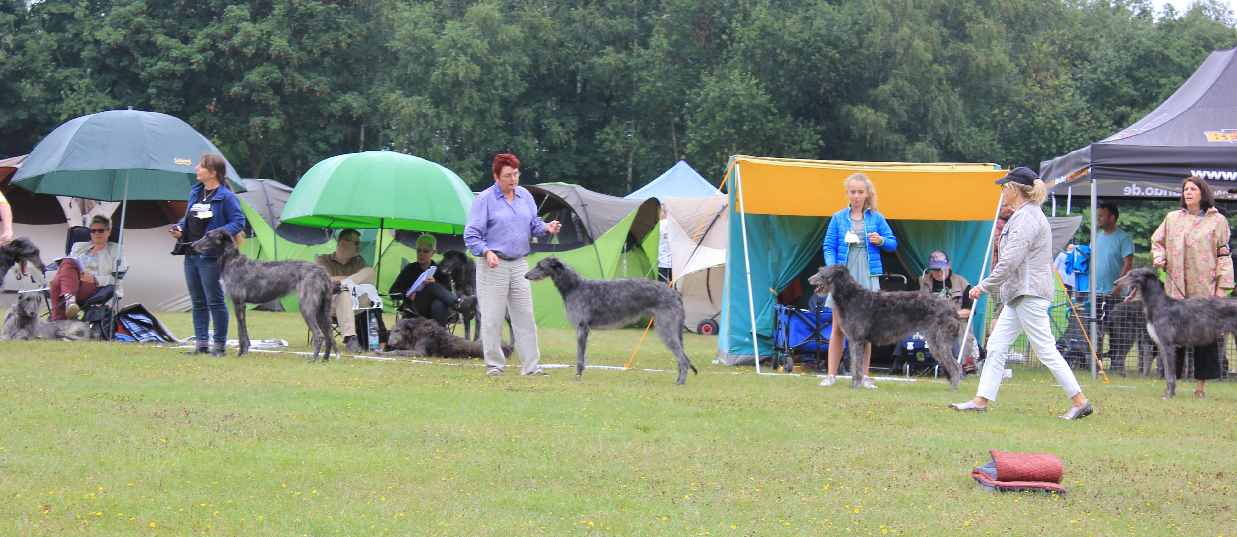 On Friday 5 August I left with Brandir, Chidish and Cytaugh towards Gelsenkirchen where on Saturday the Deerhound Jahresausstellung took place. Sonja came from the other side and we would make it a weekend of fun. Our judge was Mrs Ingela Kyrklund from Sweden. A total of 84 Deerhounds were reported including 29 males and 55 bitches. 1 male and 5 bitches were absent. The veterans and the babies started, then the Jüngstenklasse in which Vision had to take on 4 other young girls. She did it exemplary and showed her super-gang work optimally. The judge couldn't get around her and placed her first. After that she had to compete against the