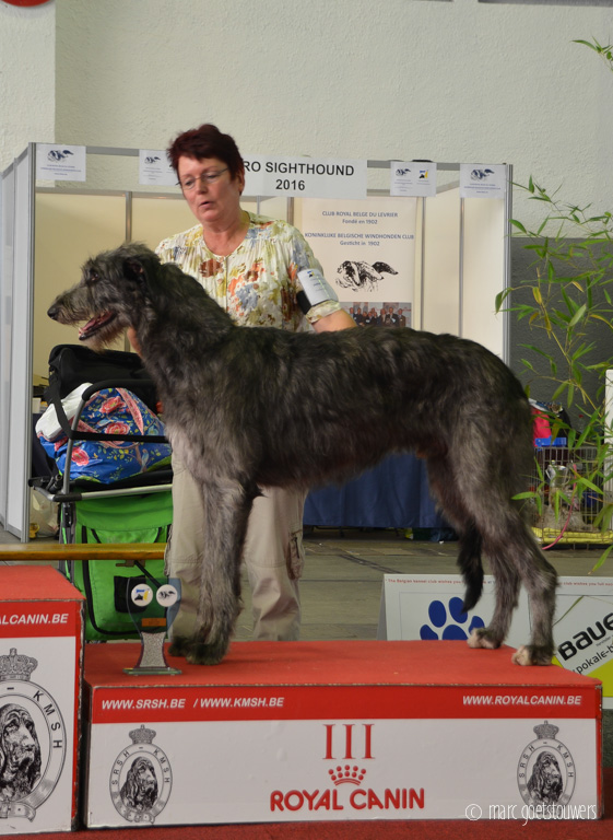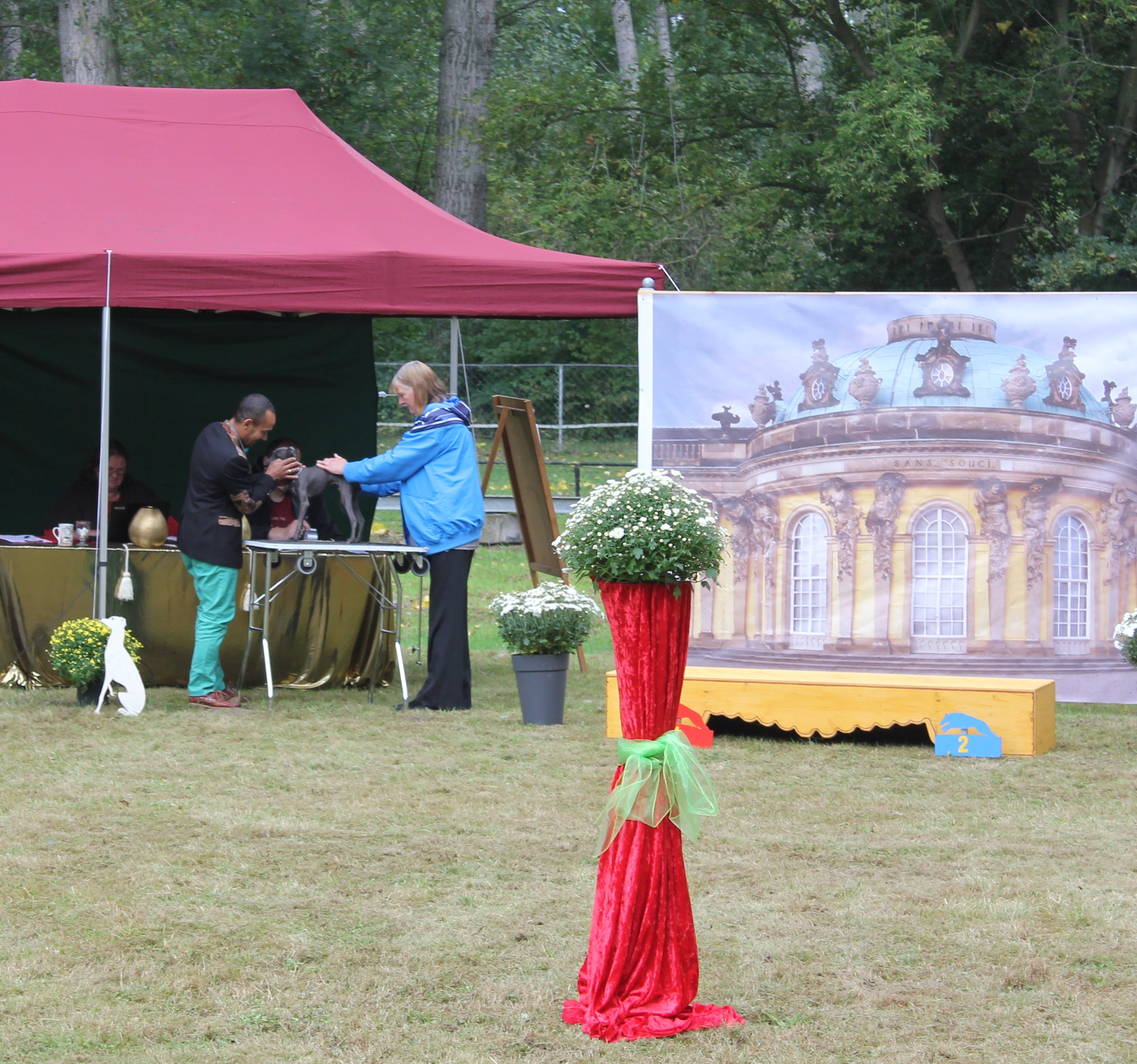 Sonja would stay with us for the rest of the week to show on the 26th of August Vision at the Euro Sighthound show in Brussels. Simon was invited to judging a coursing in Poland on 27 and 28 August and could not fit on Brandir, Bernice and Silva. That's why we had to take all the hounds and since No 6 Deerhounds can sleep in the camper I went with my car so that Brandir, Chidish and Cytaugh could stay in it. Thursday 25 August we travelled to Brussels in the afternoon. It was bloody hot and at the big parking place there was no shadow spot on hand. I had already asked if there was power but unfortunately this was not the case, so we could not use the fans we had with it. The man who shared this thought it was also more than scandalous that there was no electricity for that money which we had to pay per night. Luckily we had enough sheets and other things taken to create a shadow spot. It soon became clear that no water caste and toilets were present! This is very annoying if you only stay in your van and you have assumed that there are at least water and toilets. This gave for different people so real problems. Friday was the Euro Sighthound Show. We had Chidish, Cytaugh and Vision reported for Judge Jean Jacques Dupas from France. There were 5 males and 6 bitches reported. Chidish became best male and best youth dog,