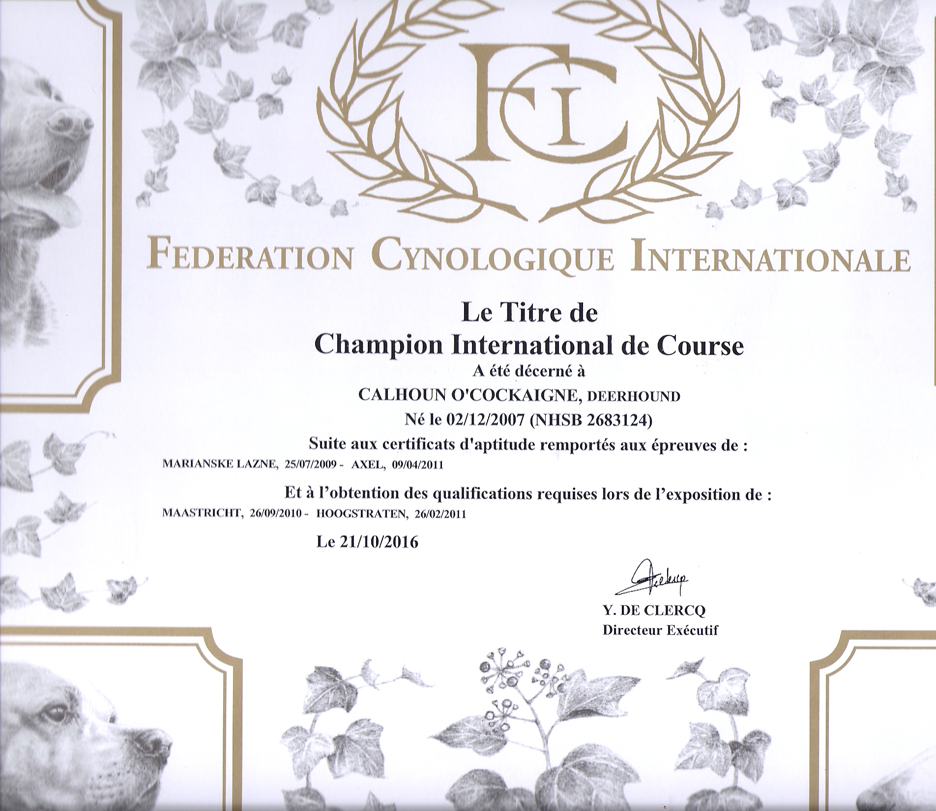 Last year I was still very enthusiastic and proud that my Calhoun O'Cockaigne had won the European Coursing Championship, on 1 July this year I received a letter from the Board of directors that the FCI has withdrawn its title. How can this be? To keep a long and difficult story short, it is tantamount to saying that, on the basis of statements by Frank Schmidt and Mr Martin Haas, both from Germany, the FCI believes that Calhoun would have walked his two qualifying matches too young.