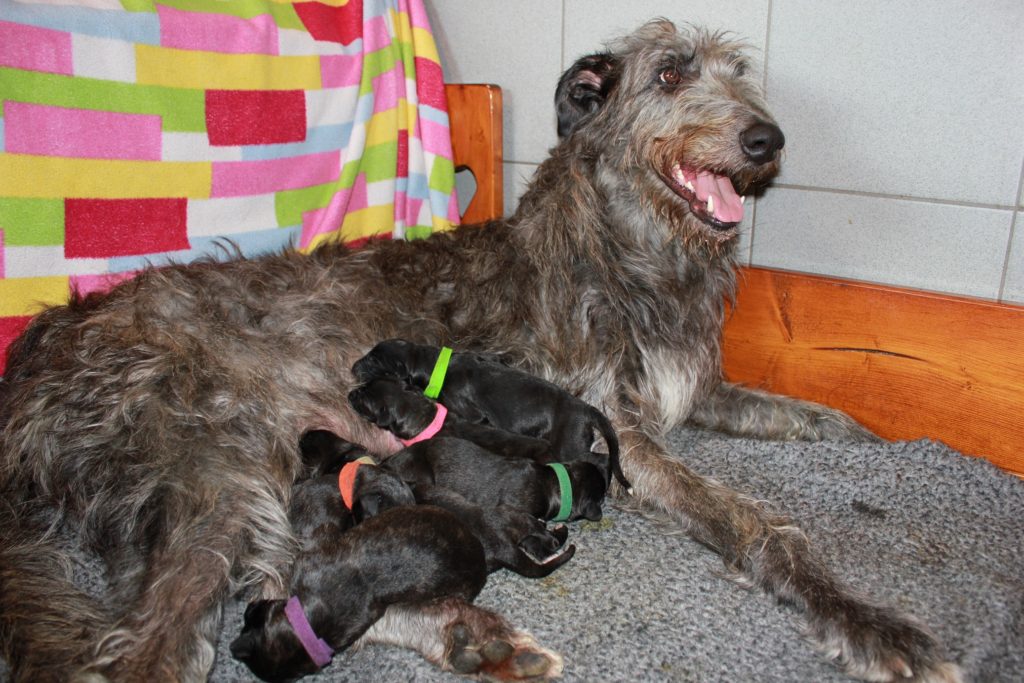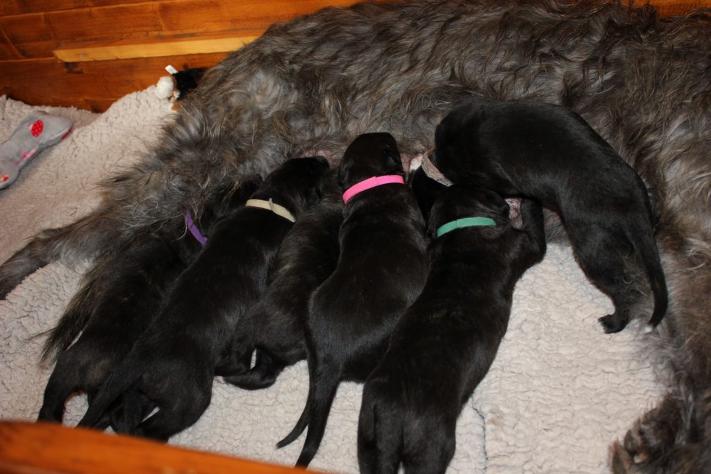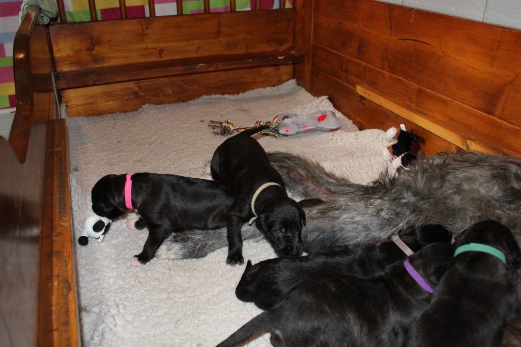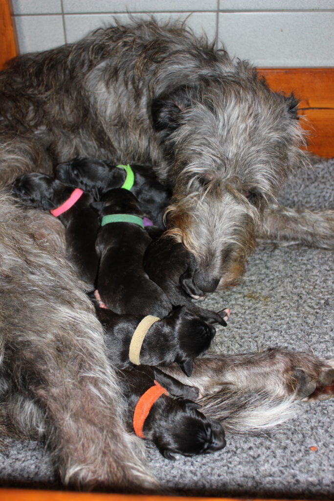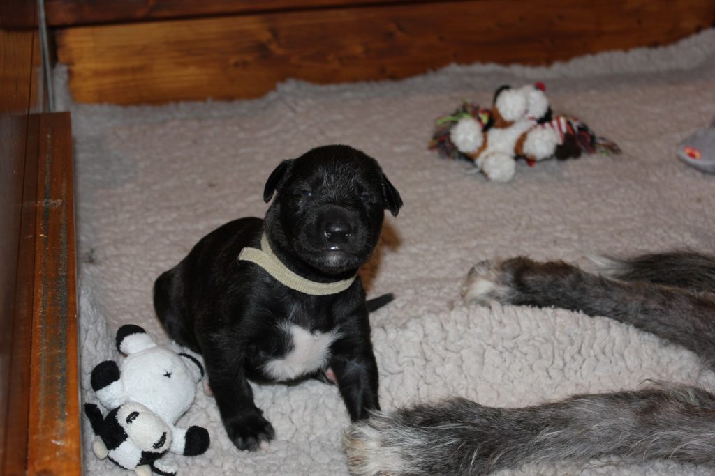 Olórin is a fantastic mother, she leaves them no second alone and keeps them clean. She has a lot of milk and the puppies look like this; Thick and round with a nice skin. When you pick them up they feel very firm and they are well active.