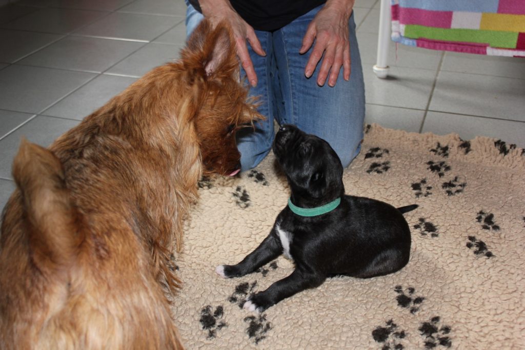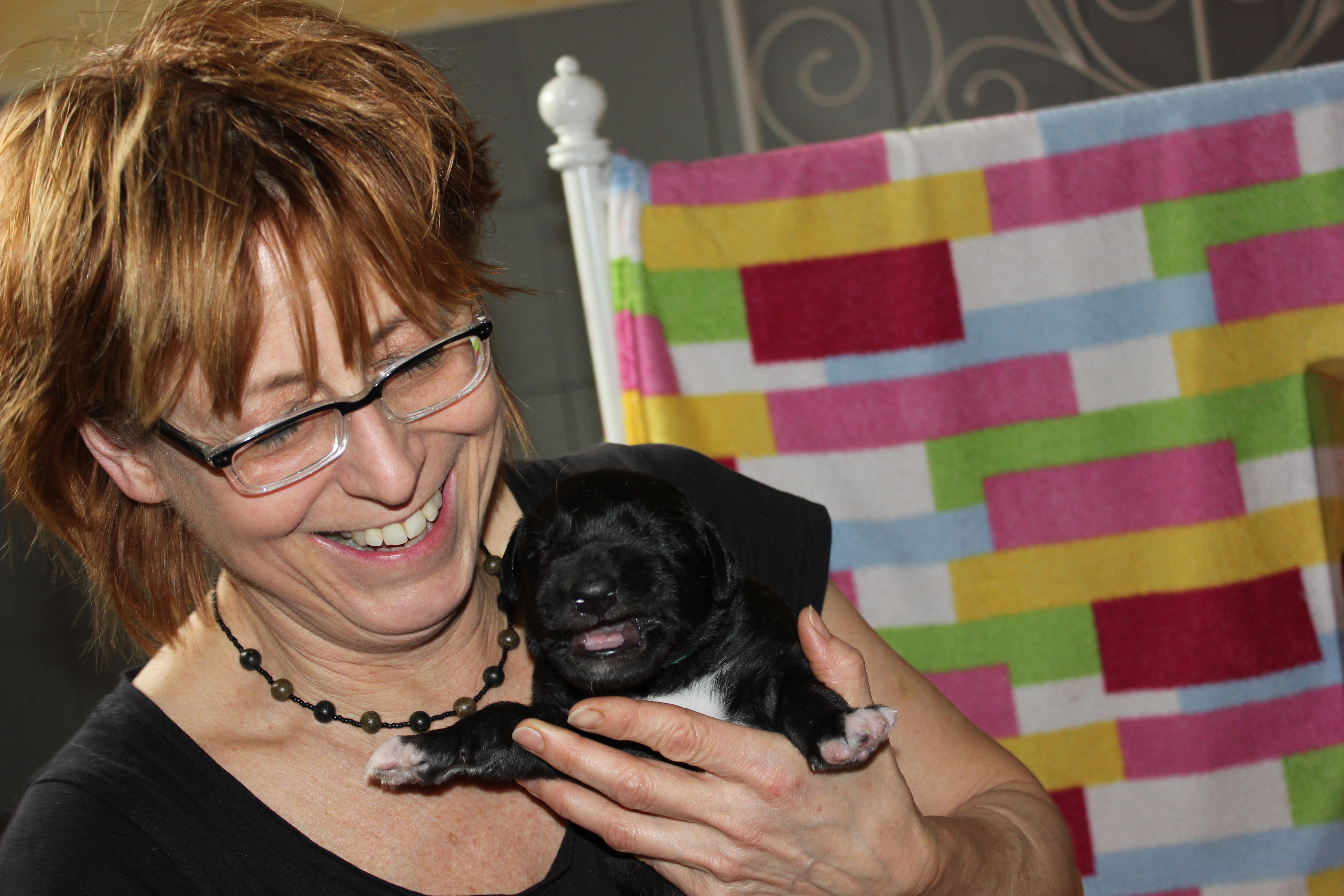 I had agreed with Iris and Marijn to judge the puppies and to take the picture on Sunday. Of course Sonja also wanted to see the puppies. They were 9 weeks old and there were clear differences to observe. Our favorite, the dog with the blue collar, still heads and shoulders above the others.