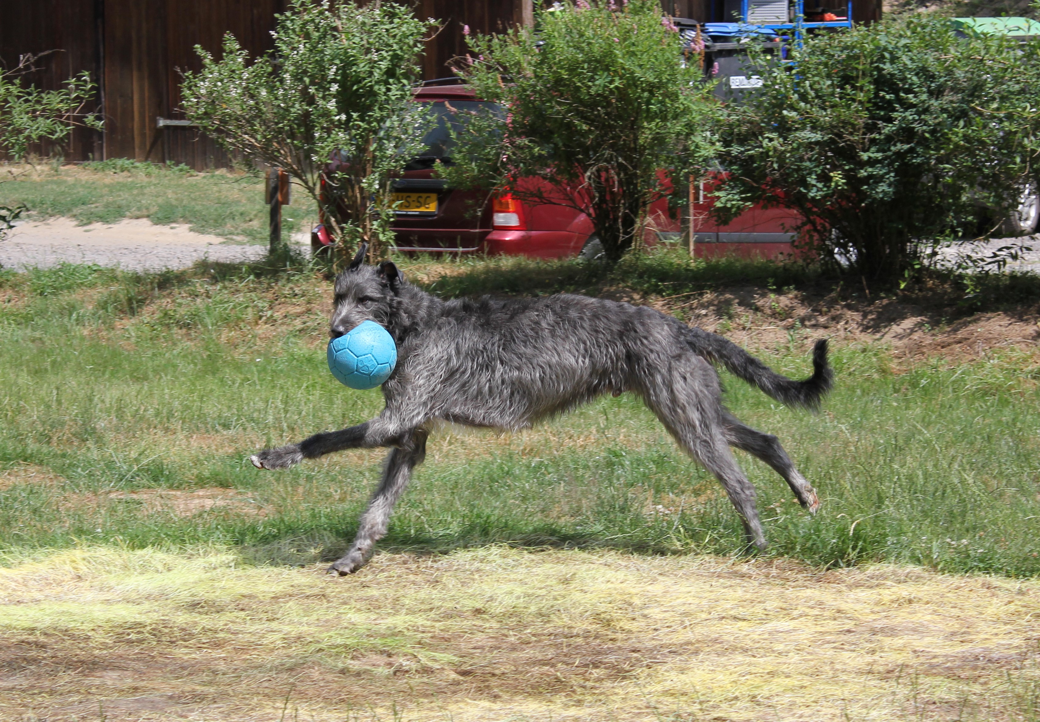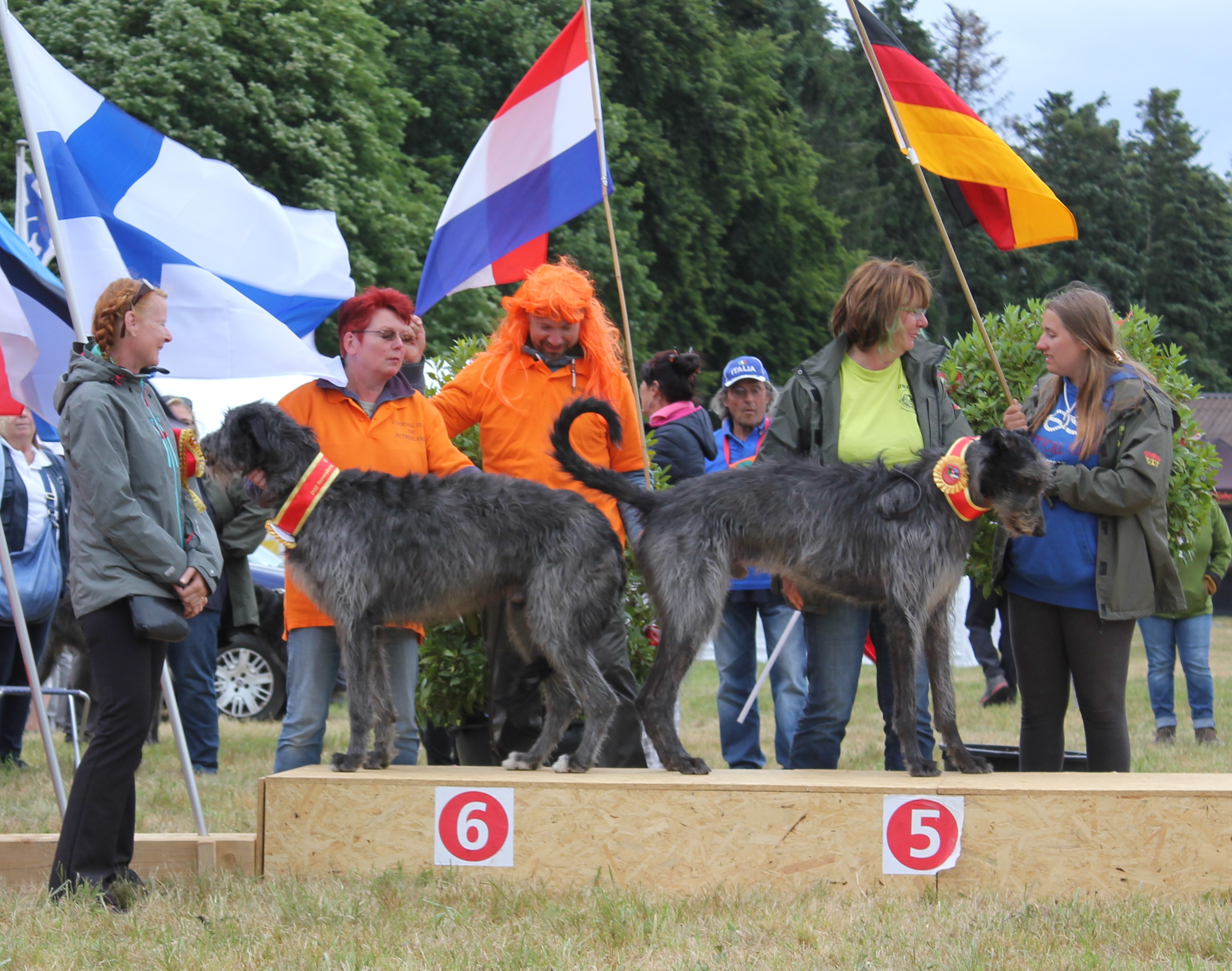 There were 16 Deerhound bitches reported of which 14 are present. All 11 males were there including three that are absolutely untrustable in the reception or, very aggressive. We had agreed beforehand that if Chidish were to be classified with one of these etters, he would not walk. What was I happy when it appeared that he had been classified in the first circulation with the German male Islay's Kurt Cobain. Chidish and Kurt Cobain had the very first course with the males on the ' red ' field.