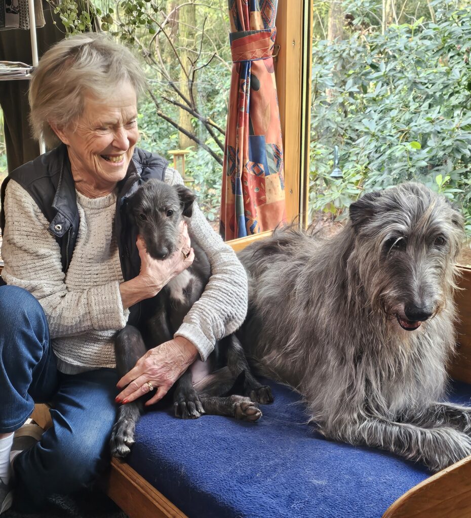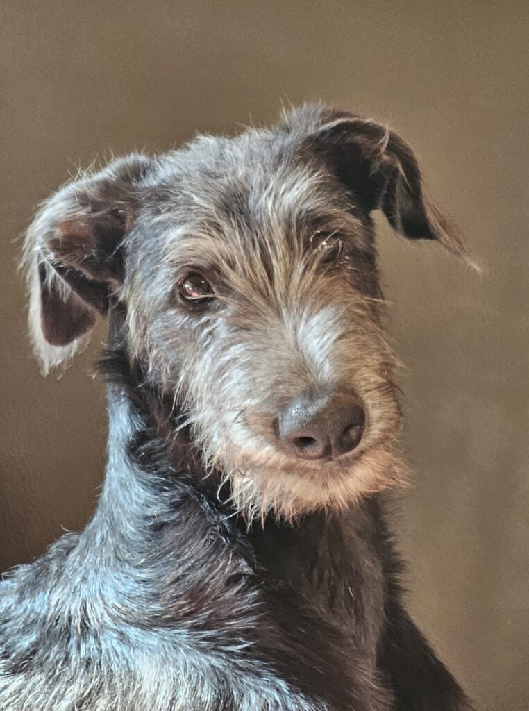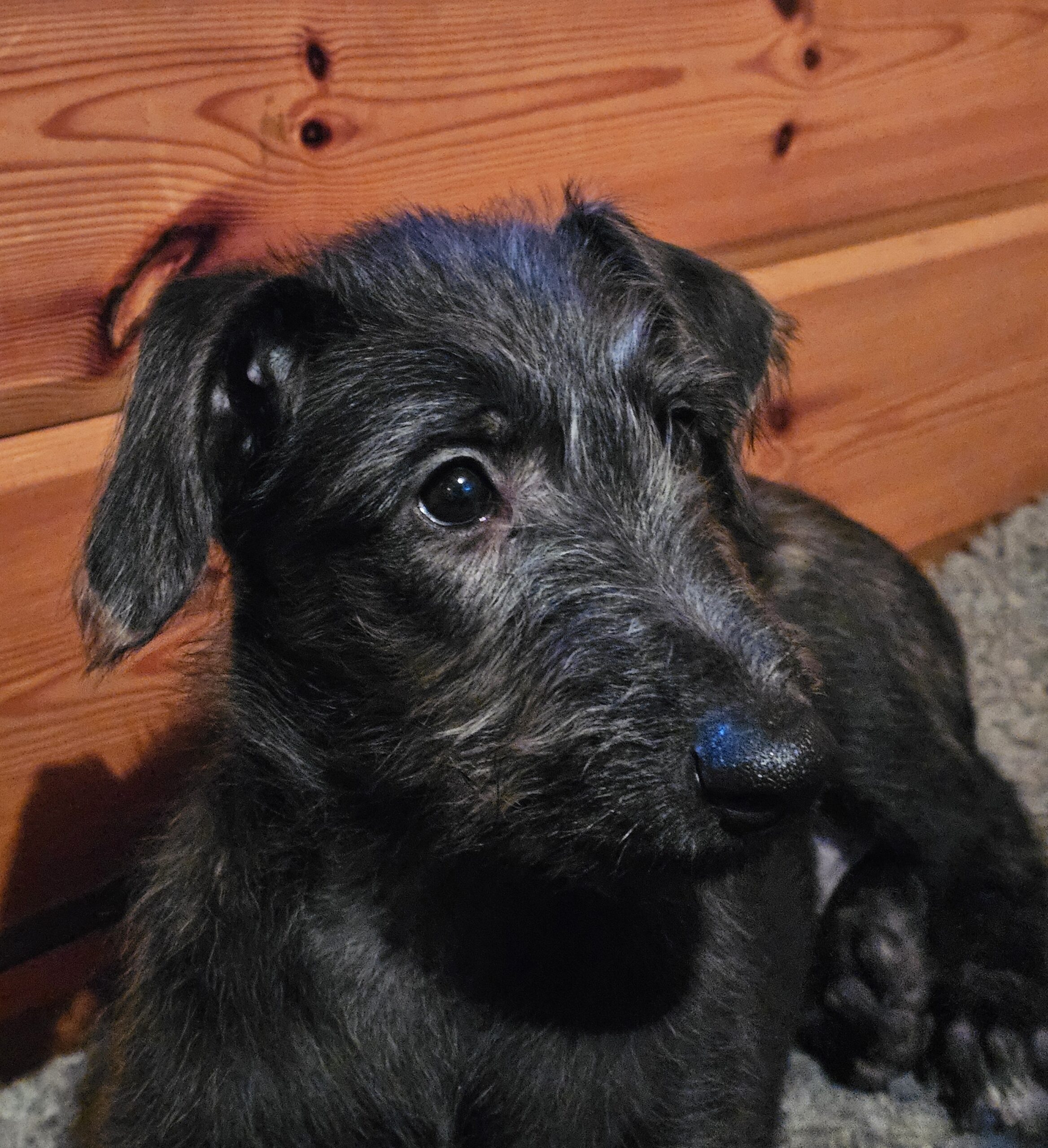 We have shown Cephyr a few times in the puppy and junior class. The first time she received 1 Promising and Best Puppy out of 2. The next day she was 2 Very Promising. A week later she was also 2 Very Promising. On August 31 she was first again and Best Junior Female, and during the Deerhound Jahresausstellulg in Germany she ended up last (5th) with a Very Good.