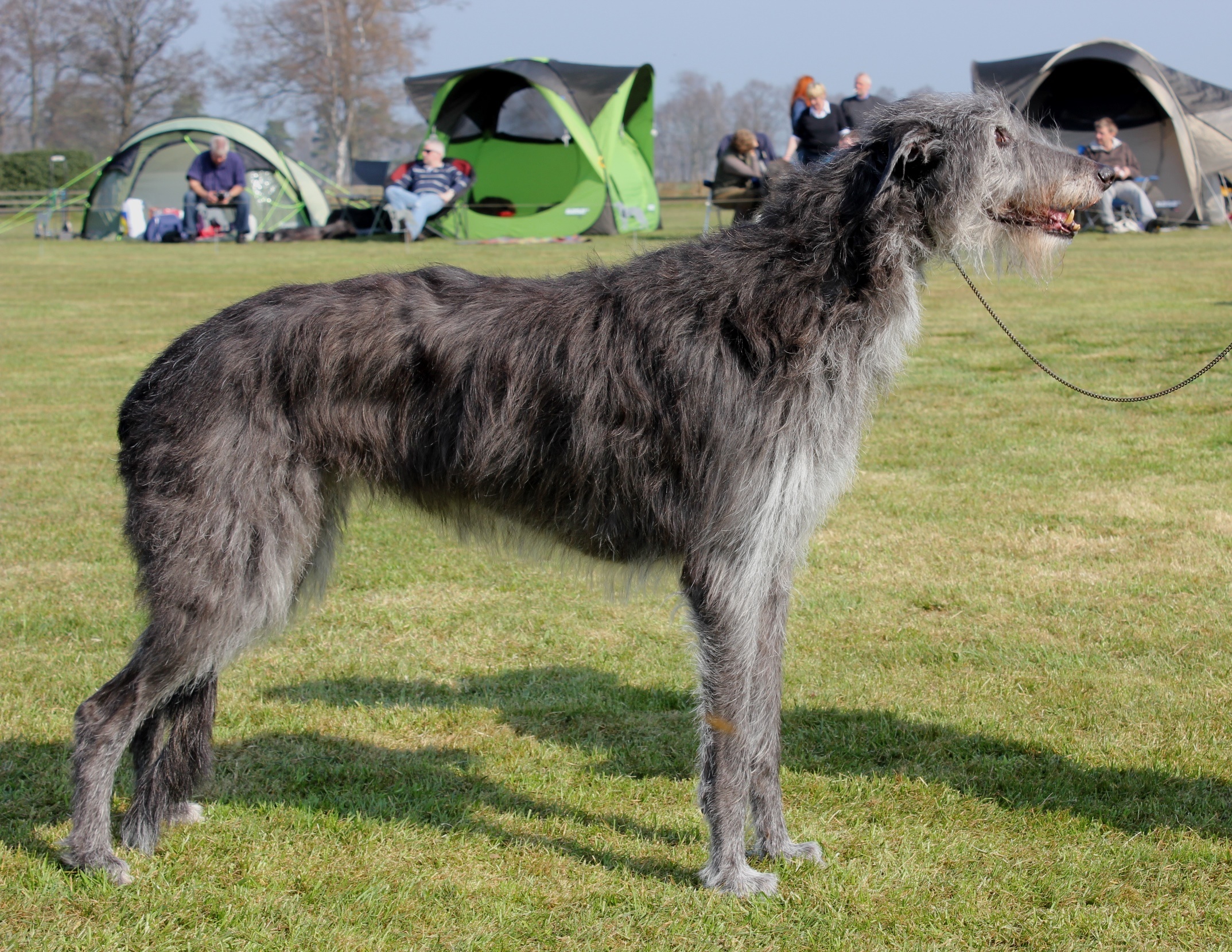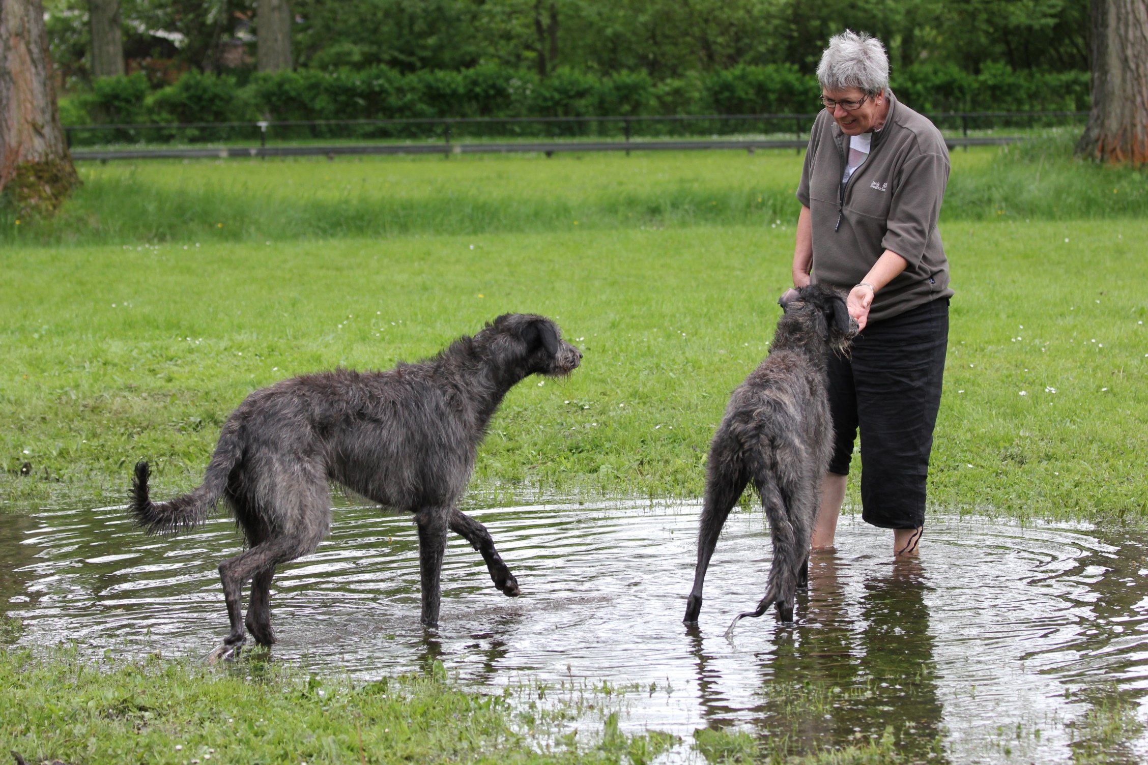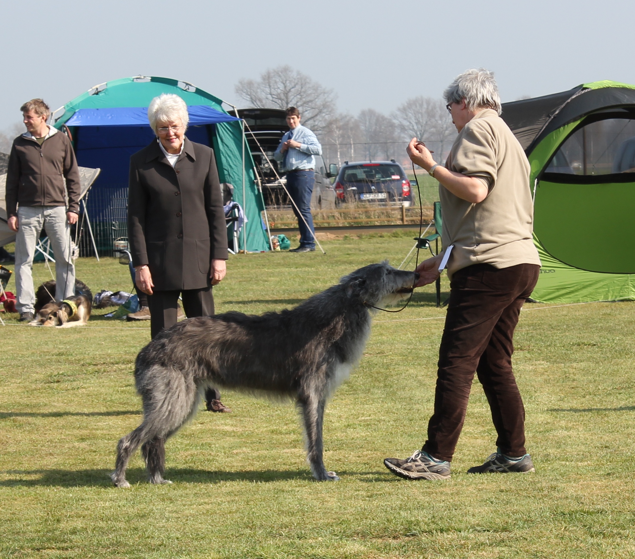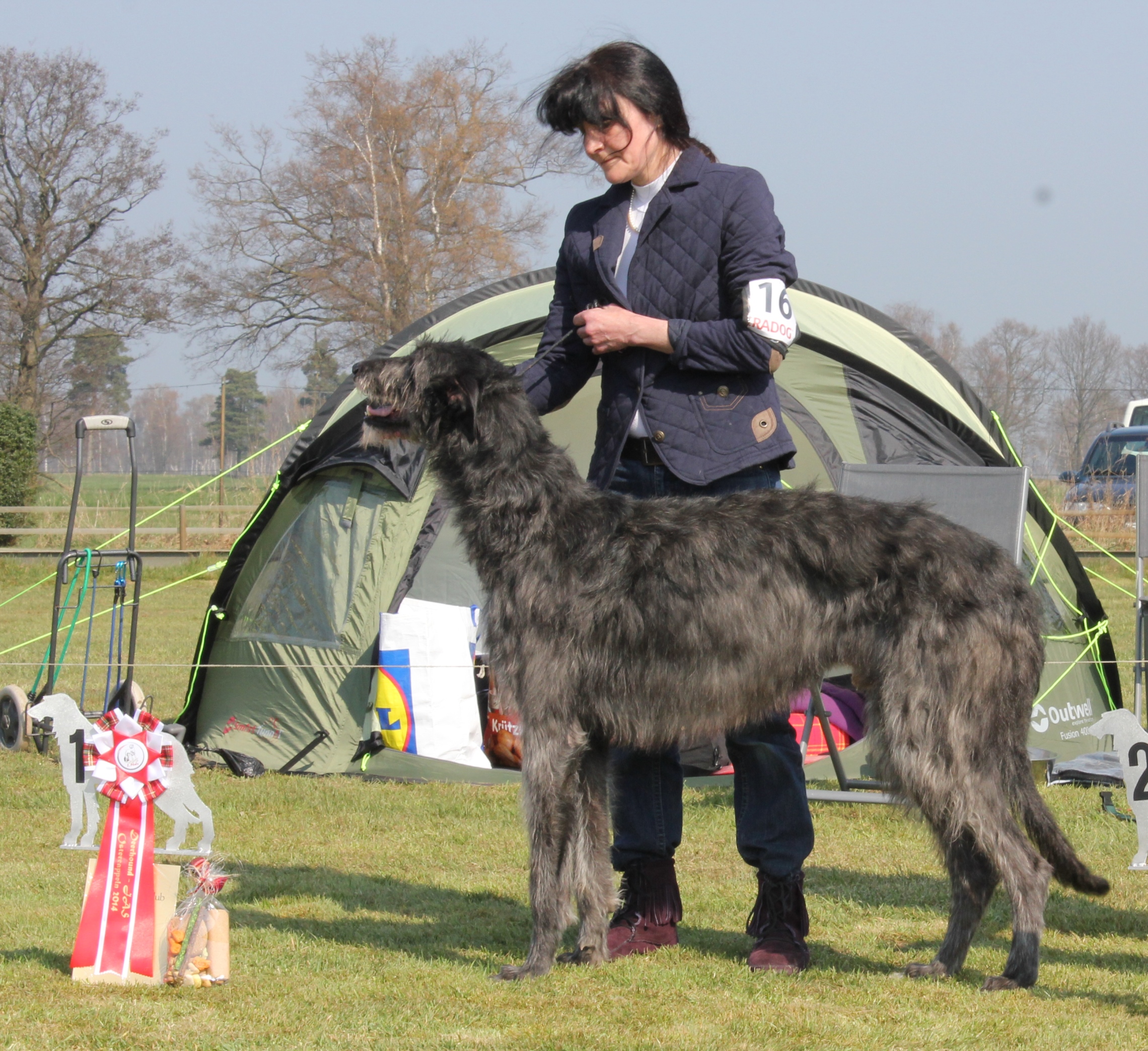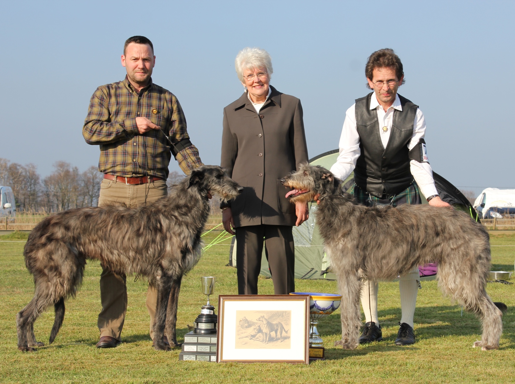 ed back, which had walked enough for the rest of the day! And Simon had enough stress for the rest of the weekend, which left Calhoun (fortunately) no more loose! The weather was extraordinary, almost 30 degrees but with a little wind so it was still well toefen. Only for a big walk it was soon too hot for our elderly club; 3 of 10 years and 1 of 11.5. On Saturday so the show, Sonja showed Brandir, Bernice and Silva. There were 9 Deerhounds reported, 8 present. Brandir and Bernice got their first YOUTHCAC and Brandir became JeugdBOB. BOB and BIS became the Kilbourne Harvest Moon, the brother of the father of Brandir and Bernice, living in Finland. Sunday, the coursing for which two Finnish Deerhounds were reported. One of them was blixen the Great Scott, this male had walked with Calhoun in the Czech Republic during the EKC in 2009. It was clear to see that he was a day old! Monday morning we all left again. We first went to Tüttleben to put our caravan there before the Pentecost weekend. From here we drove home on Tuesday.