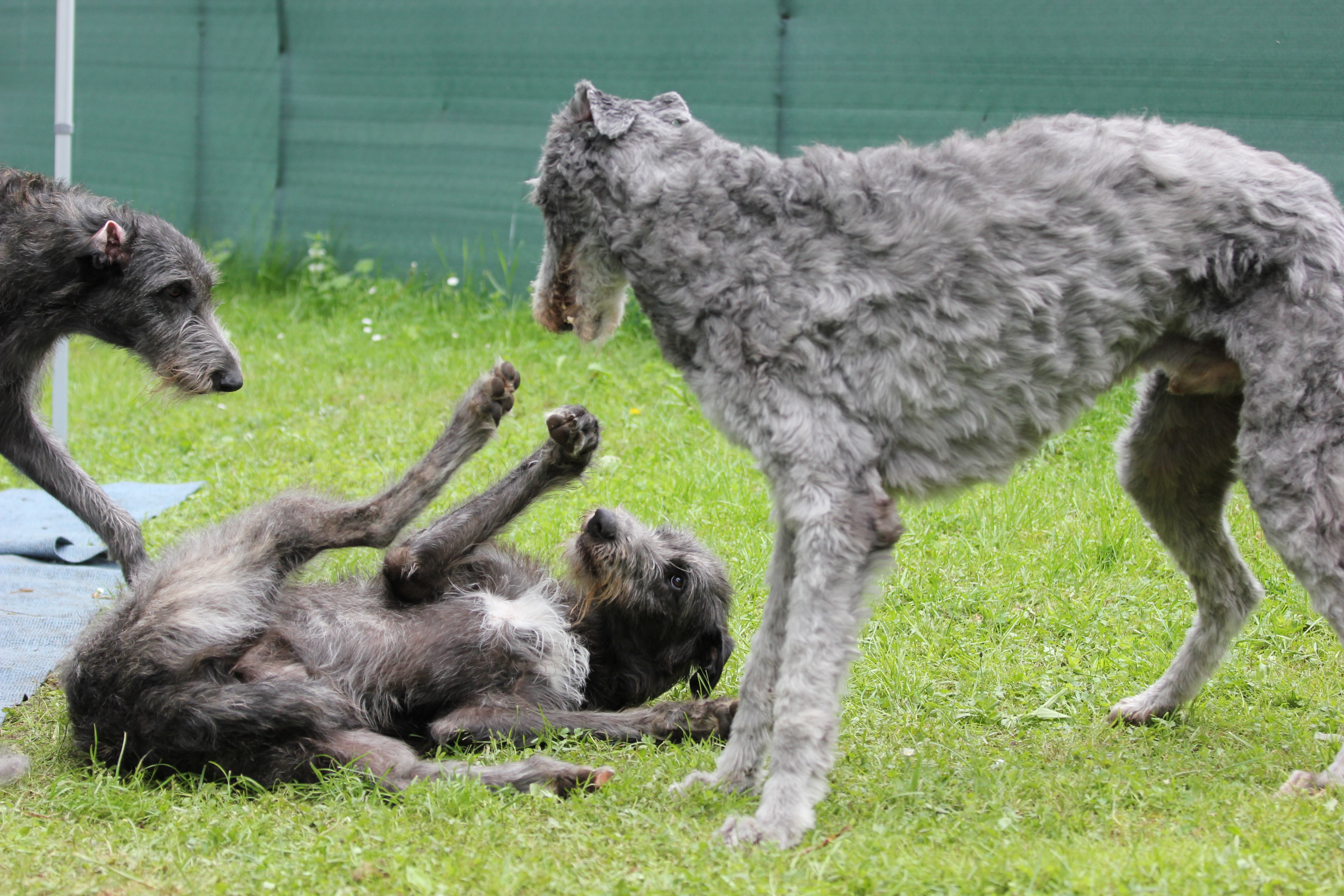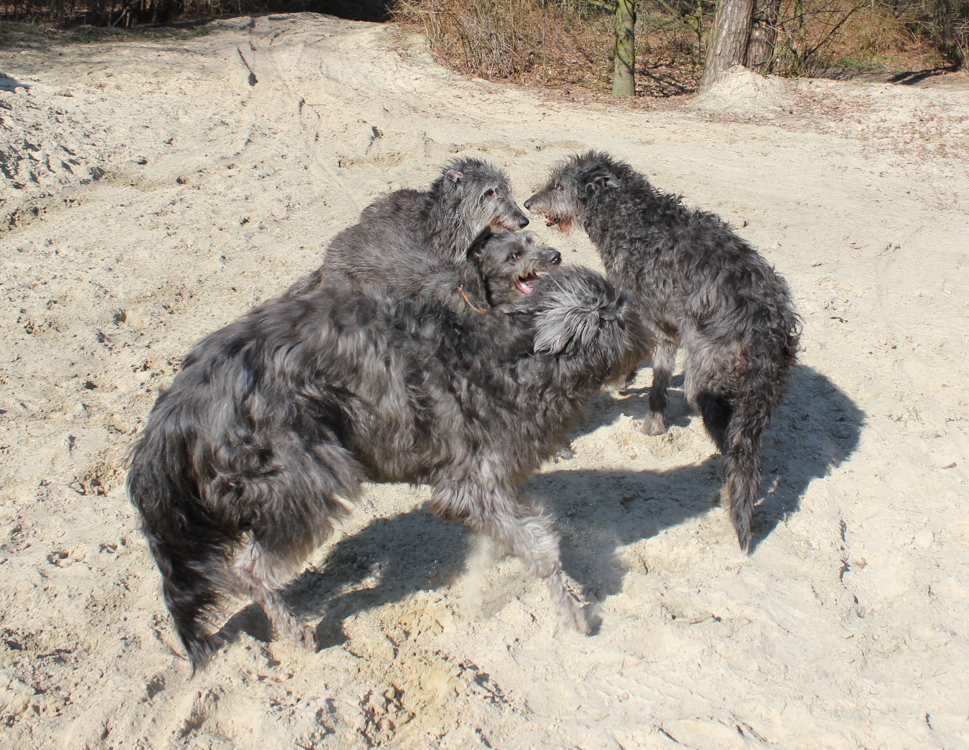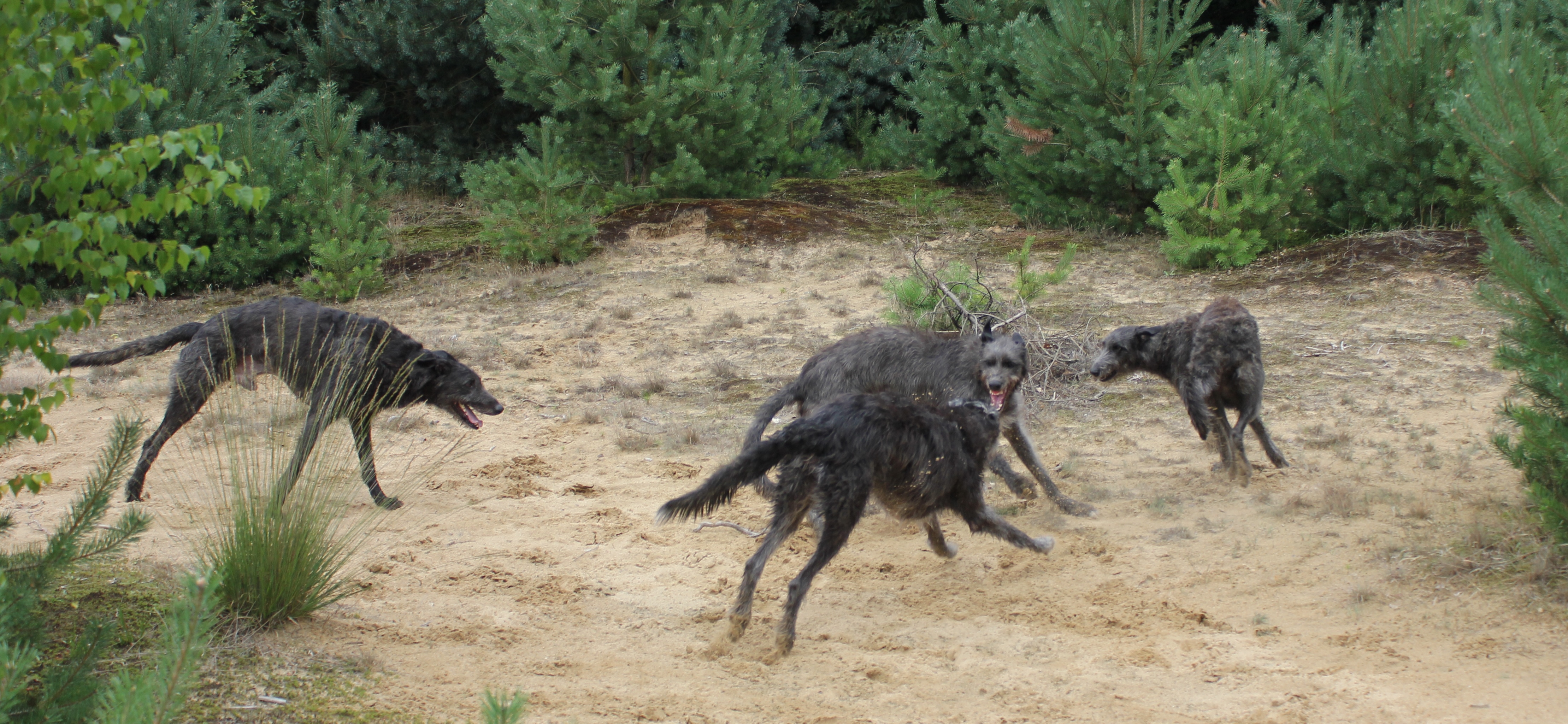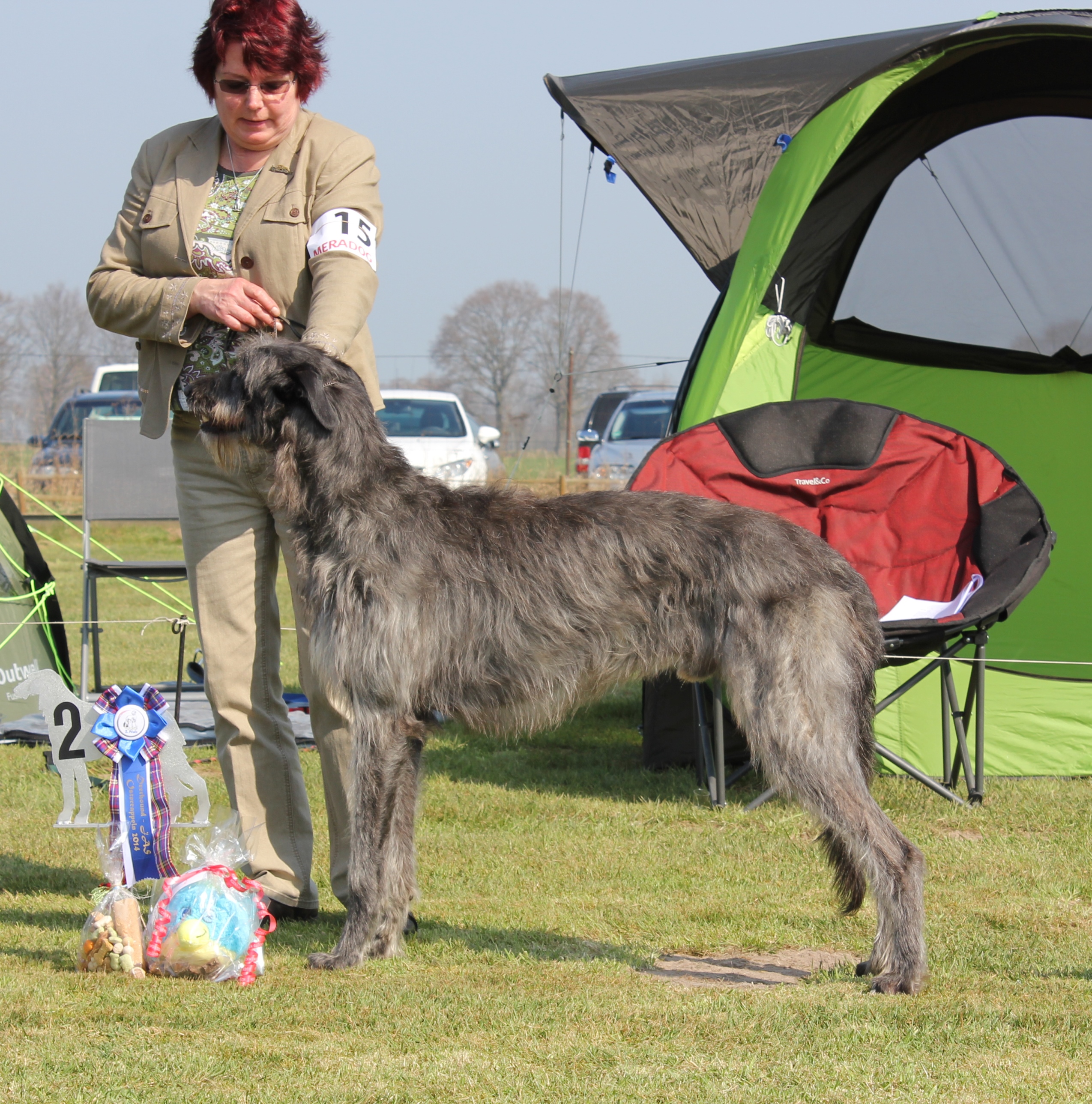 ed back, which had walked enough for the rest of the day! And Simon had enough stress for the rest of the weekend, which left Calhoun (fortunately) no more loose! The weather was extraordinary, almost 30 degrees but with a little wind so it was still well toefen. Only for a big walk it was soon too hot for our elderly club; 3 of 10 years and 1 of 11.5. On Saturday so the show, Sonja showed Brandir, Bernice and Silva. There were 9 Deerhounds reported, 8 present. Brandir and Bernice got their first YOUTHCAC and Brandir became JeugdBOB. BOB and BIS became the Kilbourne Harvest Moon, the brother of the father of Brandir and Bernice, living in Finland. Sunday, the coursing for which two Finnish Deerhounds were reported. One of them was blixen the Great Scott, this male had walked with Calhoun in the Czech Republic during the EKC in 2009. It was clear to see that he was a day old! Monday morning we all left again. We first went to Tüttleben to put our caravan there before the Pentecost weekend. From here we drove home on Tuesday.