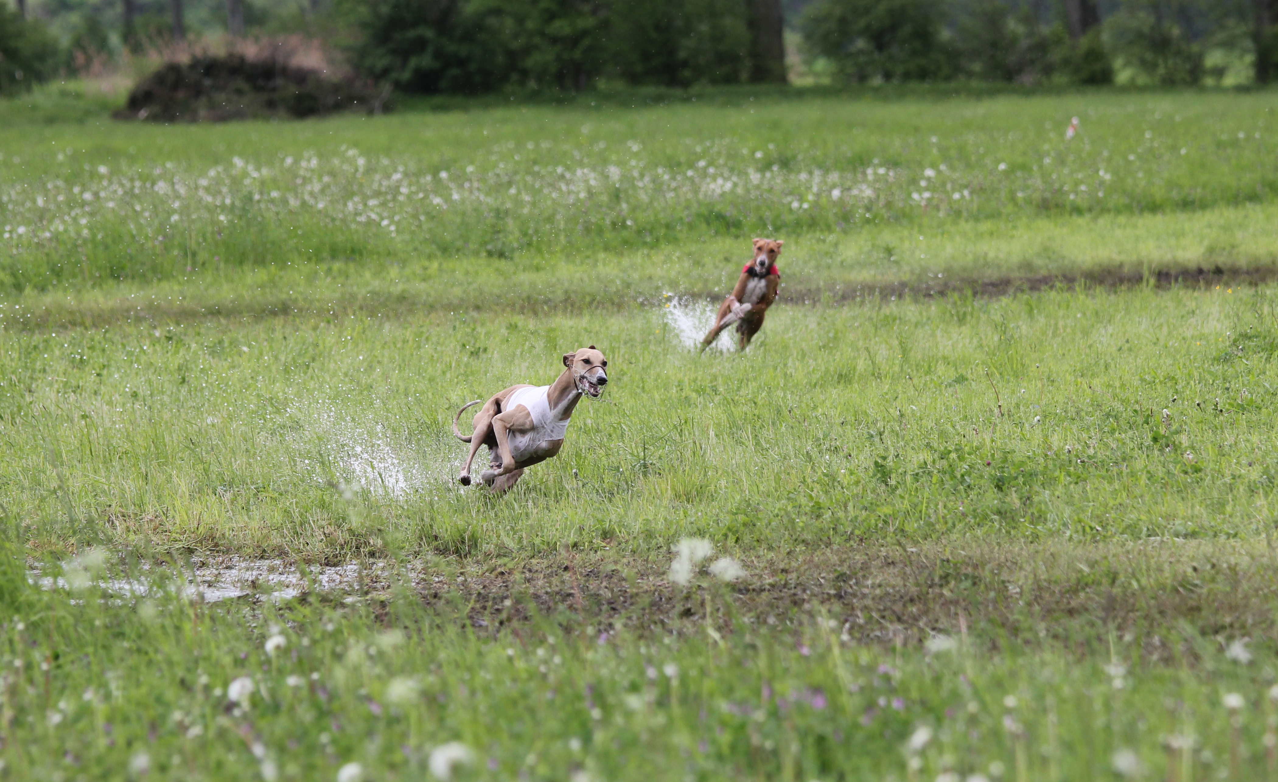 ay we headed for Berlin. The night was halfway by Sonja, Brandir did not know what he saw when his sister came to greet him! The next morning we drove all the way to Göhlsdorf, Simon was invited to join the international coursing judging and I was asked to approve during their CAC show. The coursing would take place on a large fenced lawn and fortunately the hounds could stretch the legs here on Friday afternoon. But of course there also had to be walked. Saturday morning, Simon, Angelika and Sonja went on the road and soon left the majority of the 9 hounds. It was immediately hit, several hares had to choose the Hazenpad and Calhoun got red wild in his nose and was right away. After a thick 15 minutes he came exhaust