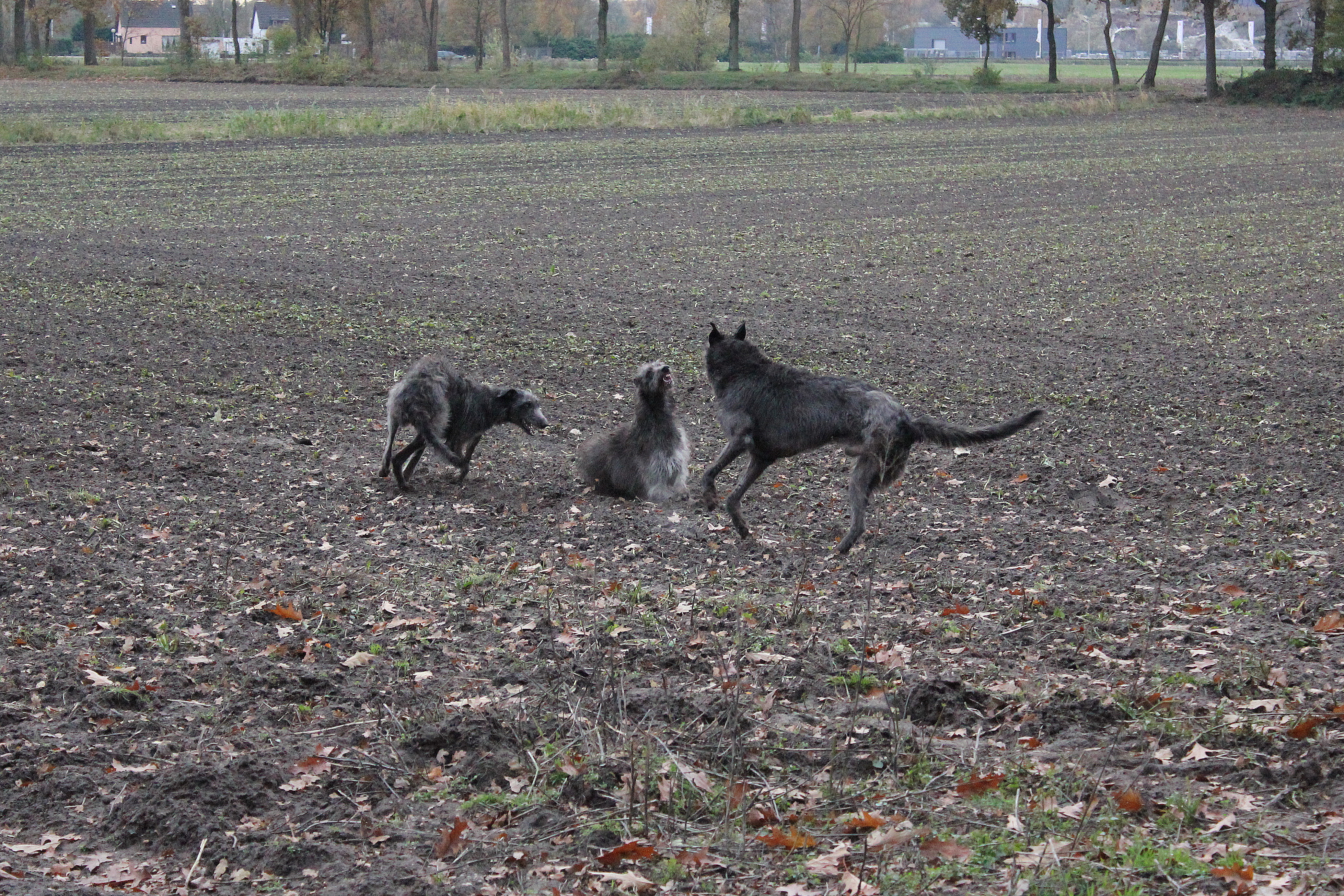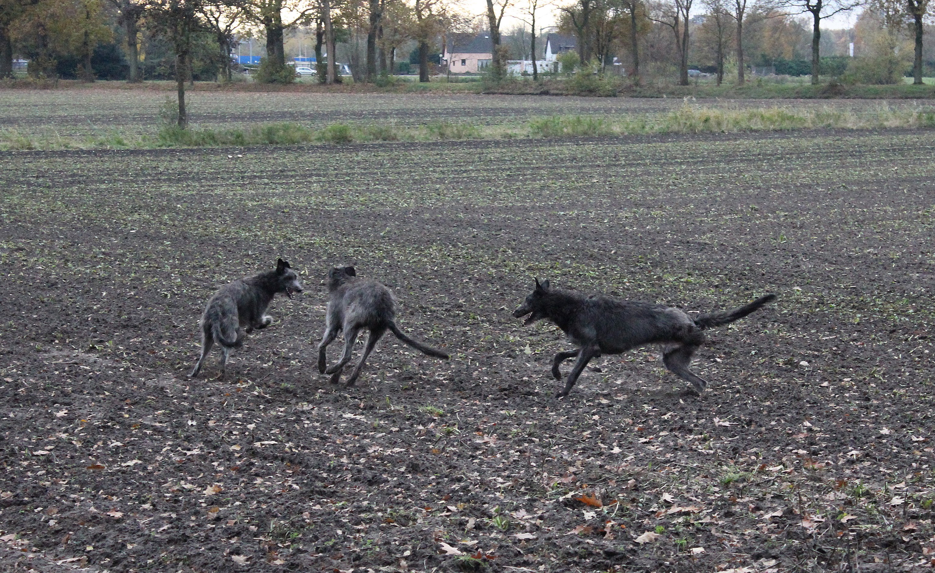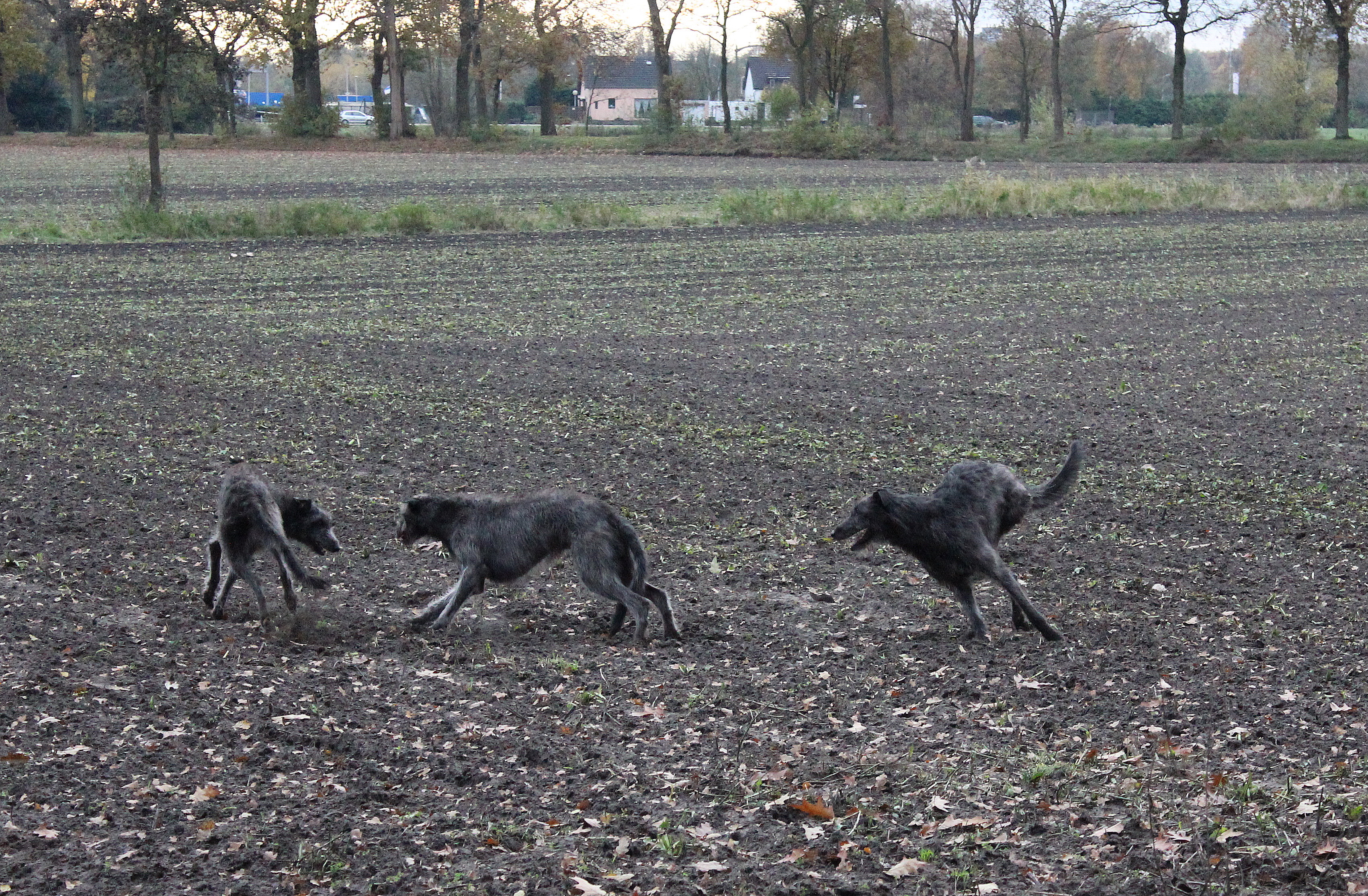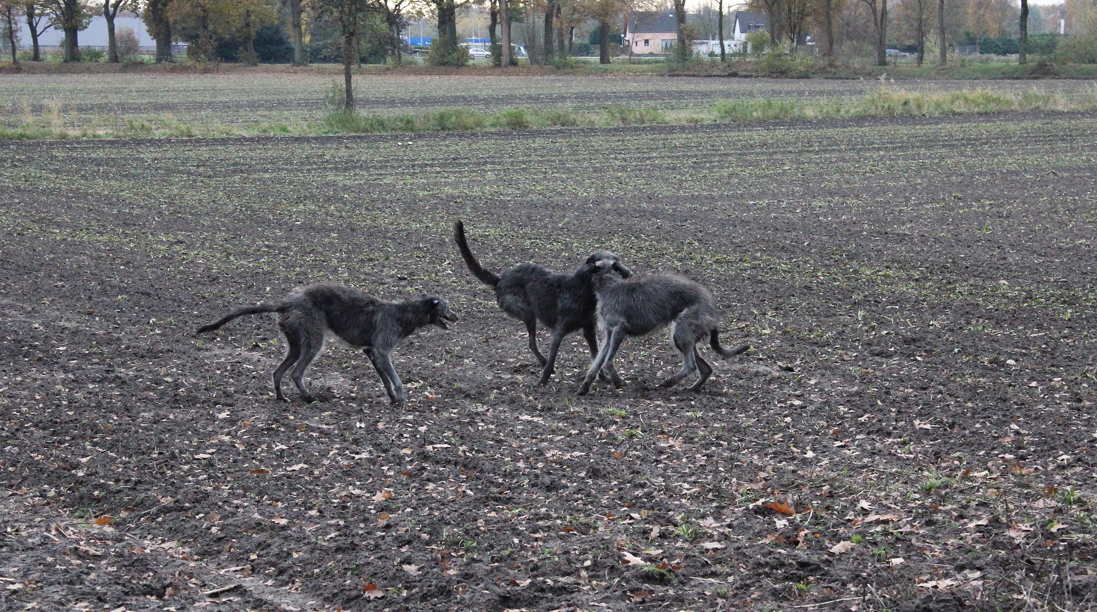On 24 September the WRZ held her coursing in Bergschenhoek. Again 4 Deerhounds reported but now partially others. In The first circulation Calhoun ran together with E'Lynnhe Palantiri of the family humps. Calhoun felt "something" and started badly. He is becoming more and more sensitive, which is certainly at the disadvantage of his coursingprestaties. Caintha ran with Islay's Hannah, also from the family humps. In the second circulation were Hannah (155 pnt.) and E'Lynnhe (156 pnt.) divided together. E'Lynnhe, who had just been running, gave up the chucked and got a disqualification. Caintha (152 PNT.) was allowed with Calhoun (149 PNT.). Again Calhoun started badly but Caintha walked so excited that Calhoun was still going along. Hannah became first with 311 PNT., Caintha second with 309 PNT. and Calhoun third with 279 pnt. Caintha obtained her second CACNL and in combination with the previously obtained show results I can get the title "Champion of Beauty and performance" for her applications.