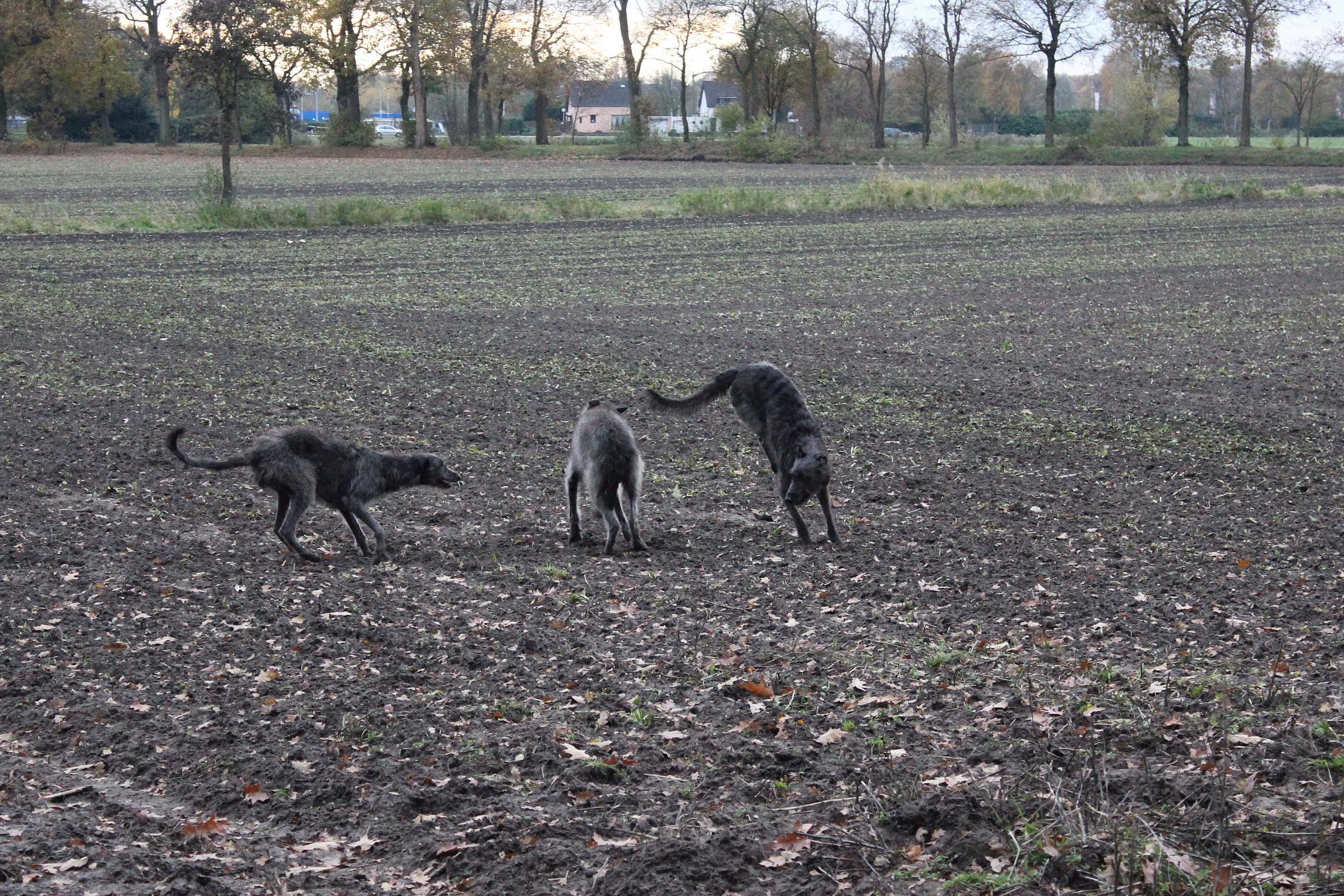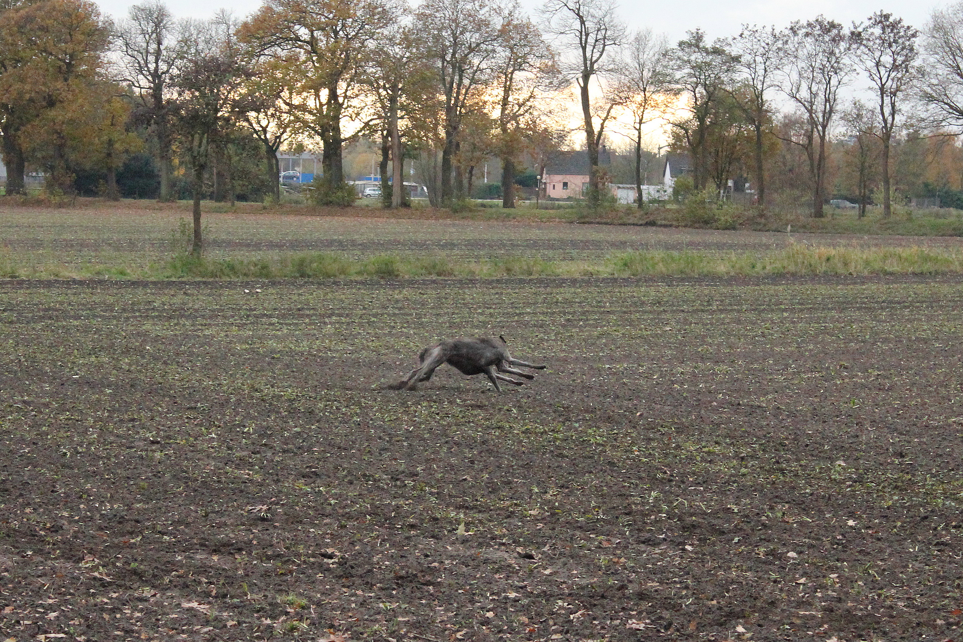 On Saturday we set out on a field in the woods of disk a small piece of coursing for Brandir, Bernice and Calhoun. Brandir started again perfectly and we also let him run with Bernice. I was afraid he was going to play but also this went fine! A very reassurance, as he will have to do this in the short term. Since Calhoun had seen that Simon had done the turning device in the car, he also had to walk a bit. It's incredible but since he's missing his hind leg he's so super motivated that you just can't refuse it! There seem to be a number of people who are struggling to make Calhoun do what he has done all his life. These people have no idea of Calhoun's mental and physical condition. He has no pain, is not sick, is in very good physical condition, he eats well, he drinks well, he is playful and he is cheerful. Since he has losgelopen from puppy in the most wild areas he knows exactly how to deal with his body, even now on three legs. The people who are worried can do this better to the hounds that appear with a very bad condition or crippled on the Coursingterreinen. As long as it goes well with Calhoun I let him do what he wants and for what he is born; Hunt.