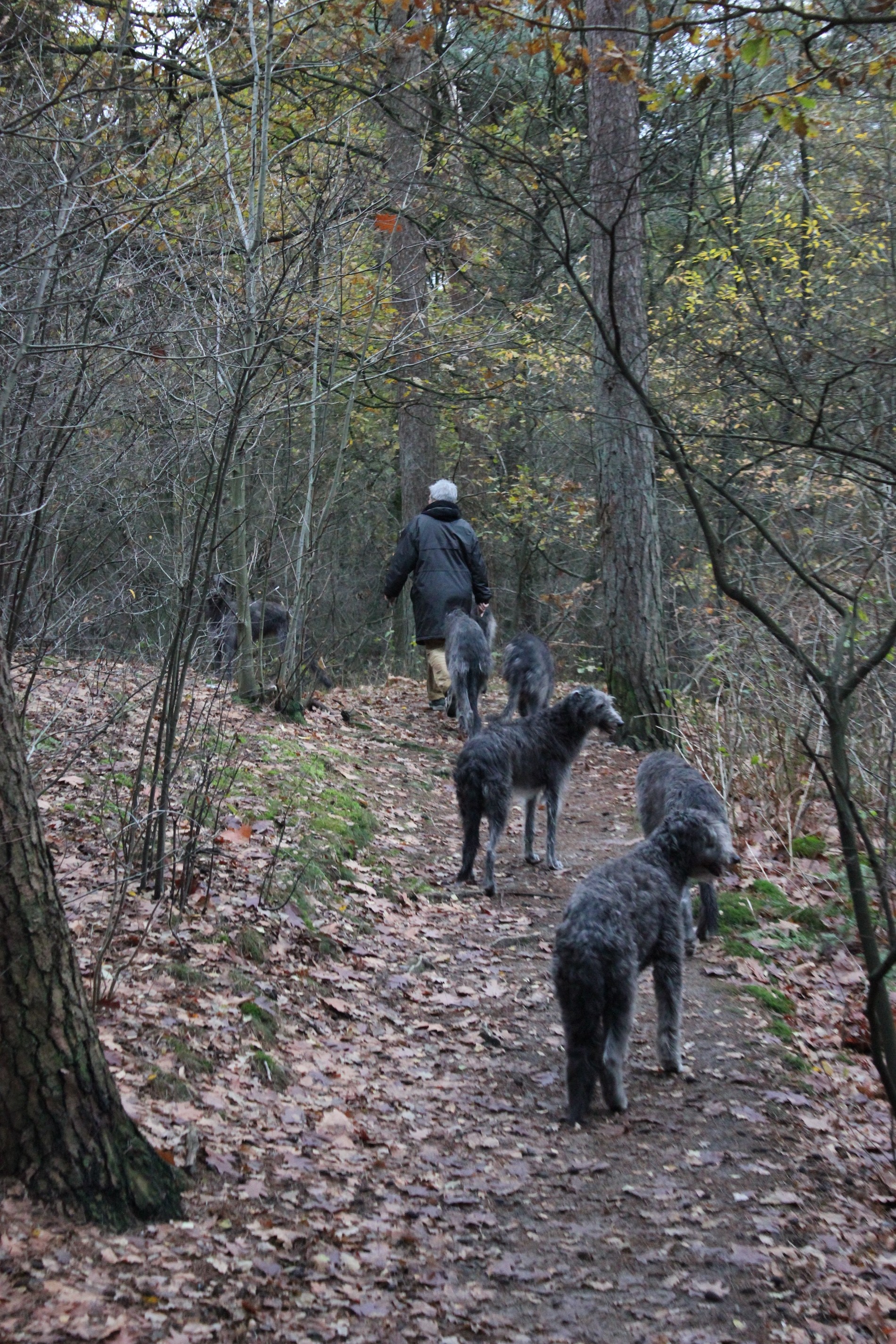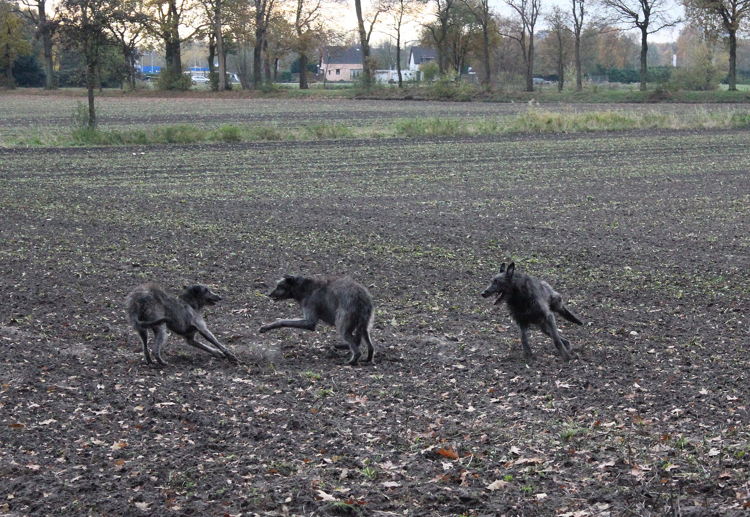 Haloween coursing in Landstuhl. On Sunday October 30th the Deerhounds would walk so on Saturday we could make another delicious forest walk. Grandma Amy had to fit on the caravan while we geklauterd two and a half hours over a gigantic steep mountain. Our muscles were in any case well trained once again! Also at Landstuhl the start of the course is on a field next to the racecourse. Then the hare passes through an opening of the fence of the racecourse the Middenterrein. If the hounds follow well totally no problem. After a round on the Middenterrein, the Hare enters the adjacent field by another opening in the fence. Some hounds are shooting the last opening, but they usually correct themselves and they come out well. On Sunday so 11 Deerhounds at the start. In The third course are Silva and Calhoun. Calhoun starts fine and runs fantastic. He lands with 80 points in a shared second place. In The fourth course is Cheytah with Chabibi's Nice. Nice is a very young, enthusiastic girl who follows well, Cheytah is pregnant and does not save in terms of speed. She thinks it is smart, but it passes the exit and loses the hare. She keeps looking and searching but does not think she should go through the opening. Nice get 83 points and Cheytah 47, fortunately no "rejection for the day"! In the next course Celina or Albainn of Gerd fuses and my Caintha. Now we have to be careful with the reception because Celina has already had a disqualification because of unheard-of behaviour. But I don't have to worry about it. Caintha runs very cleverly and is super fast, when she is near the exit she runs first and right behind the hare. Because of this she shoots the exit but sees in her canthus that the hare is right. She is not in doubt, plunges under the wire fencing of the track, takes a huge leap over the dense fence and lands on the little field where the hare continues his trail. Very spectacular! Unfortunately the jury is asleep, I think, because she got only 61 points. Celina apparently had only looked at Caintha, not the hare because he was still walking on the Middenterrein while Caintha made the kill. However, she still got 57 points. Jury…, I don't get anything from it (and that's good too!). In the second turn, Caintha again runs with Celina, even now Celina keeps up halfway and that gives her a "rejection for the day" on it. Calhoun starts with Cunamara's Mango by Eva Petzold. Mango flies off and Calhoun continues to stand. We still have the hope that he will be middenterreined by the exit, but that too does not happen. Also Calhoun gets a "rejection for the day". Cheytah is only classified and gets as a guided dog one that also remains. Cheytah is going to start well but at the first pass she remains standing. "Rejection for the day". Then you drive with two men, almost 2400 kilometers in front, to go back home with two "rejections for the day"!!! Fortunately, the eight and a half-year-old Caintha had saved the family a little. At the award ceremony, her last time was said goodbye, this was her last game. Caintha has always been a very reliable and excellent courser. [