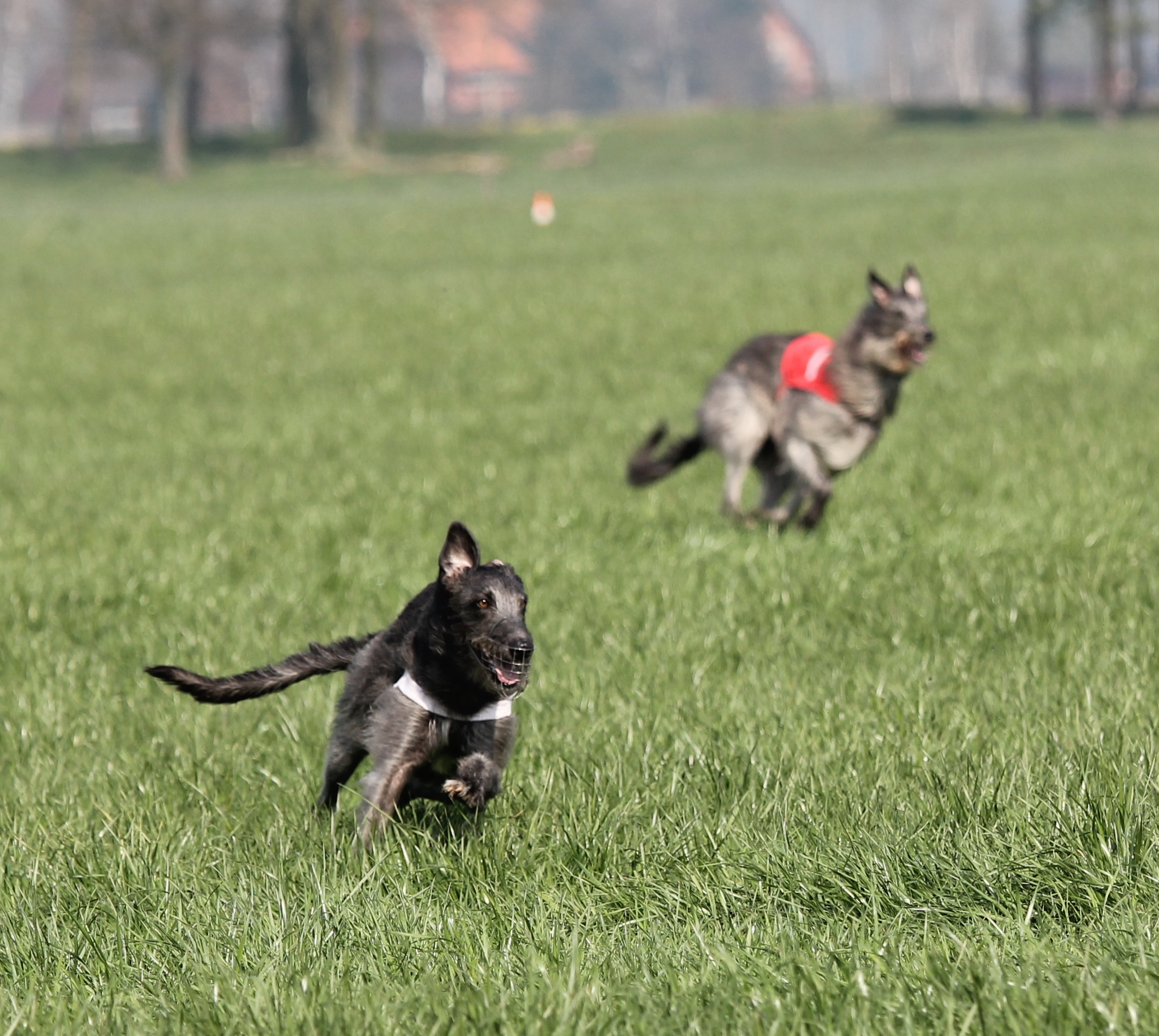April 9: International CACIL coursing in Axel. Fortunately 6 Deerhounds at the start. Calhoun wins his second CACIL! With this he would be my third international coursing champion. Cheytah becomes second with R. CACIL and the CACNL. Caintha lands in last place.