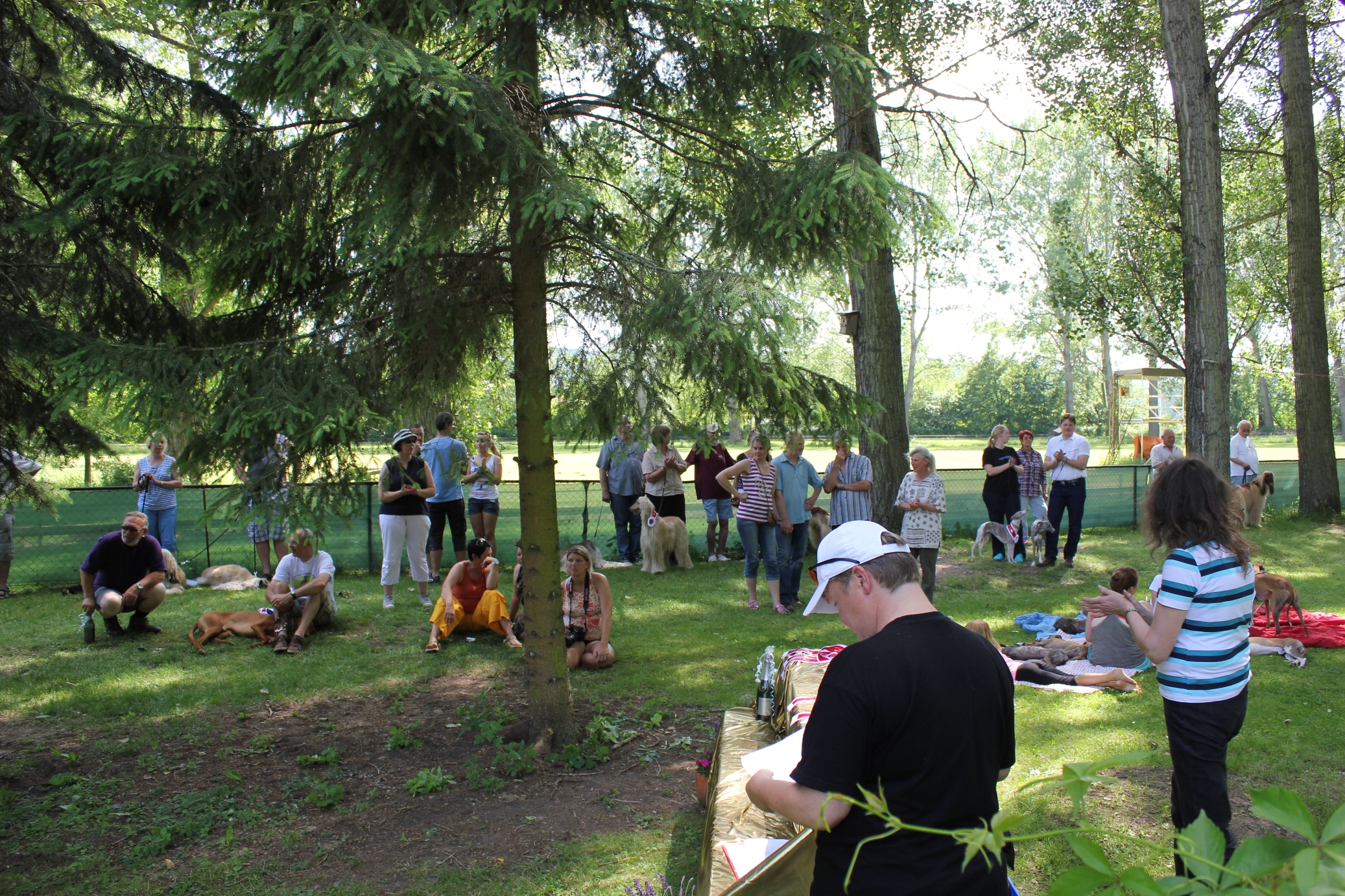 Day after a Leistungscoursing. Initially, the 30 Deerhounds were reported, but because of the many loopy bitches and the logoff of Brandir (he seems to have been quite bothered by Panostitis), in the end there remained, according to the catalogue, only 23, 4 males and 19 bitches. Started there are only 16 bitches. It was a somewhat bland trail, but because of the high grass and the soft bottom, the length of about 800 meters was enough to test the condition and what was the case with many hounds!