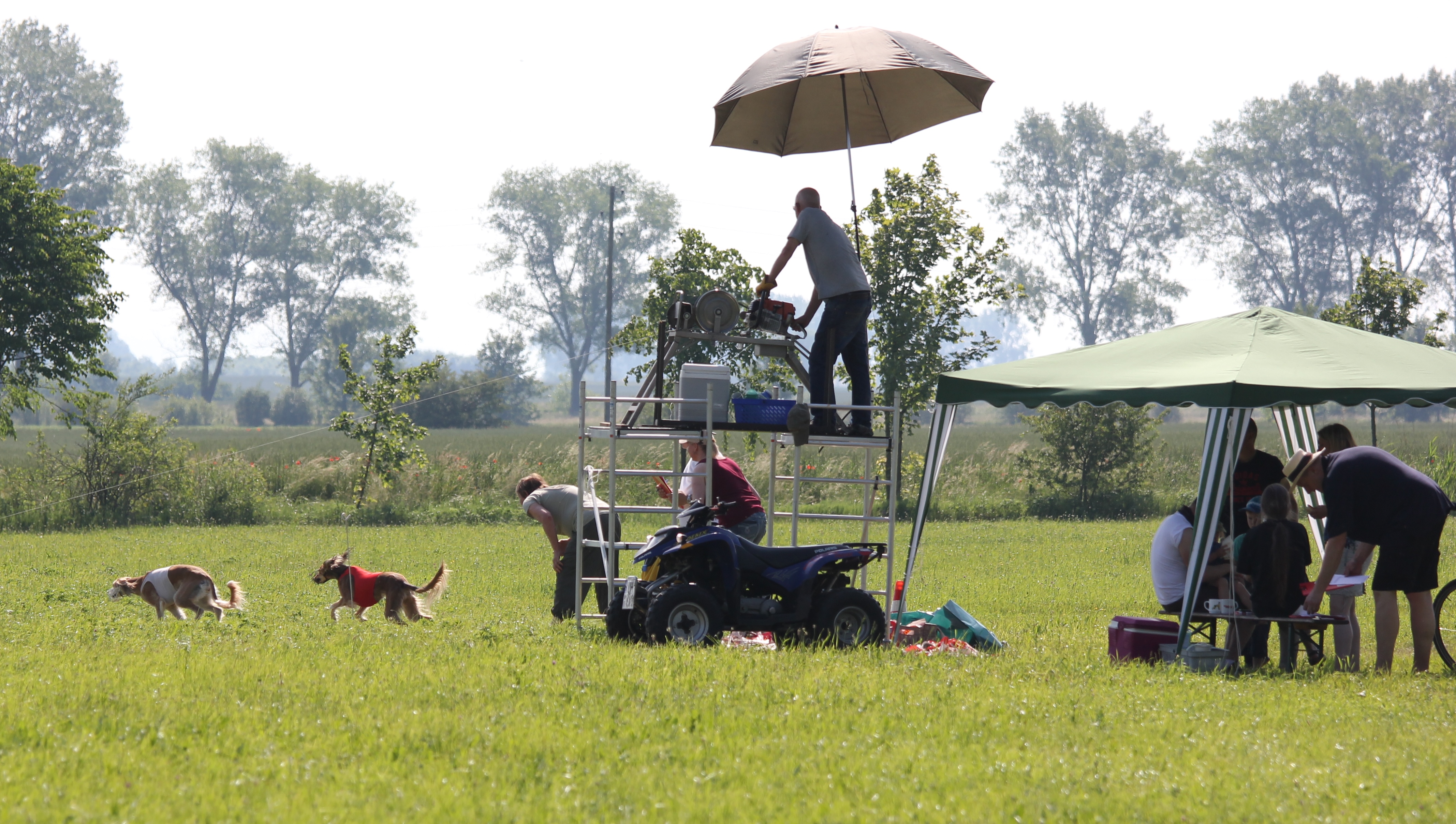 On Tuesday 3 June, beginning of the afternoon, we left towards Dortmund. Here we stayed at the camper pitch where Sonja and I always stand when we go to the show. It is a quiet place and you can enjoy walking with the hounds. At the same time we are already a thick 250 kilometer from home and thus almost half way to Tüttleben. It has now become a tradition that we are going to Tüttleben with Pentecost. Simon is classified by default to build and run the course before and during the coursing and I had promised this year to act as ringmaster on Saturday 7 June in the ring at the Jahresausstellung of Group 5. Given the experience of last year, that the Coursingterrein was not cut and totally under water, we decided to be there on Wednesday so that Simon had no stress and time to come, had all the time to put away a good route. The terrain was beautiful, grass not too high but also no billiard sheet, Simon was very quick to finish his trail. He had placed the start this time in the middle of the terrain and only the left part was put into use. There was a challenging trail of about 850 meters long, given the expected temperatures, long enough. On Wednesday it was still good to do in terms of temperature; We even made a big walk with the hounds. The rest of the days we could forget this, it was too hot. Calhoun soon searched for his spot; Under the caravan. Every hour he moved a bit further so he had a cool piece again. It is always miraculous how he saves himself with those thre